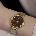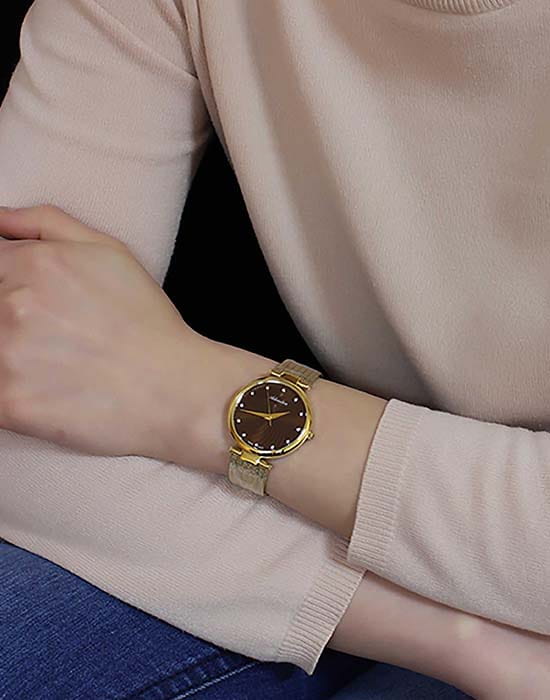 Часы Adriatica A3689.114GQ воплощают в себе утонченную элегантность и безупречное швейцарское качество, создавая идеальный аксессуар для женщин, ценящих стиль и надежность. Изящный корпус и безельБезельВнешний ободок, закрепляющий стекло. В спортивных часах так называется поворотное кольцо с делениями на циферблате, выполняет роль таймера – замеряет отрезки времени на шкале. Неподвижный безель – элемент декора. Однонаправленно вращающийся безель на дайверских часах позволяет фиксировать моменты погружения и выныривания на поверхность. из нержавеющей стали с PVDPVDУльтратонкое покрытие наносится в технике вакуумного напыления, сочетает в себе нитрид титана особой прочности со слоем золота или оксида хрома. Несёт в себе декоративную или защитную функцию. покрытием, что гарантирует долговечность и устойчивость к износу. Минеральное стеклоМинеральное стеклоМинеральное стекло представляет собой искусственно выращенный минерал кварца. Такое стекло отличается особой устойчивостью к повреждениям и царапинам. Уступает по некоторым качествам сапфировому стеклу. надежно защищает циферблат, а точный кварцевый механизм с калибром RONDA 763 обеспечивает стабильность хода. Часы обладают водозащитой WR 30 (3 ATM), что делает их устойчивыми к случайным брызгам и позволяет носить их в любых условиях. Браслет из нержавеющей стали с золотистым PVDPVDУльтратонкое покрытие наносится в технике вакуумного напыления, сочетает в себе нитрид титана особой прочности со слоем золота или оксида хрома. Несёт в себе декоративную или защитную функцию. покрытием из миланского плетения с раскладным замкомРаскладной замокДанный вариант застежки используется только на часах с металлическим браслетом. Отличительная особенность такого крепления в том, что длина браслета становится универсальной и вы можете самостоятельно отрегулировать нужный вам размер – застежка просто двигается по браслету часов., что придает часам современный вид и обеспечивает комфортное прилегание к запястью. Декоративные элементы с фианитами добавляют блеска и утонченности этому аксессуару. С весом всего 45 г, часы почти неощутимы на руке, обеспечивая комфорт на протяжении всего дня.