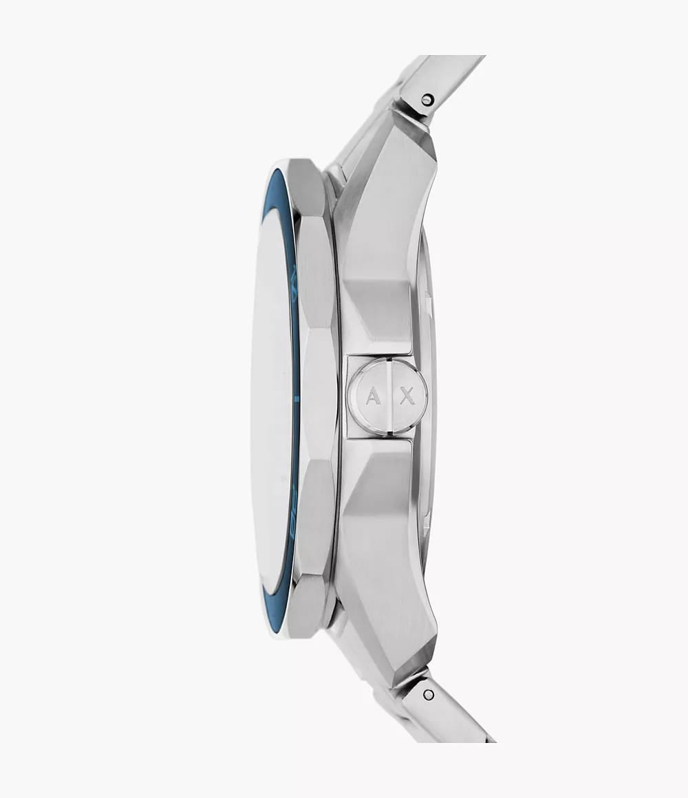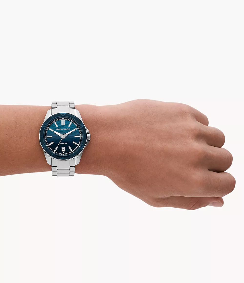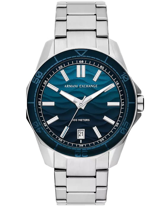 Мужские наручные часы с минеральным стекломМинеральное стеклоМинеральное стекло представляет собой искусственно выращенный минерал кварца. Такое стекло отличается особой устойчивостью к повреждениям и царапинам. Уступает по некоторым качествам сапфировому стеклу. Armani Exchange Dante AX1950, кварцевый механизм с высокой точностью. Класс водозащиты: 100 метров, позволит плавать, нырять и заниматься другими водными видами спорта. Корпус часов изготовлен из стали. Стальной браслет на раскладной застёжкеРаскладная застёжкаТакой тип застёжки используется только на браслетах из металла. Она никогда не раскрывается полностью, происходит разделение на 2 и более частей. Раскладывающая застёжка снизит вероятность потери часов к минимуму.. Вращающийся безельБезельВнешний ободок, закрепляющий стекло. В спортивных часах так называется поворотное кольцо с делениями на циферблате, выполняет роль таймера – замеряет отрезки времени на шкале. Неподвижный безель – элемент декора. Однонаправленно вращающийся безель на дайверских часах позволяет фиксировать моменты погружения и выныривания на поверхность. с IP-покрытиемIP-покрытиеМетод ионного напыления. Демонстрирует повышенную устойчивость к истиранию, окислению и химическим веществам. Под воздействием высокого давления и температуры около 1500°C молекулы металла надёжно соединяются с частицами корпуса часов.. Текстурированный циферблат с метками в виде штрихов. Окошко даты находится в положении 6 часов.