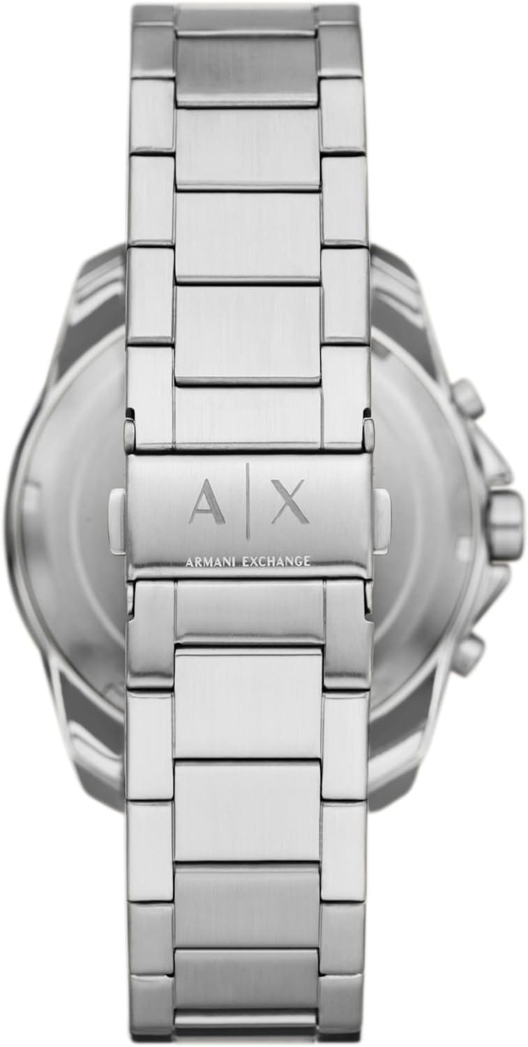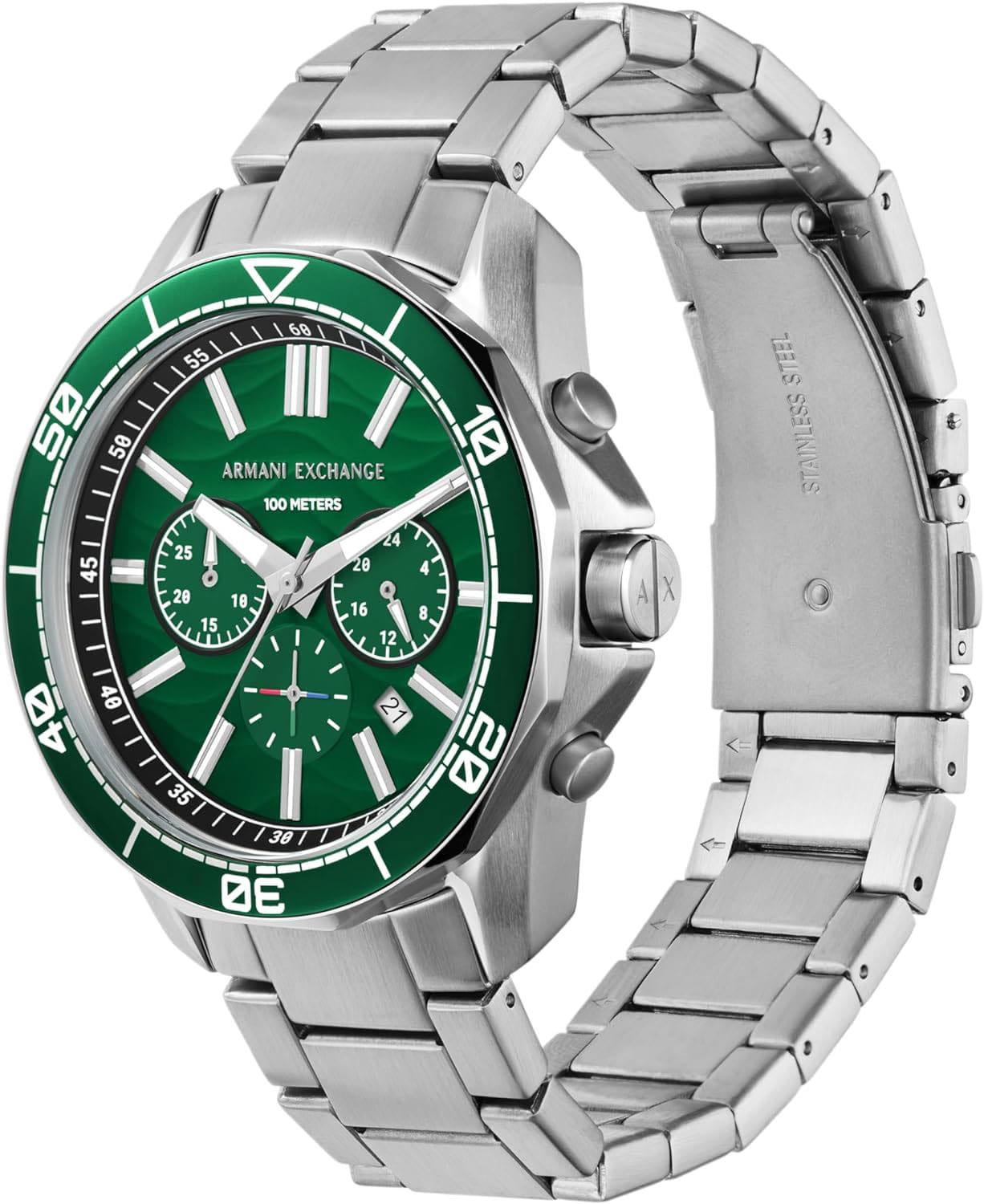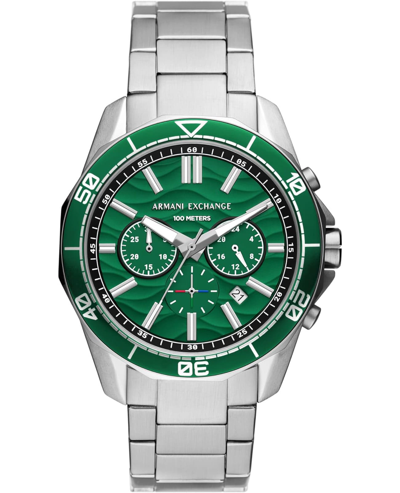 Мужские наручные часы хронографХронографФункция позволяет измерять отрезки времени с особой точностью: часы, минуты, секунды. Верным признаком хронографа является наличие на циферблате 3 дополнительных окошек-счётчиков. с минеральным стекломМинеральное стеклоМинеральное стекло представляет собой искусственно выращенный минерал кварца. Такое стекло отличается особой устойчивостью к повреждениям и царапинам. Уступает по некоторым качествам сапфировому стеклу. Armani Exchange Dante AX1957, кварцевый механизм с высокой точностью. Класс водозащиты: 100 метров, позволит плавать, нырять и заниматься другими водными видами спорта. Корпус часов изготовлен из нержавеющей стали. Стальной браслет на раскладной застёжкеРаскладная застёжкаТакой тип застёжки используется только на браслетах из металла. Она никогда не раскрывается полностью, происходит разделение на 2 и более частей. Раскладывающая застёжка снизит вероятность потери часов к минимуму.. Вращающийся безельБезельВнешний ободок, закрепляющий стекло. В спортивных часах так называется поворотное кольцо с делениями на циферблате, выполняет роль таймера – замеряет отрезки времени на шкале. Неподвижный безель – элемент декора. Однонаправленно вращающийся безель на дайверских часах позволяет фиксировать моменты погружения и выныривания на поверхность.. Текстурированный циферблат с метками в виде штрихов.