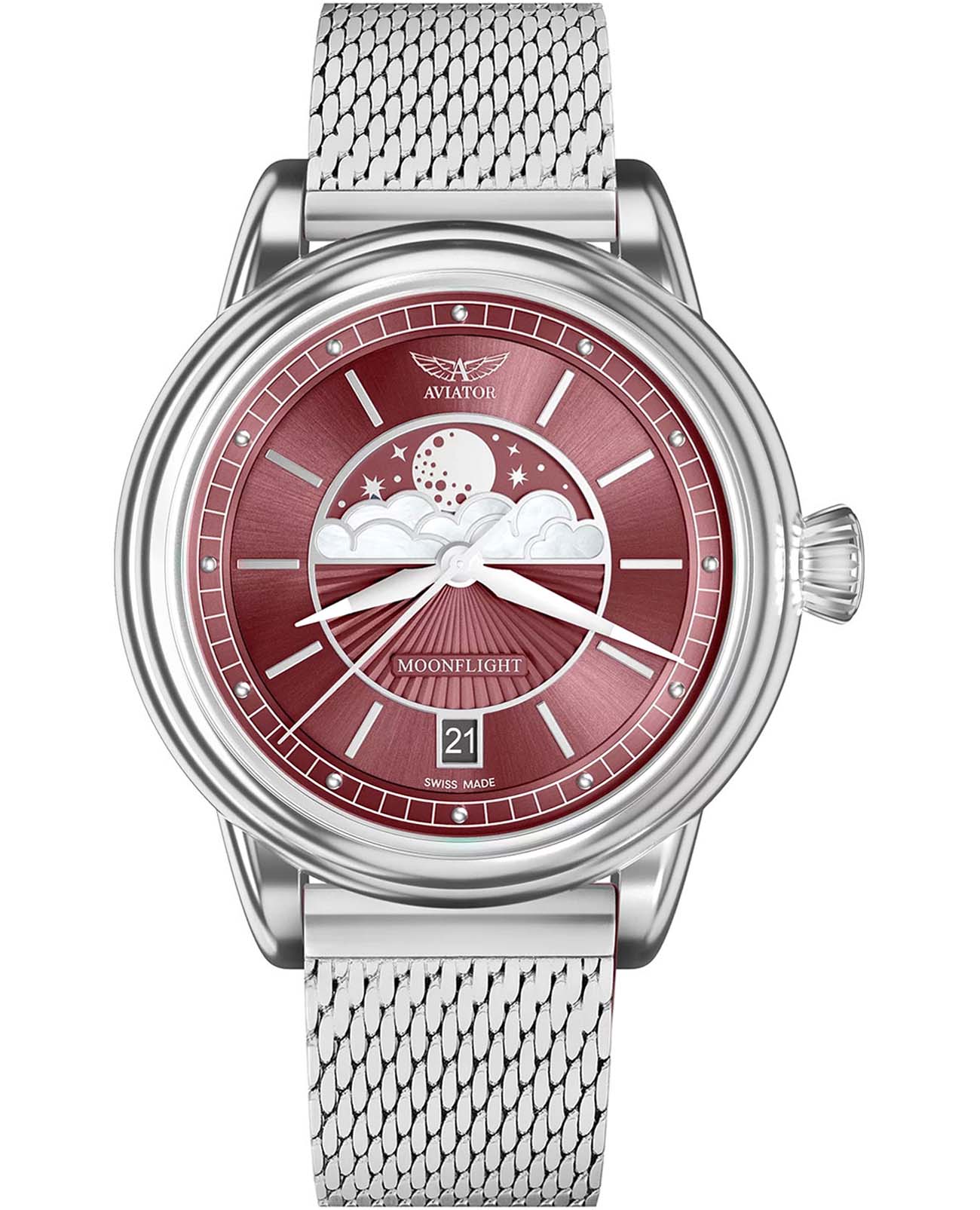 Aviator Douglas MoonFlight V.1.33.0.264.5 — элегантные дамские швейцарские часы с утончённой авиационной эстетикой. Корпус 36 мм из нержавеющей стали 316L обладает компактными пропорциями и удобным профилем. Циферблат в стиле Art Deco украшает усложнение фаз Луны в верхней половине, обрамлённой тонким кольцом облаков. Отмечено окно даты в положении «6 часов». Стрелки обработаны люминесцентным покрытиемЛюминесцентное покрытиеПозволяет считывать показания времени в темноте. Производители наносят на стрелки, часовые индексы, безель или поверхность циферблата светонакопительный состав, дающий холодное свечение. Superluminova — для уверенного считывания в темноте. Поверхность защищена сапфировым стекломСапфировое стеклоПрочный и надёжный материал из кристалла сапфира синтетического происхождения, характеризующийся особой твёрдостью и устойчивостью к царапинам и повреждениям. с антибликовым покрытиемАнтибликовое покрытиеСлой оксида металла в 0,13-0,3 микрон, благодаря которому стекло часов не бликует и не отражает свет. Антибликовое покрытие уменьшает отражение света в 10 раз, обеспечивая отличную читаемость показателей циферблата.. Сердце модели — швейцарский кварцевый механизм Ronda 708 с функцией отображения лунных фаз, 13 рубинами и возможностью работать до 54 месяцев без замены батареи. Завинчивающаяся задняя крышка с гравировкой Douglas DC-3 и герметичность до 100 метров создают надёжную основу для эксплуатации. Стальной браслет миланского плетения на раскладном замкеРаскладной замокДанный вариант застежки используется только на часах с металлическим браслетом. Отличительная особенность такого крепления в том, что длина браслета становится универсальной и вы можете самостоятельно отрегулировать нужный вам размер – застежка просто двигается по браслету часов., сочетая комфорт, элегантность и практичность. Лимитированная серия - 950 экземпляров. Aviator Douglas MoonFlight — это гармоничное сочетание авиационного наследия, женской элегантности и технической изысканности, воплощённое в элегантном и функциональном аксессуаре.