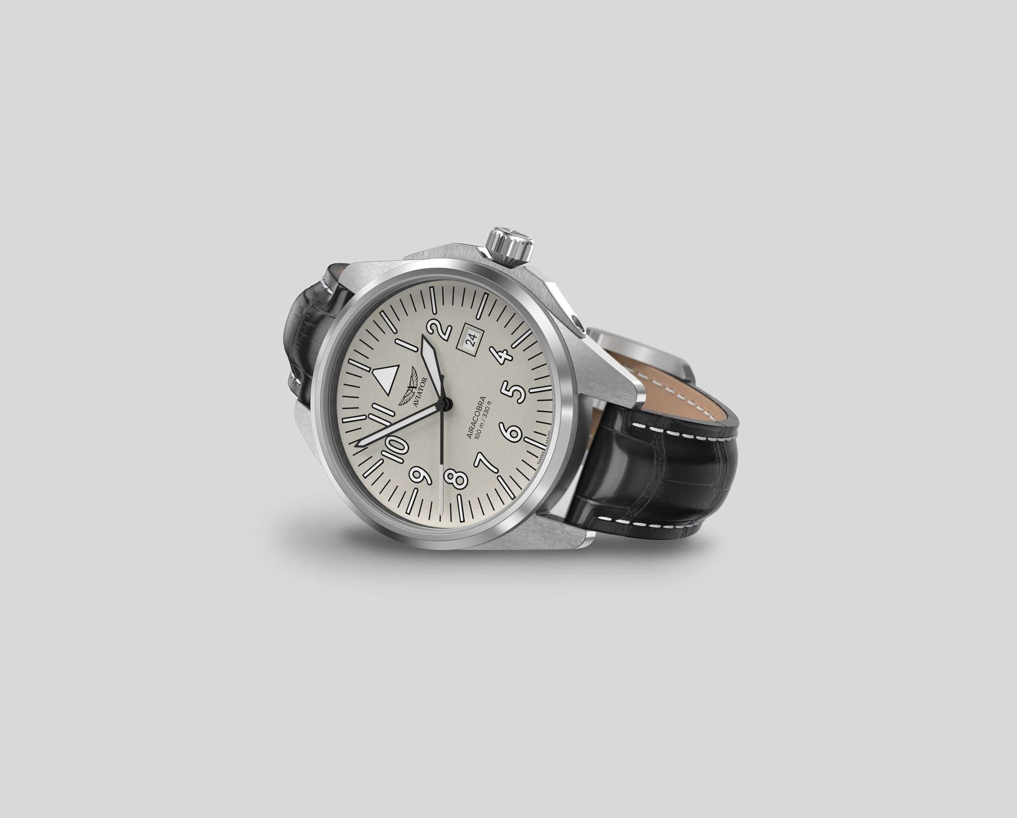Aviator V.1.38.0.320.4 “Airacobra 43 Type A” — надёжные швейцарские пилотские часы с насыщенным функционалом и строгим авиационным дизайном. Корпус диаметром 42,8 мм выполнен из нержавеющей стали.