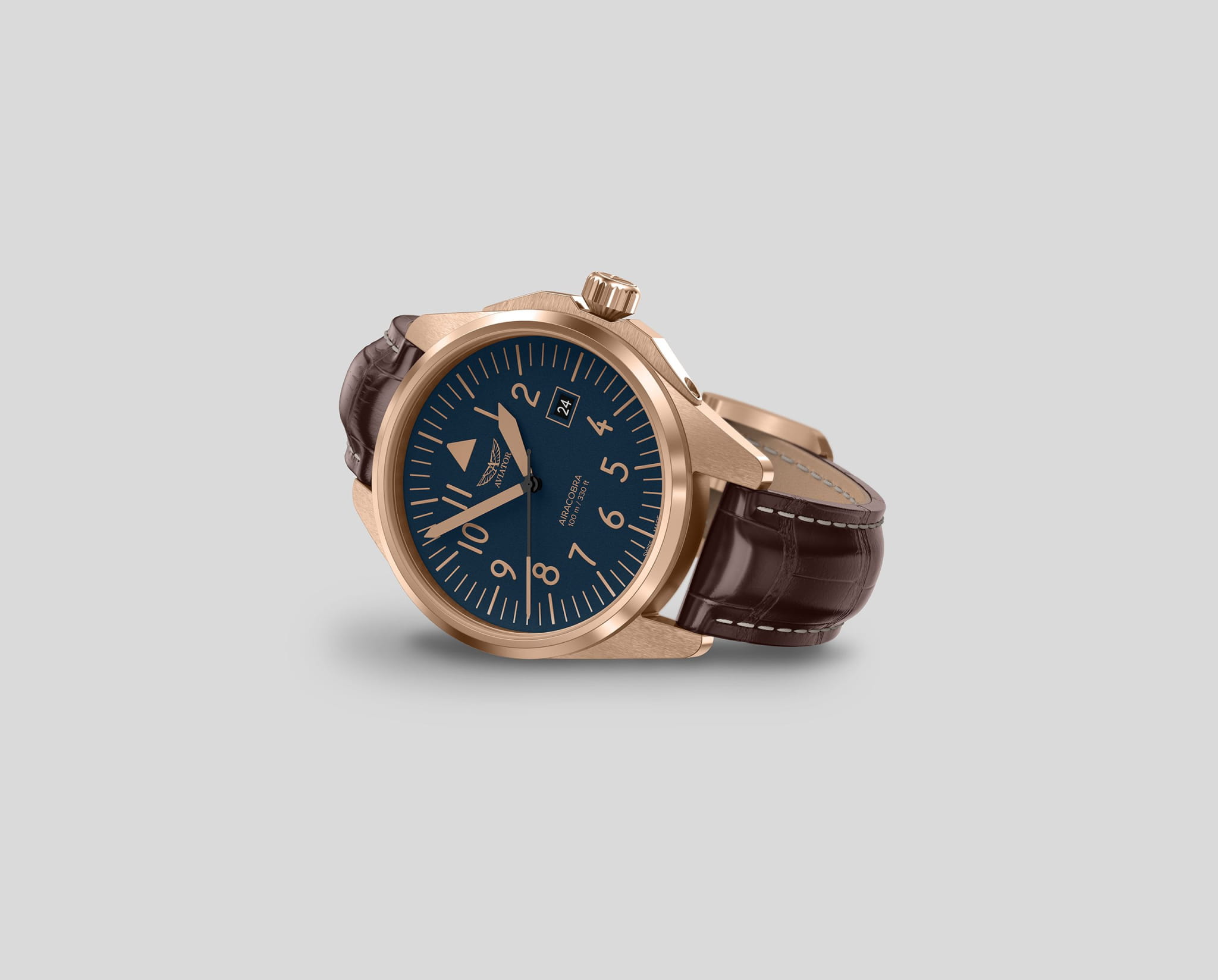 Aviator Airacobra 43 Type A V.1.38.2.318.4 — надёжные швейцарские пилотские часы с насыщенным функционалом и строгим авиационным дизайном. Корпус диаметром 42,8 мм выполнен из нержавеющей стали 316L с PVD-покрытиемPVDУльтратонкое покрытие наносится в технике вакуумного напыления, сочетает в себе нитрид титана особой прочности со слоем золота или оксида хрома. Несёт в себе декоративную или защитную функцию.. Циферблат имеет крупные арабские цифры и жёсткий контраст, соответствующий классическим пилотским образцам. Стрелки и метки покрыты люминесцентным покрытиемЛюминесцентное покрытиеПозволяет считывать показания времени в темноте. Производители наносят на стрелки, часовые индексы, безель или поверхность циферблата светонакопительный состав, дающий холодное свечение. Superluminova — это обеспечивает отличную читаемость в любых условиях. Окошко даты расположено у отметки «3 часа». На борту установлен швейцарский кварцевый механизм, способный с высокой точностью отображать время, дату. Циферблат защищён стойким сапфировым стекломСапфировое стеклоПрочный и надёжный материал из кристалла сапфира синтетического происхождения, характеризующийся особой твёрдостью и устойчивостью к царапинам и повреждениям. с антибликовым покрытиемАнтибликовое покрытиеСлой оксида металла в 0,13-0,3 микрон, благодаря которому стекло часов не бликует и не отражает свет. Антибликовое покрытие уменьшает отражение света в 10 раз, обеспечивая отличную читаемость показателей циферблата., завинчивающаяся заводная головка и задняя крышка обеспечивают уровень водозащиты до 100 метров. Кожаный ремень со стандартной застежкой обеспечивает удобство и надёжную фиксацию. Airacobra 43 Type A — инструментальные пилотские часы для тех, кто ценит надёжность, точность и удобную функциональность второго часового пояса в эстетике классических авиационных хронометров. Лимитированная серия.