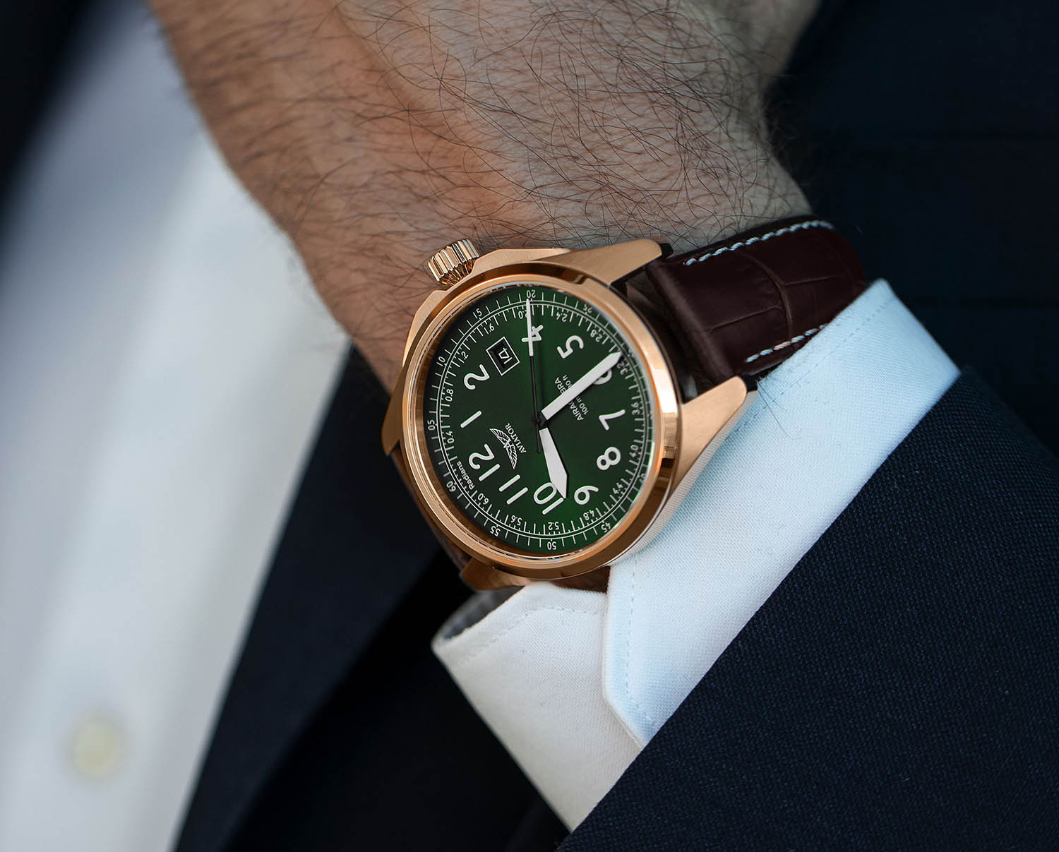 Aviator Airacobra 43 Type B V.1.38.2.324.4 — надёжные швейцарские пилотские часы с насыщенным функционалом и строгим авиационным дизайном. Корпус диаметром 42,8 мм выполнен из нержавеющей стали 316L с PVD-покрытиемPVDУльтратонкое покрытие наносится в технике вакуумного напыления, сочетает в себе нитрид титана особой прочности со слоем золота или оксида хрома. Несёт в себе декоративную или защитную функцию.. Циферблат имеет крупные арабские цифры и жёсткий контраст, соответствующий классическим пилотским образцам. Стрелки и метки покрыты люминесцентным покрытиемЛюминесцентное покрытиеПозволяет считывать показания времени в темноте. Производители наносят на стрелки, часовые индексы, безель или поверхность циферблата светонакопительный состав, дающий холодное свечение. Superluminova — это обеспечивает отличную читаемость в любых условиях. Окошко даты расположено у отметки «3 часа». На борту установлен швейцарский кварцевый механизм, способный с высокой точностью отображать время, дату. Циферблат защищён стойким сапфировым стекломСапфировое стеклоПрочный и надёжный материал из кристалла сапфира синтетического происхождения, характеризующийся особой твёрдостью и устойчивостью к царапинам и повреждениям. с антибликовым покрытиемАнтибликовое покрытиеСлой оксида металла в 0,13-0,3 микрон, благодаря которому стекло часов не бликует и не отражает свет. Антибликовое покрытие уменьшает отражение света в 10 раз, обеспечивая отличную читаемость показателей циферблата., завинчивающаяся заводная головка и задняя крышка обеспечивают уровень водозащиты до 100 метров. Кожаный ремень со стандартной застежкой обеспечивает удобство и надёжную фиксацию. Airacobra 43 Type B — инструментальные пилотские часы для тех, кто ценит надёжность, точность и удобную функциональность второго часового пояса в эстетике классических авиационных хронометров. Лимитированная серия.