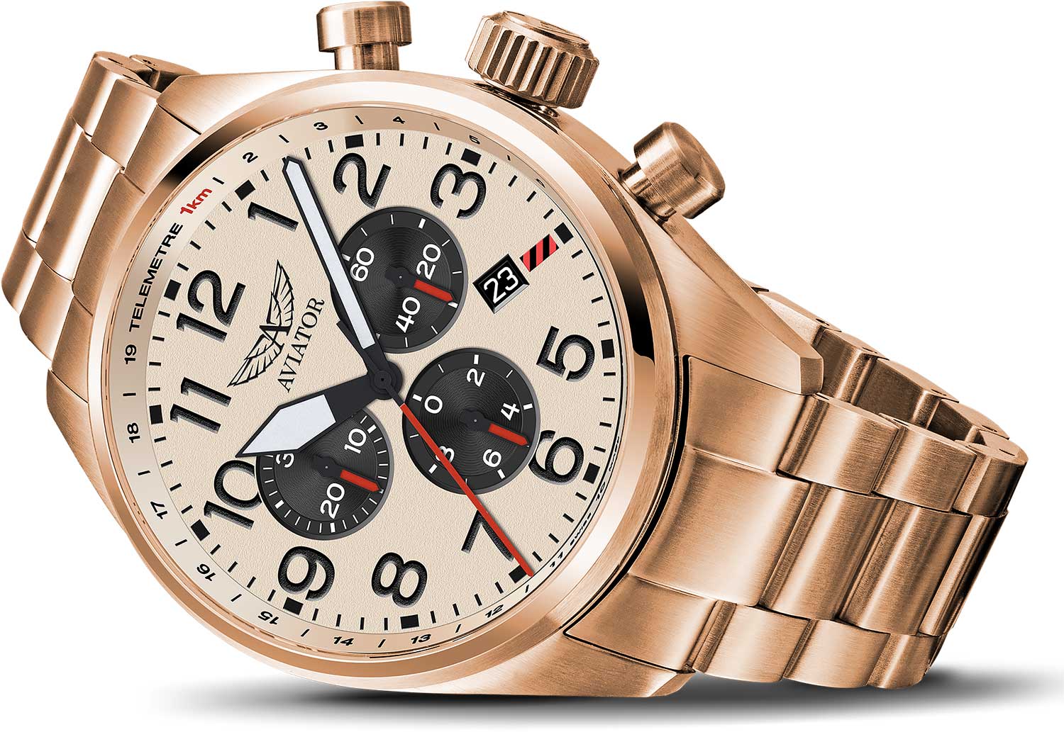 Циферблат оформлен в классическом aviator-стиле: крупные арабские цифры, широкие стрелки и чёткое деление минут позволяют считывать время мгновенно. Стрелки и метки покрыты люминесцентным покрытиемЛюминесцентное покрытиеПозволяет считывать показания времени в темноте. Производители наносят на стрелки, часовые индексы, безель или поверхность циферблата светонакопительный состав, дающий холодное свечение. для отличной читаемости при слабом освещении.