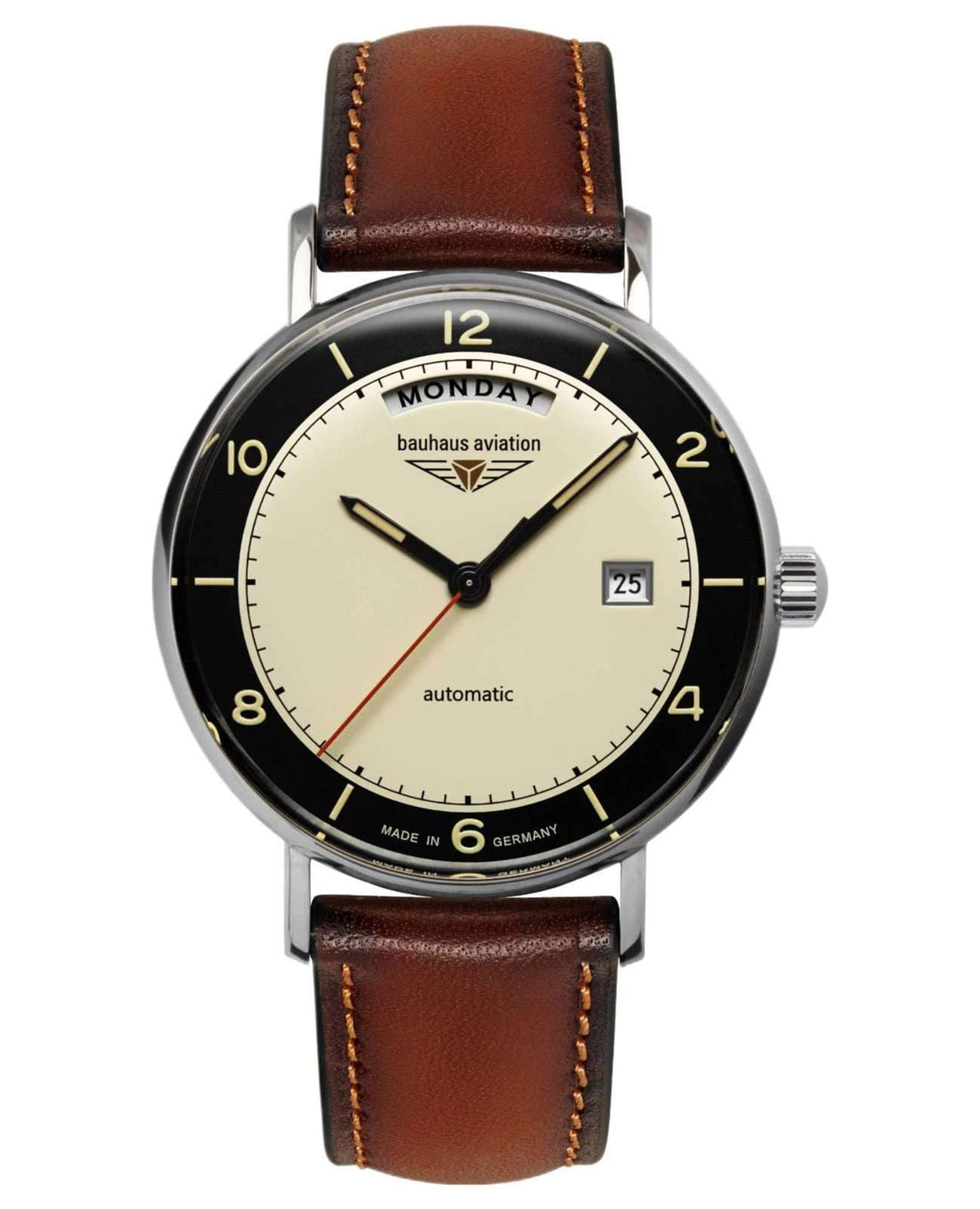 Мужские механические часы с автоподзаводом Bauhaus — это аксессуар с винтажным пилотским стилем. Корпус диаметром 41 мм и толщиной 12 мм выполнен из нержавеющей стали. Циферблат бежевого цвета оформлен арабскими цифрами и стрелками. Окошко даты расположено в положении 3 часов. Стрелки и метки с люминесцентным покрытиемЛюминесцентное покрытиеПозволяет считывать показания времени в темноте. Производители наносят на стрелки, часовые индексы, безель или поверхность циферблата светонакопительный состав, дающий холодное свечение., обеспечивающим хорошую читаемость в темноте. Циферблат защищён прочным минеральным стекломМинеральное стеклоМинеральное стекло представляет собой искусственно выращенный минерал кварца. Такое стекло отличается особой устойчивостью к повреждениям и царапинам. Уступает по некоторым качествам сапфировому стеклу. K1. Часы оснащены коричневым кожаным ремешком на классической пряжке. Водонепроницаемость 50 м позволяет использовать часы в повседневных условиях. Идеальный выбор для тех, кто ценит немецкое качество и ретро-стиль.