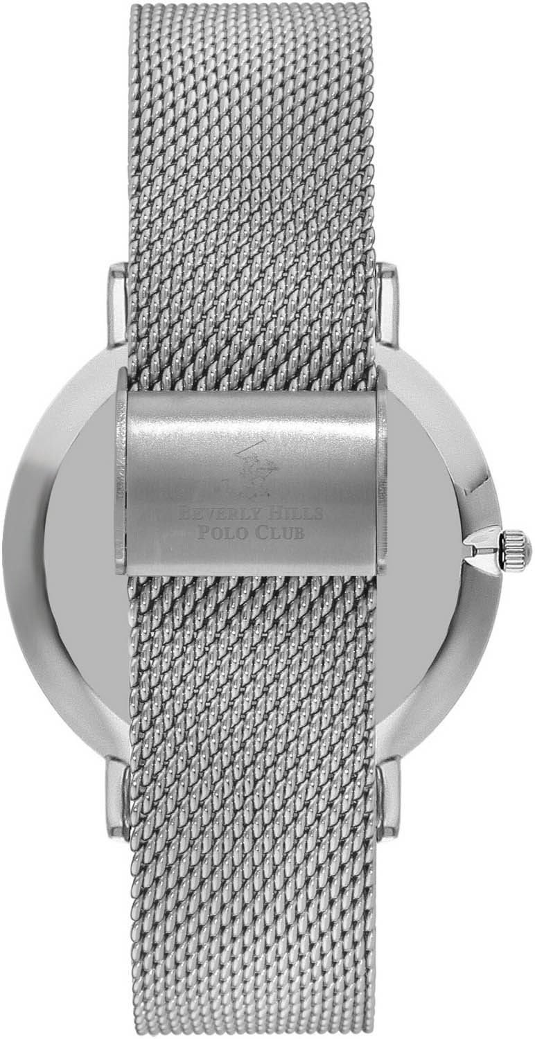 Американские мужские часы с минеральным стекломМинеральное стеклоМинеральное стекло представляет собой искусственно выращенный минерал кварца. Такое стекло отличается особой устойчивостью к повреждениям и царапинам. Уступает по некоторым качествам сапфировому стеклу. Beverly Hills Polo Club BP3321X.390, кварцевый механизм с высокой точностью. Класс водозащиты: 50 метров, позволит защитить корпус от случайных брызг и капель дождя. Стальной корпус. Браслет на раскладной застёжкеРаскладная застёжкаТакой тип застёжки используется только на браслетах из металла. Она никогда не раскрывается полностью, происходит разделение на 2 и более частей. Раскладывающая застёжка снизит вероятность потери часов к минимуму..