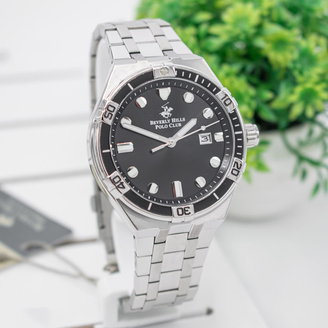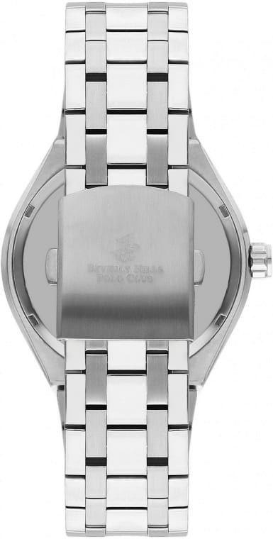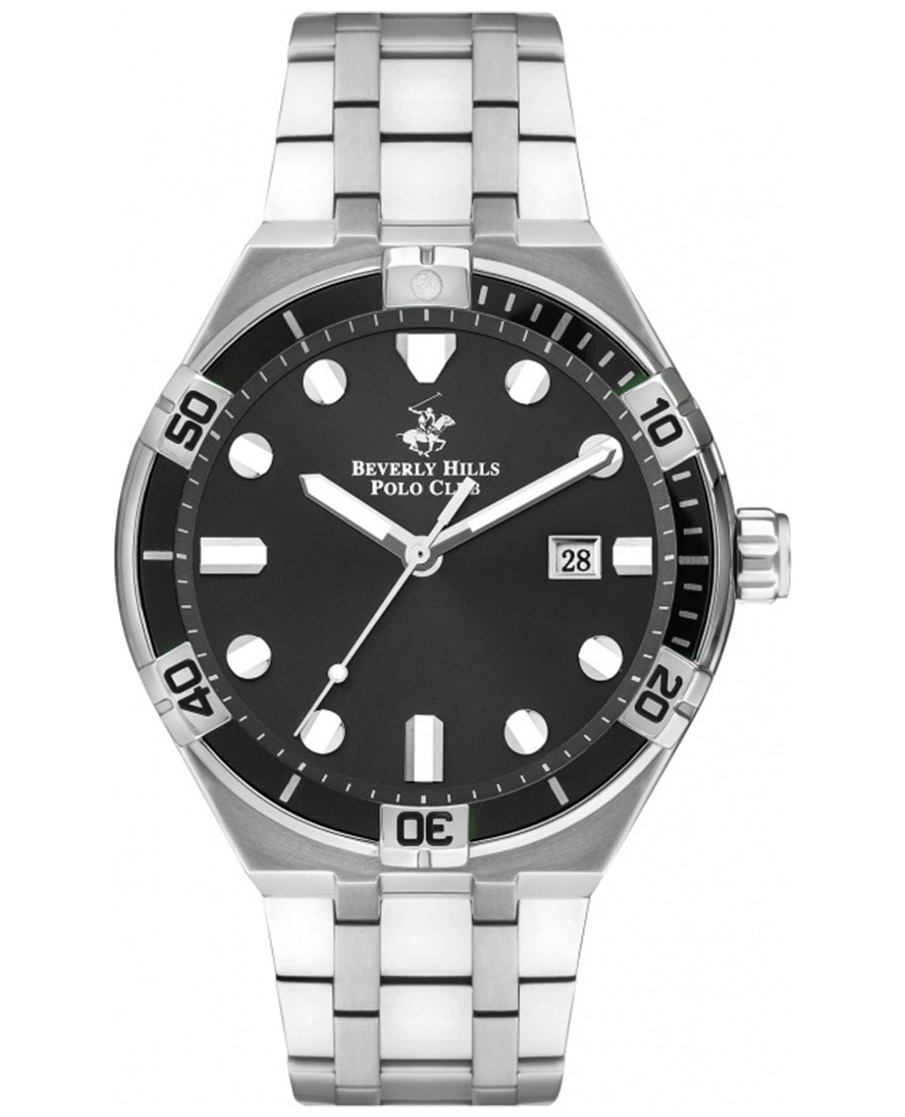 Американские мужские часы Beverly Hills Polo Club BP3404X.350 с минеральным стекломМинеральное стеклоМинеральное стекло представляет собой искусственно выращенный минерал кварца. Такое стекло отличается особой устойчивостью к повреждениям и царапинам. Уступает по некоторым качествам сапфировому стеклу., кварцевый механизм с высокой точностью. Класс водозащиты: 100 метров, позволит защитить корпус от случайных брызг или капель дождя. Корпус часов изготовлен из стали. Стальной браслет с раскладной застёжкойРаскладная застёжкаТакой тип застёжки используется только на браслетах из металла. Она никогда не раскрывается полностью, происходит разделение на 2 и более частей. Раскладывающая застёжка снизит вероятность потери часов к минимуму.. Стрелки и метки с люминесцентным покрытиемЛюминесцентное покрытиеПозволяет считывать показания времени в темноте. Производители наносят на стрелки, часовые индексы, безель или поверхность циферблата светонакопительный состав, дающий холодное свечение.. Окошко даты находится в положении 3 часа. БезельБезельВнешний ободок, закрепляющий стекло. В спортивных часах так называется поворотное кольцо с делениями на циферблате, выполняет роль таймера – замеряет отрезки времени на шкале. Неподвижный безель – элемент декора. Однонаправленно вращающийся безель на дайверских часах позволяет фиксировать моменты погружения и выныривания на поверхность. с PVD-покрытиемPVDУльтратонкое покрытие наносится в технике вакуумного напыления, сочетает в себе нитрид титана особой прочности со слоем золота или оксида хрома. Несёт в себе декоративную или защитную функцию..