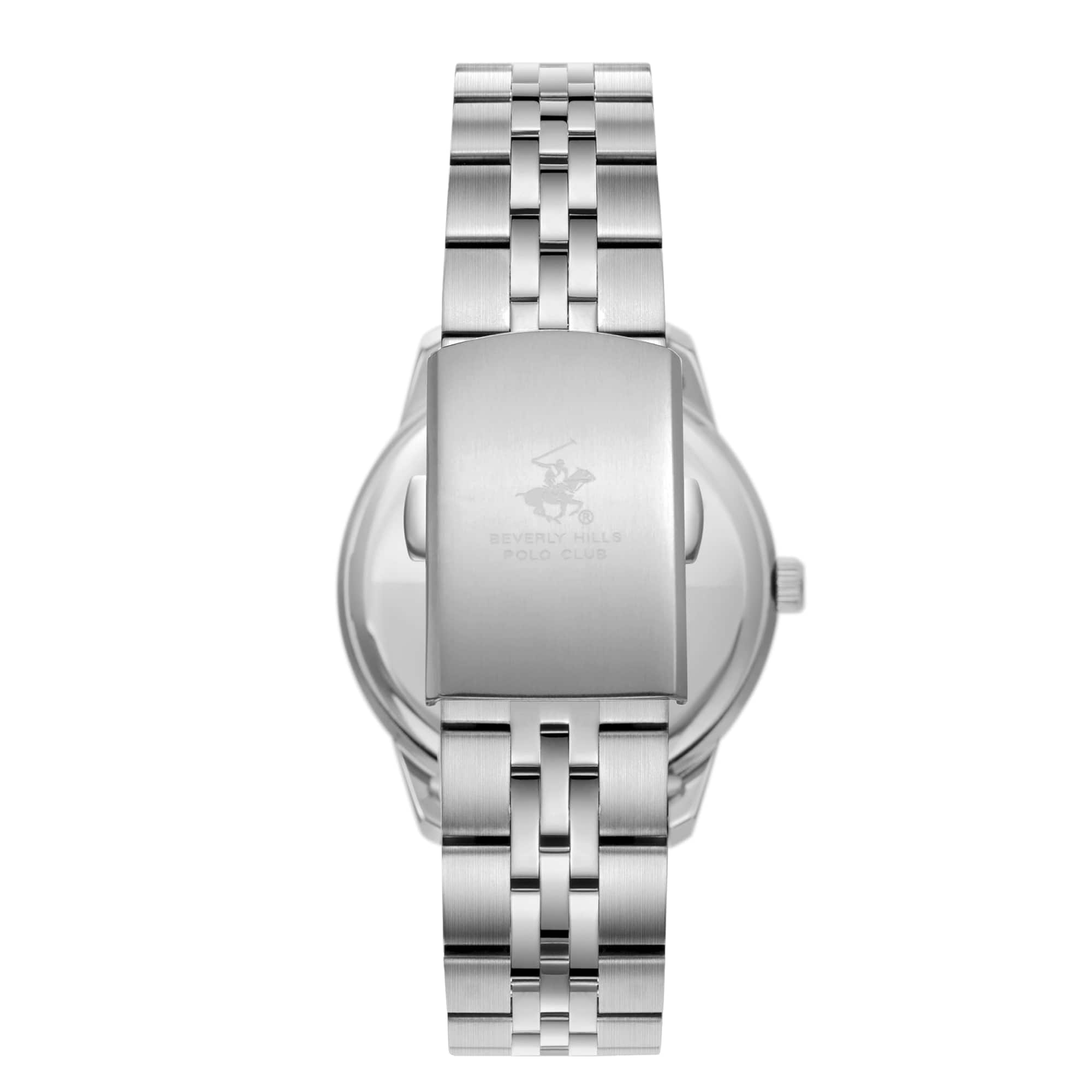 Beverly Hills Polo Club BP3705C.370 – элегантные женские часы, сочетающие стильный дизайн и высокую функциональность. Корпус диаметром 36 мм выполнен из суперметалла, обеспечивающего прочность и долговечность. Циферблат украшен, и защищён минеральным стекломМинеральное стеклоМинеральное стекло представляет собой искусственно выращенный минерал кварца. Такое стекло отличается особой устойчивостью к повреждениям и царапинам. Уступает по некоторым качествам сапфировому стеклу., устойчивым к царапинам. Часы оснащены точным кварцевым механизмом, гарантирующим надёжное отображение времени. Браслет из нержавеющей стали на раскладной застёжкеРаскладная застёжкаТакой тип застёжки используется только на браслетах из металла. Она никогда не раскрывается полностью, происходит разделение на 2 и более частей. Раскладывающая застёжка снизит вероятность потери часов к минимуму., обеспечивающей комфортное ношение и надёжную фиксацию на запястье. Водозащита до 50 метров (5 ATM) позволяет использовать часы в повседневной жизни, включая кратковременное погружение в воду.