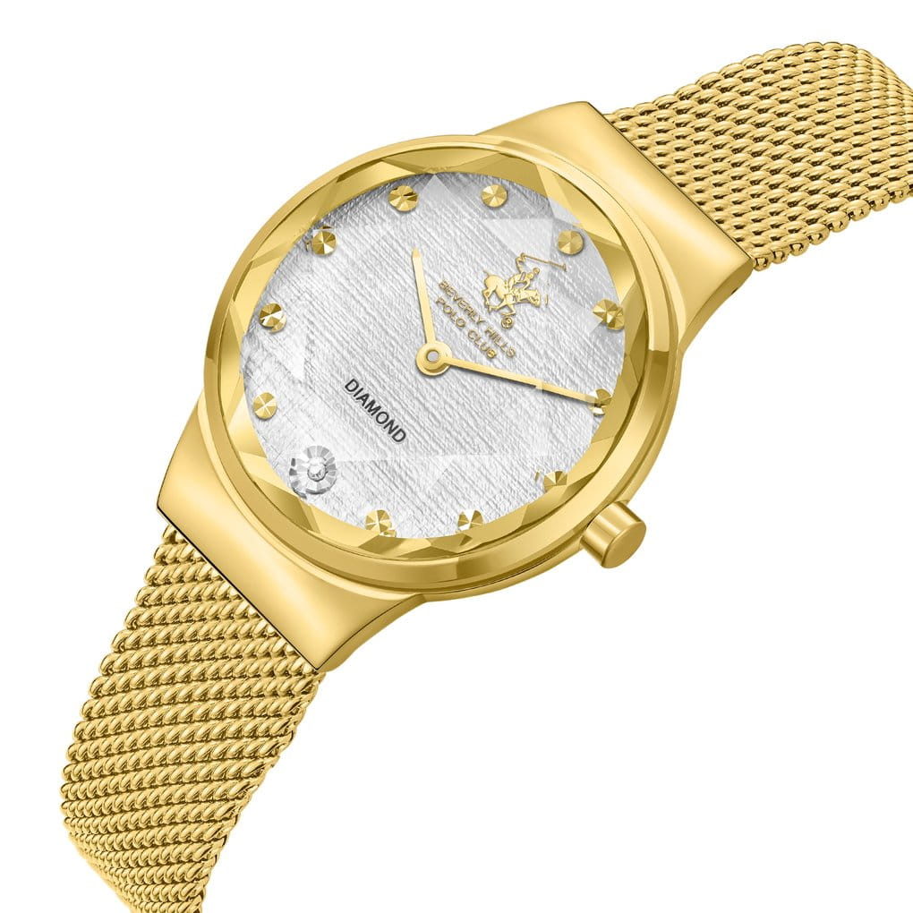 Американские женские часы Beverly Hills Polo Club BP3768X.130 - это стильный женский аксессуар, который сочетает элегантный дизайн и практичность. Корпус выполнен из нержавеющей стали с IP-покрытиемIP-покрытиеМетод ионного напыления. Демонстрирует повышенную устойчивость к истиранию, окислению и химическим веществам. Под воздействием высокого давления и температуры около 1500°C молекулы металла надёжно соединяются с частицами корпуса часов. золотого цвета, диаметром 28 мм, что обеспечивает долговечность и утончённый внешний вид. Надежное минеральное стеклоМинеральное стеклоМинеральное стекло представляет собой искусственно выращенный минерал кварца. Такое стекло отличается особой устойчивостью к повреждениям и царапинам. Уступает по некоторым качествам сапфировому стеклу. с сапфировым покрытием защищает циферблат от царапин и обеспечивает долговечность. Метки в виде точек инкрустированы синтетическими бриллиантами. Модель оснащена кварцевым механизмом, обеспечивающим высокую точность хода. Стальной браслет миланского плетения на раскладной застёжкеРаскладная застёжкаТакой тип застёжки используется только на браслетах из металла. Она никогда не раскрывается полностью, происходит разделение на 2 и более частей. Раскладывающая застёжка снизит вероятность потери часов к минимуму. обеспечивает комфортное ношение. Водозащита 30 метров позволит защитить корпус от случайных брызг или капель дождя. Эта модель – отличный выбор для тех, кто ищет сочетание стиля, качества и функциональности. Часы станут не только полезным аксессуаром, но и выразительным элементом вашего имиджа.