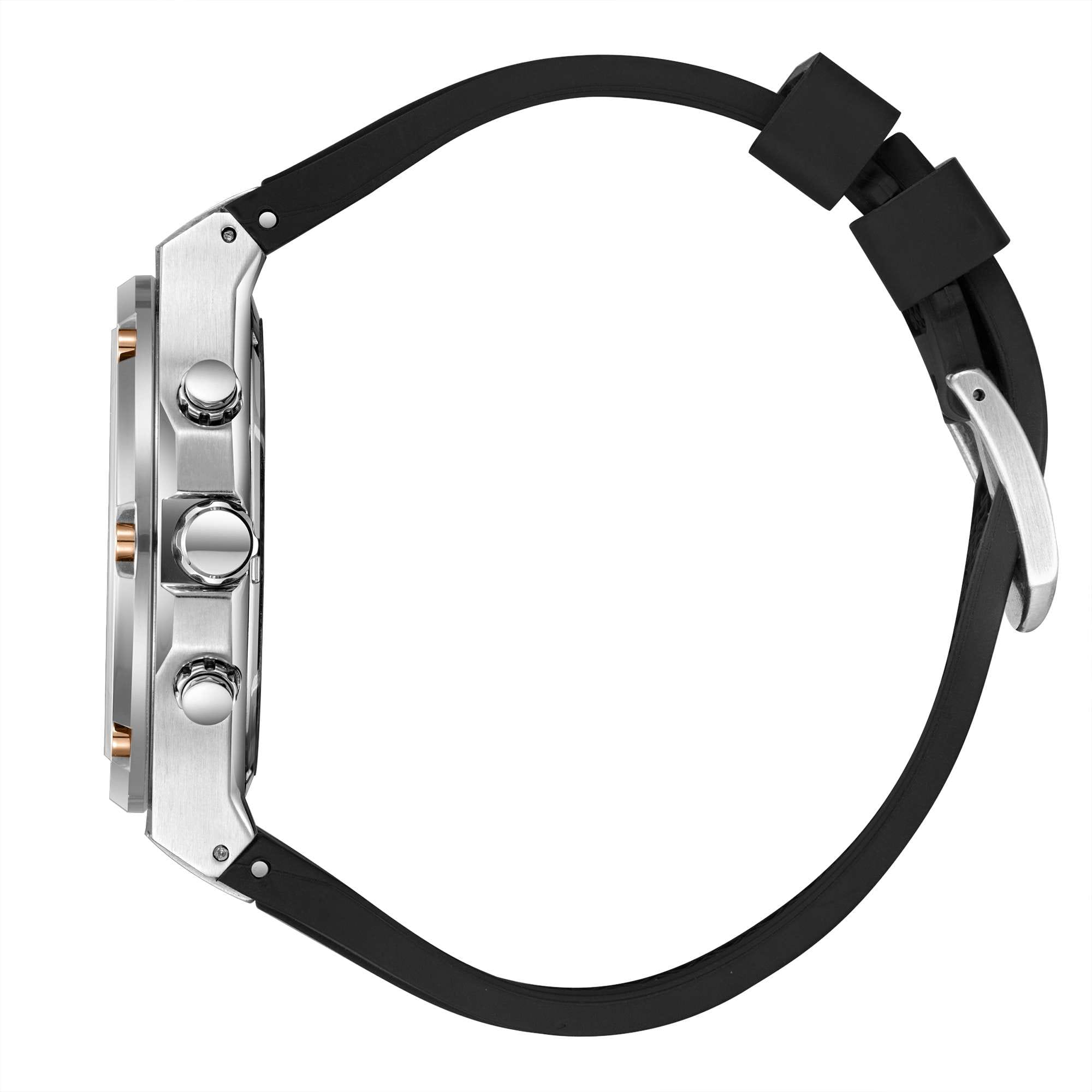 BEVERLY HILLS POLO CLUB BP3822X.331 — стильные мужские часы, сочетающие спортивную динамику и функциональность. Крупный корпус выполнен из нержавеющей стали серебристого цвета, диаметром 46,5 мм, гармонично дополнен каучуковым ремешком на стандартной застежке, что обеспечивает комфортное ношение. Минеральное стеклоМинеральное стеклоМинеральное стекло представляет собой искусственно выращенный минерал кварца. Такое стекло отличается особой устойчивостью к повреждениям и царапинам. Уступает по некоторым качествам сапфировому стеклу. с сапфировым покрытием защищает циферблат от царапин, а кварцевый механизм обеспечивает высокую точность. Благодаря своей универсальной эстетике эти часы уместны и в деловой среде, и в повседневном образе. Стрелки и метки с люминесцентным покрытиемЛюминесцентное покрытиеПозволяет считывать показания времени в темноте. Производители наносят на стрелки, часовые индексы, безель или поверхность циферблата светонакопительный состав, дающий холодное свечение., обеспечивающим хорошую читаемость в темноте. Указатель дня недели вынесен на отдельный циферблат, также присутствует индикация 24-часового формата времени. Окошко даты находится в положении между 4 и 5 часов. Идеальный выбор для тех, кто ценит элегантный дизайн и качество. Водозащита до 50 метров позволит защитить корпус от случайных брызг или капель дождя.