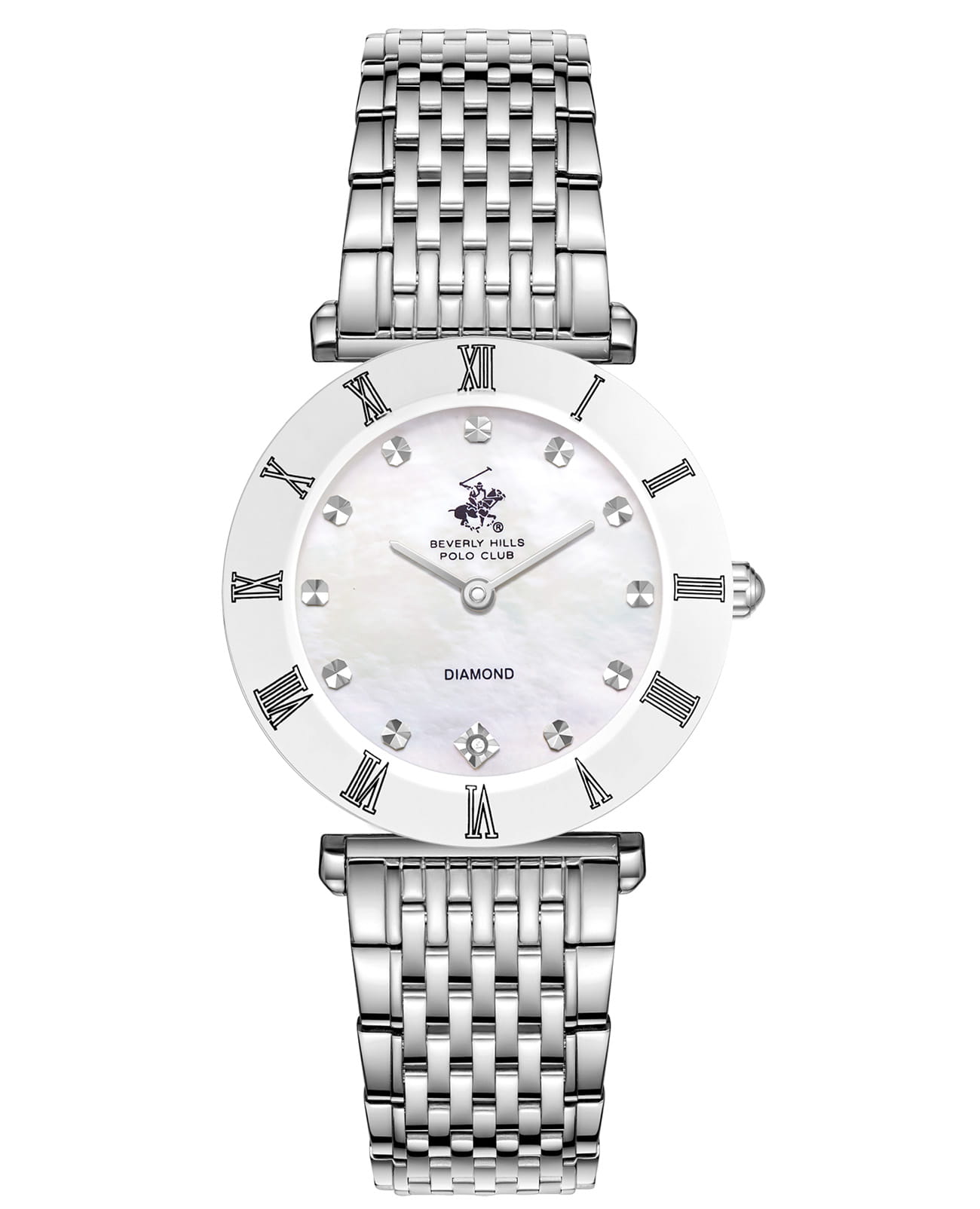 Женские кварцевые часы Beverly Hills Polo Club — это символ элегантного стиля и безупречного вкуса. Корпус диаметром 30 мм выполнен из суперметалла. БезельБезельВнешний ободок, закрепляющий стекло. В спортивных часах так называется поворотное кольцо с делениями на циферблате, выполняет роль таймера – замеряет отрезки времени на шкале. Неподвижный безель – элемент декора. Однонаправленно вращающийся безель на дайверских часах позволяет фиксировать моменты погружения и выныривания на поверхность. из суперметалла с IP-покрытиемIP-покрытиеМетод ионного напыления. Демонстрирует повышенную устойчивость к истиранию, окислению и химическим веществам. Под воздействием высокого давления и температуры около 1500°C молекулы металла надёжно соединяются с частицами корпуса часов.. Циферблат перламутрового цвета оформлен римскими цифрами, стрелками и инкрустирован одним синтетическим бриллиантом. Циферблат защищён минеральным стекломМинеральное стеклоМинеральное стекло представляет собой искусственно выращенный минерал кварца. Такое стекло отличается особой устойчивостью к повреждениям и царапинам. Уступает по некоторым качествам сапфировому стеклу. с сапфировым покрытием. Часы оснащены стальным браслетом на застёжке «бабочка» с кнопкамиЗастёжка "бабочка"Такой вид застёжки дополняется предохранителями, помогающими избежать случайного раскрытия браслета. Обладают изящным исполнением. . Водонепроницаемость 30 м позволяет использовать часы в повседневных условиях. Идеальный выбор для тех, кто ценит американское качество и универсальный дизайн.