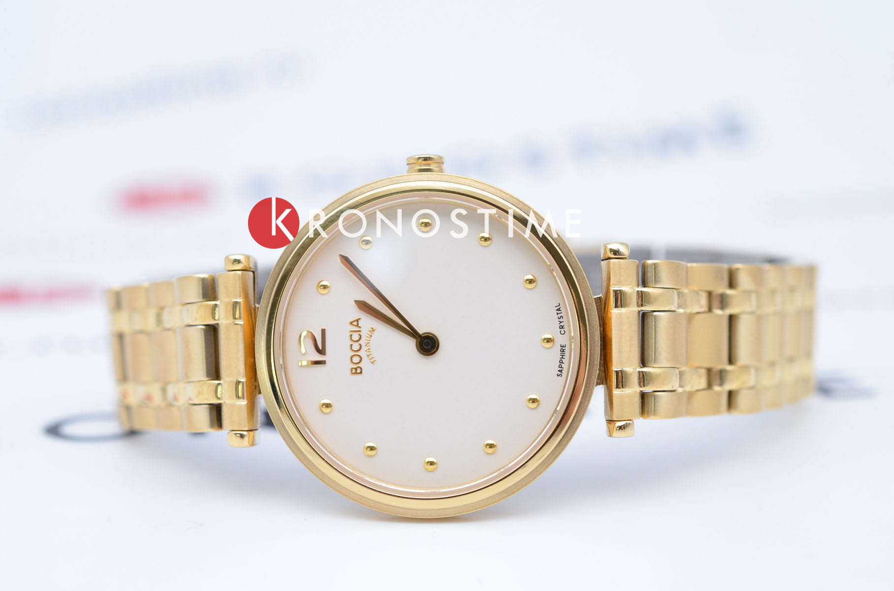 Женские наручные часы Boccia Titanium 3347-03  с надёжным кварцевым механизмом. Корпус и браслет часов изготовлены из титана с PVD-покрытиемPVDУльтратонкое покрытие наносится в технике вакуумного напыления, сочетает в себе нитрид титана особой прочности со слоем золота или оксида хрома. Несёт в себе декоративную или защитную функцию.. Минеральное стеклоМинеральное стеклоМинеральное стекло представляет собой искусственно выращенный минерал кварца. Такое стекло отличается особой устойчивостью к повреждениям и царапинам. Уступает по некоторым качествам сапфировому стеклу. устойчивое к мелким механическим повреждениям. Класс водозащиты: 50 метров, позволит защитить корпус от случайных брызг или капель дождя. Титановый браслет  на раскладной застёжкеРаскладная застёжкаТакой тип застёжки используется только на браслетах из металла. Она никогда не раскрывается полностью, происходит разделение на 2 и более частей. Раскладывающая застёжка снизит вероятность потери часов к минимуму..