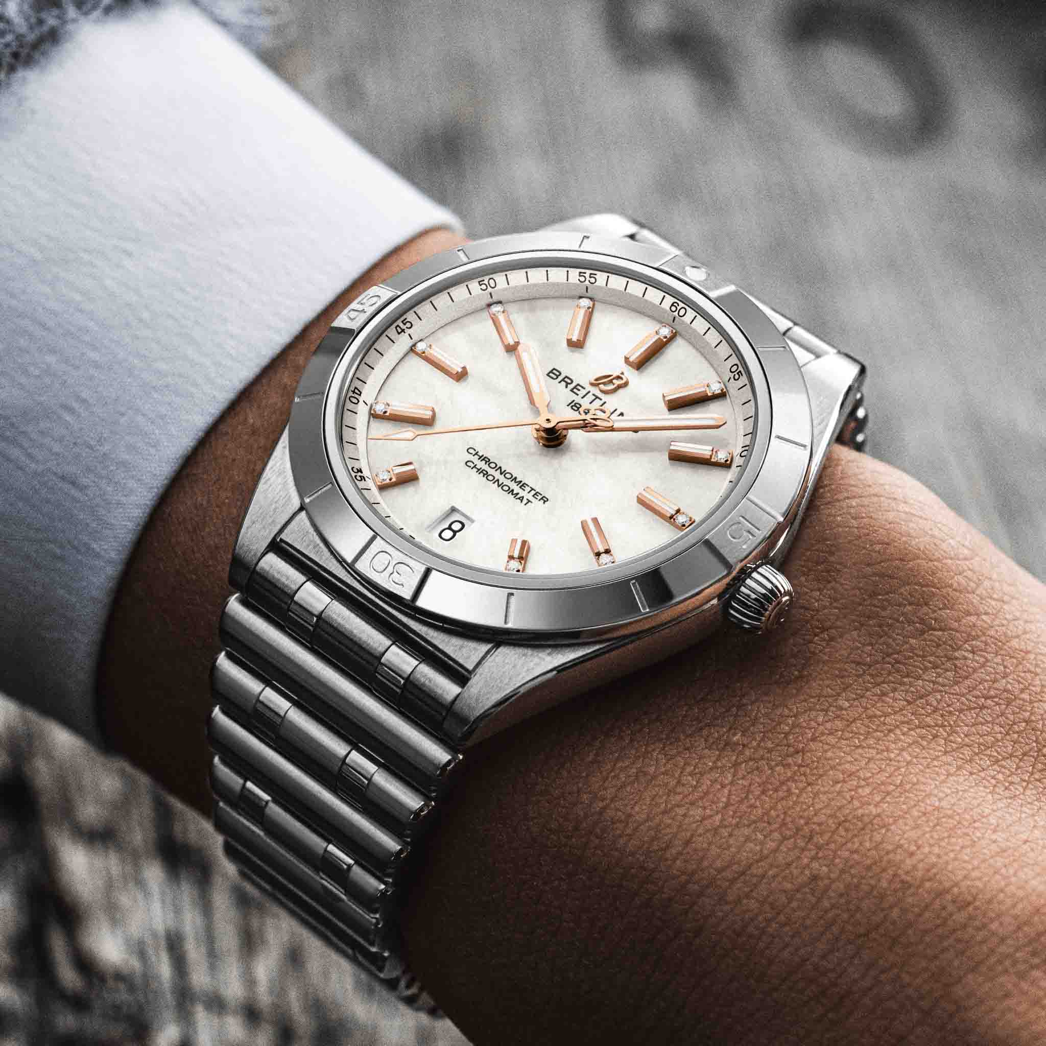 Женские швейцарские механические часы Breitling Chronomat Automatic 36 A10380101A4A1, механический механизм (автоматический калибр) с высокой точностью. Сапфировое стеклоСапфировое стеклоПрочный и надёжный материал из кристалла сапфира синтетического происхождения, характеризующийся особой твёрдостью и устойчивостью к царапинам и повреждениям. с антибликовым покрытием устойчивое к появлению царапин, обладающее высокой прозрачностью. Класс водозащиты: 100 метров, позволит плавать, нырять и заниматься другими водными видами спорта. Корпус часов изготовлен из стали. Стальной браслет с застёжкой-бабочкой с кнопкамиЗастёжка "бабочка"Такой вид застёжки дополняется предохранителями, помогающими избежать случайного раскрытия браслета. Обладают изящным исполнением. . Окошко даты находится в положении 6 часов. Часы имеют сертификат COSCСертификат COSCОфициальный сертификат, подтверждающий то, что часы ходят с особо высокой точностью. Для получения документа часы подвергаются тестовым испытаниям, разработанным швейцарским институтом тестирования хронометров COSC. Допустимая норма для механических часов -4/+6 секунд в день, для кварцевых моделей +/- 0,07 секунд в день..