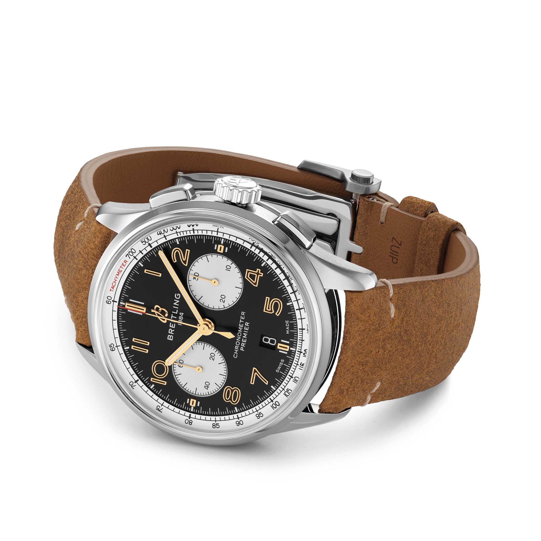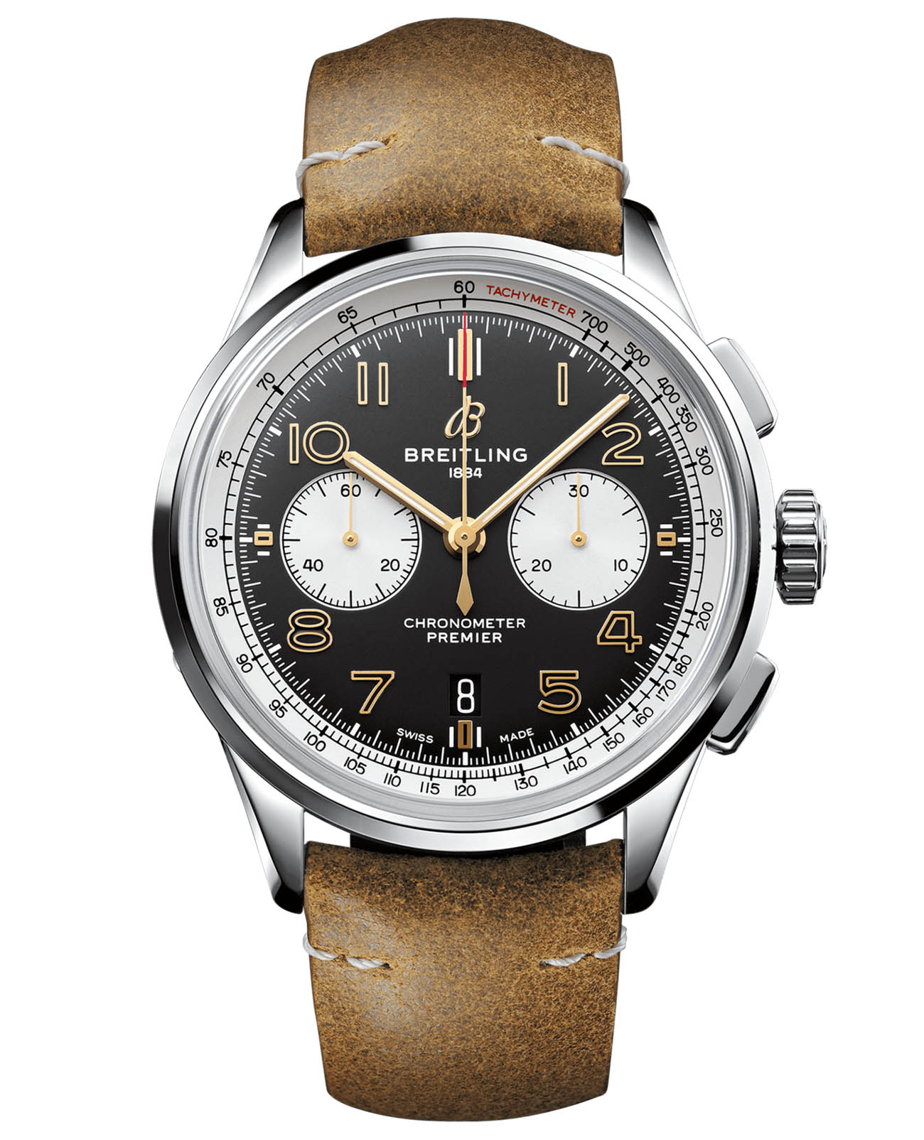 Модель Breitling Premier B01 Chronograph 42 Norton Edition – результат сотрудничества компании Breitling с британским производителем культовых мотоциклов Norton. Стильный харизматичный дизайн этого хронометра воплощает инновационный и смелый характер обоих брендов. Левая сторона корпуса украшена гравировкой Norton, а прозрачная задняя крышка – изображением мотоцикла и фирменным логотипом. Модель оснащена мануфактурным механизмом Breitling Manufacture Caliber 01, сертифицированным Швейцарским институтом официального тестирования хронометров (COSC). Водонепроницаемость часов – до 10 бар (100 метров). В 42-миллиметровый корпус из нержавеющей стали установлен черный циферблат с контрастными дополнительными счетчиками белого цвета, на фоне которых элегантно выделяются арабские цифры, а также часовая и минутная стрелки с матовым покрытием золотистого цвета. Цветовое решение подчеркивает динамичность и элегантность модели как в комплекте с коричневым ремешком из сыромятной кожи, так и с браслетом из нержавеющей стали.