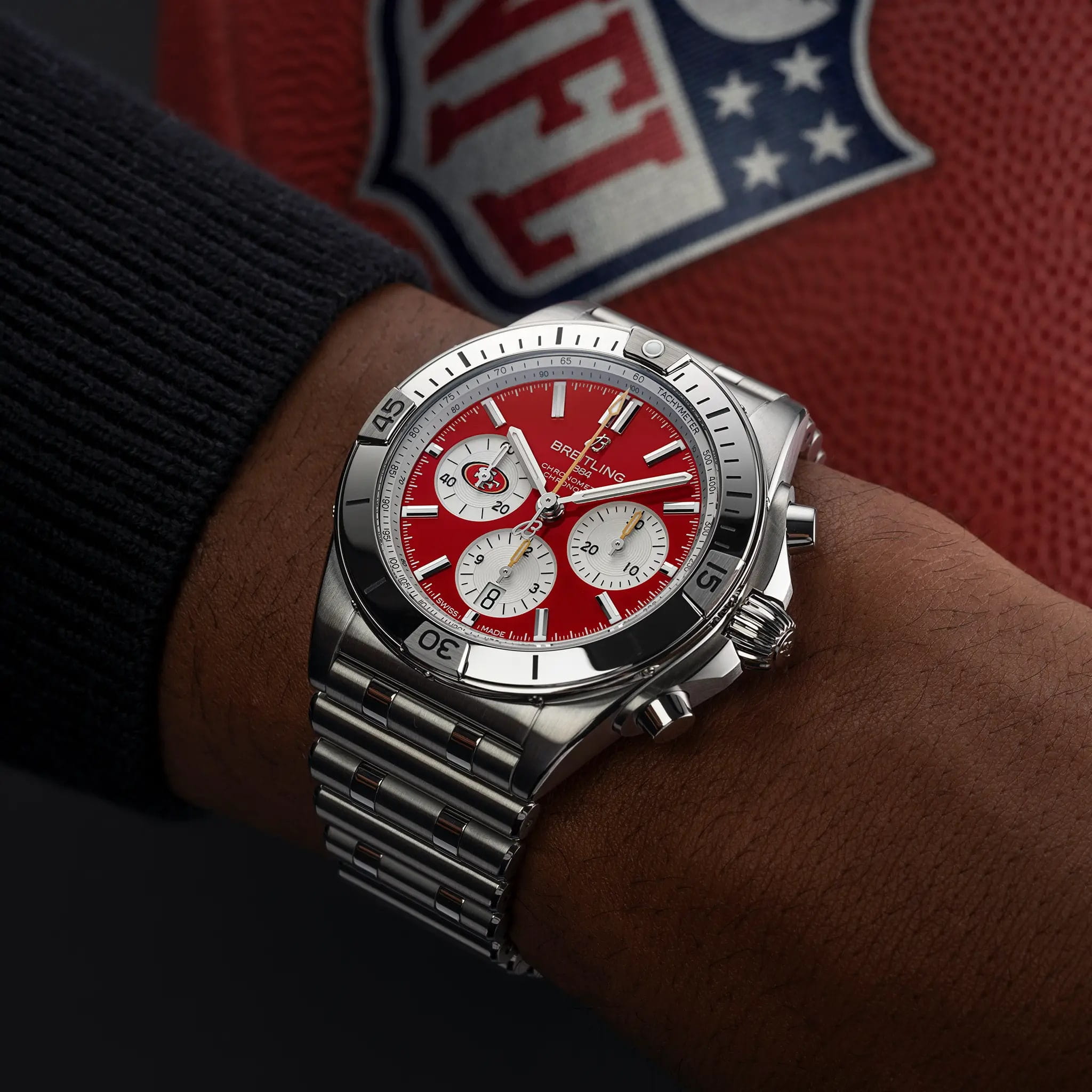 Швейцарские мужские механические часы Breitling Chronomat B01 42 NFL San Francisco 49ers Edition AB01342B1K1A1 с хронографом