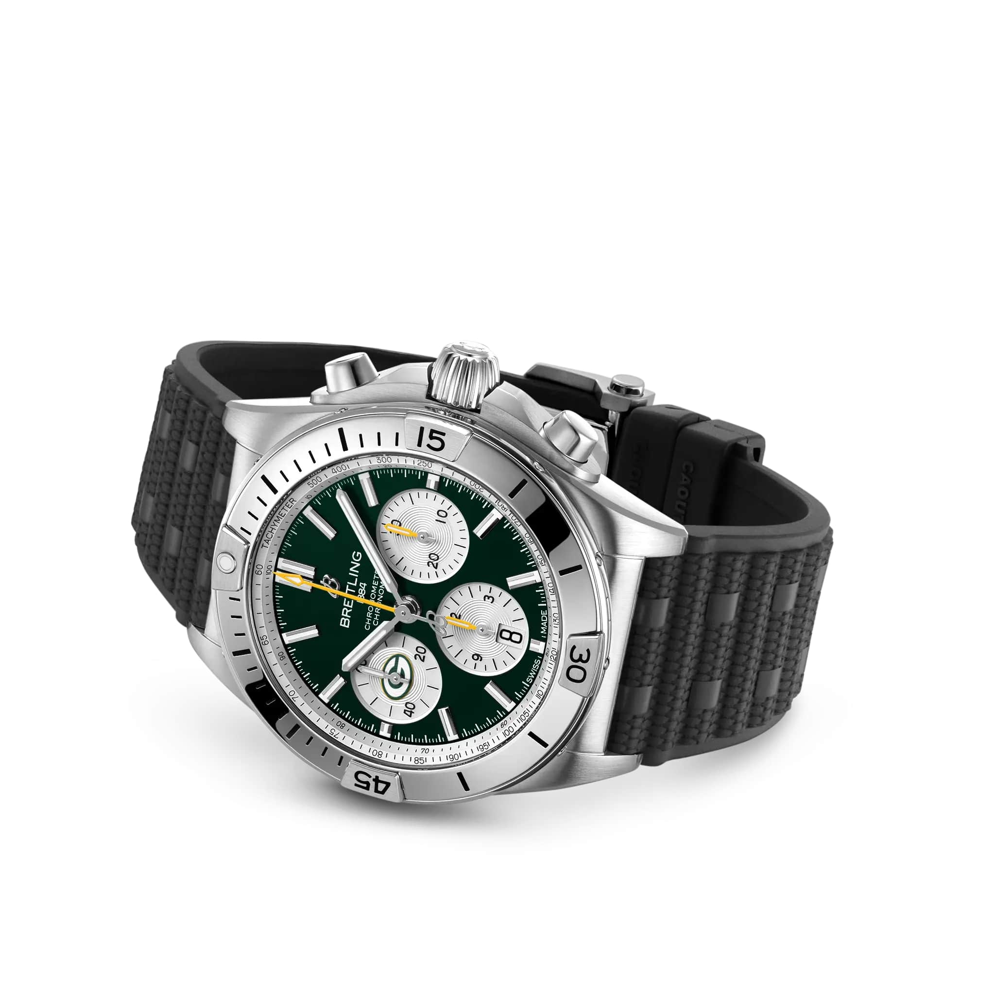 Мужские швейцарские часы-хронограф с секундомером Breitling B01 42 NFL Green Bay Packers Edition AB01342B1L1S1, механический механизм (автоматический калибр) с высокой точностью. Сапфировое стеклоСапфировое стеклоПрочный и надёжный материал из кристалла сапфира синтетического происхождения, характеризующийся особой твёрдостью и устойчивостью к царапинам и повреждениям. устойчивое к появлению царапин, обладающее высокой прозрачностью. Класс водозащиты: 200 метров, позволит плавать, нырять и заниматься другими водными видами спорта. Корпус часов изготовлен из нержавеющей стали. Браслет из каучука на раскладной застёжкеРаскладная застёжкаТакой тип застёжки используется только на браслетах из металла. Она никогда не раскрывается полностью, происходит разделение на 2 и более частей. Раскладывающая застёжка снизит вероятность потери часов к минимуму.. Стрелки и метки с люминесцентным покрытиемЛюминесцентное покрытиеПозволяет считывать показания времени в темноте. Производители наносят на стрелки, часовые индексы, безель или поверхность циферблата светонакопительный состав, дающий холодное свечение.. Шкала тахиметра на циферблате. Окошко даты находится в положении 6 часов.