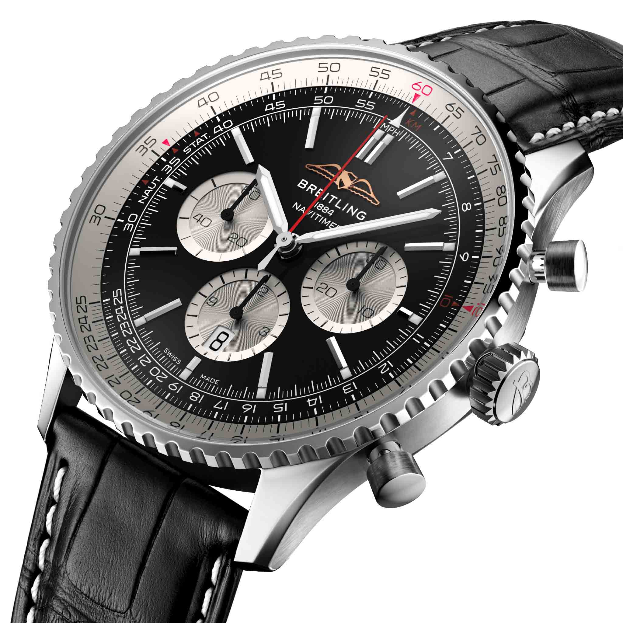 Мужские швейцарские часы-хронографХронографФункция позволяет измерять отрезки времени с особой точностью: часы, минуты, секунды. Верным признаком хронографа является наличие на циферблате 3 дополнительных окошек-счётчиков. с секундомеромСекундомерСекундоме́р — прибор, способный измерять интервалы времени с точностью до долей секунды. Breitling Navitimer B01 Chronograph 46 AB0137211B1P1, механический механизм (автоматический калибр) с высокой точностью. Сапфировое стеклоСапфировое стеклоПрочный и надёжный материал из кристалла сапфира синтетического происхождения, характеризующийся особой твёрдостью и устойчивостью к царапинам и повреждениям. устойчивое к появлению царапин, обладающее высокой прозрачностью. Класс водозащиты: 30 метров, позволит защитить корпус от случайных брызг или капель дождя. Корпус часов изготовлен из стали. Кожаный крокодиловый ремешок с раскладной застёжкойРаскладная застёжкаТакой тип застёжки используется только на браслетах из металла. Она никогда не раскрывается полностью, происходит разделение на 2 и более частей. Раскладывающая застёжка снизит вероятность потери часов к минимуму.. Шкала тахиметраТахиметрРазмеченная шкала, располагается на ободке или безеле часов. Тахиметр позволяет рассчитать скорость на определённом участке пути, расстояние измеряется в километрах или милях. на циферблате. Часы имеют сертификат COSCСертификат COSCОфициальный сертификат, подтверждающий то, что часы ходят с особо высокой точностью. Для получения документа часы подвергаются тестовым испытаниям, разработанным швейцарским институтом тестирования хронометров COSC. Допустимая норма для механических часов -4/+6 секунд в день, для кварцевых моделей +/- 0,07 секунд в день.. Окошко даты находится в положении 6 часов. Стрелки и метки с люминесцентным покрытиемЛюминесцентное покрытиеПозволяет считывать показания времени в темноте. Производители наносят на стрелки, часовые индексы, безель или поверхность циферблата светонакопительный состав, дающий холодное свечение..