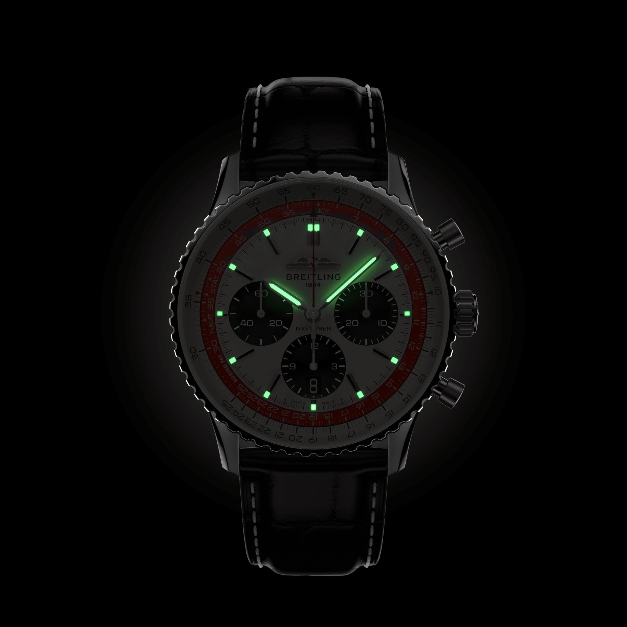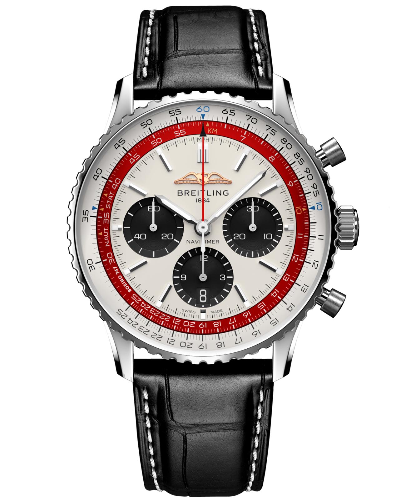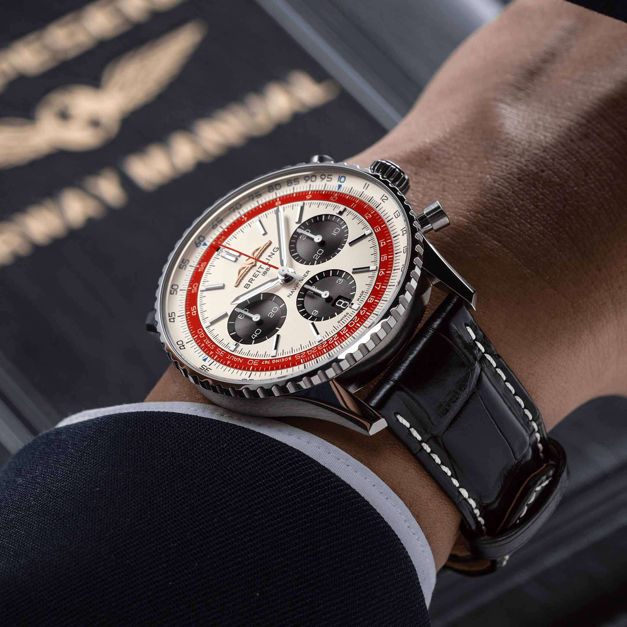 Мужские швейцарские часы-хронографХронографФункция позволяет измерять отрезки времени с особой точностью: часы, минуты, секунды. Верным признаком хронографа является наличие на циферблате 3 дополнительных окошек-счётчиков. с секундомеромСекундомерСекундоме́р — прибор, способный измерять интервалы времени с точностью до долей секунды. Breitling Navitimer B01 Chronograph 43 Boeing 747 AB01383B1G1P1, механический механизм (автоматический калибр) с высокой точностью. Сапфировое стеклоСапфировое стеклоПрочный и надёжный материал из кристалла сапфира синтетического происхождения, характеризующийся особой твёрдостью и устойчивостью к царапинам и повреждениям. устойчивое к появлению царапин, обладающее высокой прозрачностью. Класс водозащиты: 30 метров, позволит защитить корпус от случайных брызг или капель дождя. Корпус часов изготовлен из стали. Кожаный ремешок с раскладной застёжкойРаскладная застёжкаТакой тип застёжки используется только на браслетах из металла. Она никогда не раскрывается полностью, происходит разделение на 2 и более частей. Раскладывающая застёжка снизит вероятность потери часов к минимуму.. Шкала тахиметраТахиметрРазмеченная шкала, располагается на ободке или безеле часов. Тахиметр позволяет рассчитать скорость на определённом участке пути, расстояние измеряется в километрах или милях. на циферблате. Часы имеют сертификат COSCСертификат COSCОфициальный сертификат, подтверждающий то, что часы ходят с особо высокой точностью. Для получения документа часы подвергаются тестовым испытаниям, разработанным швейцарским институтом тестирования хронометров COSC. Допустимая норма для механических часов -4/+6 секунд в день, для кварцевых моделей +/- 0,07 секунд в день.. Окошко даты находится в положении 6 часов. Стрелки и метки с люминесцентным покрытиемЛюминесцентное покрытиеПозволяет считывать показания времени в темноте. Производители наносят на стрелки, часовые индексы, безель или поверхность циферблата светонакопительный состав, дающий холодное свечение..