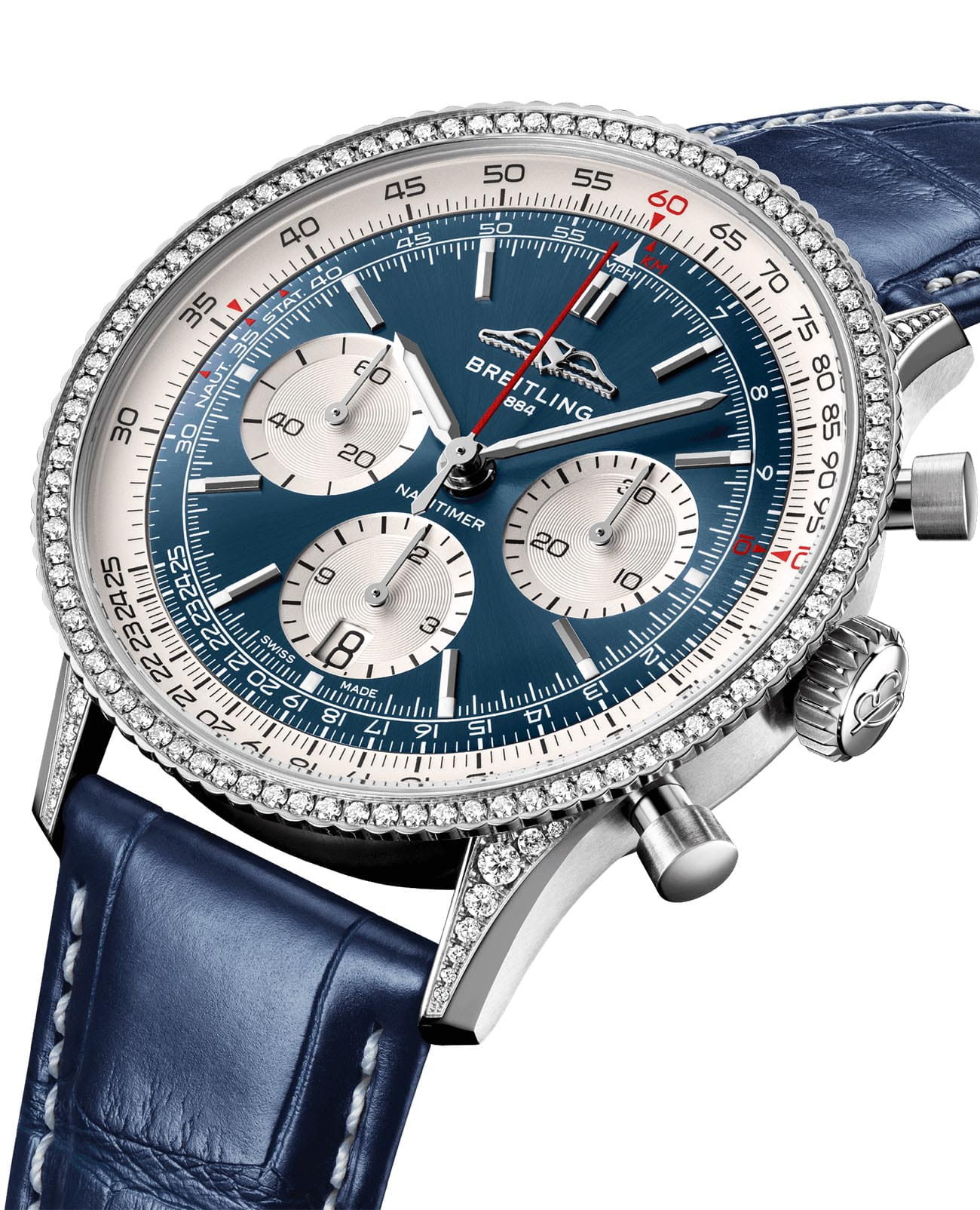 Мужские швейцарские часы-хронографХронографФункция позволяет измерять отрезки времени с особой точностью: часы, минуты, секунды. Верным признаком хронографа является наличие на циферблате 3 дополнительных окошек-счётчиков. с секундомеромСекундомерСекундоме́р — прибор, способный измерять интервалы времени с точностью до долей секунды. Breitling Navitimer B01 Chronograph 41 AB0139631C1P1, механический механизм (автоматический калибр) с высокой точностью. С момента своего дебюта 70 лет назад icon от Breitling претерпел множество модификаций, но этот новый Navitimer отражает его самые классические функции, дополняя их современными усовершенствованиями. Сплющенная логарифмическая линейка и выпуклый кристалл создают иллюзию более изящного профиля. Сапфировое стеклоСапфировое стеклоПрочный и надёжный материал из кристалла сапфира синтетического происхождения, характеризующийся особой твёрдостью и устойчивостью к царапинам и повреждениям. устойчивое к появлению царапин, обладающее высокой прозрачностью. Класс водозащиты: 30 метров, позволит защитить корпус от случайных брызг или капель дождя. Корпус часов изготовлен из стали. Ремешок из кожи аллигатора на стандартной застёжке. Шкала тахиметраТахиметрРазмеченная шкала, располагается на ободке или безеле часов. Тахиметр позволяет рассчитать скорость на определённом участке пути, расстояние измеряется в километрах или милях. на циферблате. БезельБезельВнешний ободок, закрепляющий стекло. В спортивных часах так называется поворотное кольцо с делениями на циферблате, выполняет роль таймера – замеряет отрезки времени на шкале. Неподвижный безель – элемент декора. Однонаправленно вращающийся безель на дайверских часах позволяет фиксировать моменты погружения и выныривания на поверхность. инкрустирован кристаллами. Часы имеют сертификат COSCСертификат COSCОфициальный сертификат, подтверждающий то, что часы ходят с особо высокой точностью. Для получения документа часы подвергаются тестовым испытаниям, разработанным швейцарским институтом тестирования хронометров COSC. Допустимая норма для механических часов -4/+6 секунд в день, для кварцевых моделей +/- 0,07 секунд в день.. Окошко даты находится в положении 6 часов. Часы оснащены логарифмической линейкой. Стрелки и метки с люминесцентным покрытиемЛюминесцентное покрытиеПозволяет считывать показания времени в темноте. Производители наносят на стрелки, часовые индексы, безель или поверхность циферблата светонакопительный состав, дающий холодное свечение.. И если есть одно обновление, которое наверняка вызовет ностальгию, так это возвращение крыльев AOPA в исходное положение на 12 часов. Вот уже 70 лет оригинальные часы Breitling pilot в равной степени нравятся как авиаторам, так и ценителям вкуса. Это самые культовые часы Breitling, которые носят астронавты в космосе и крупнейшие звезды на земле, и одни из самых узнаваемых часов всех времен.