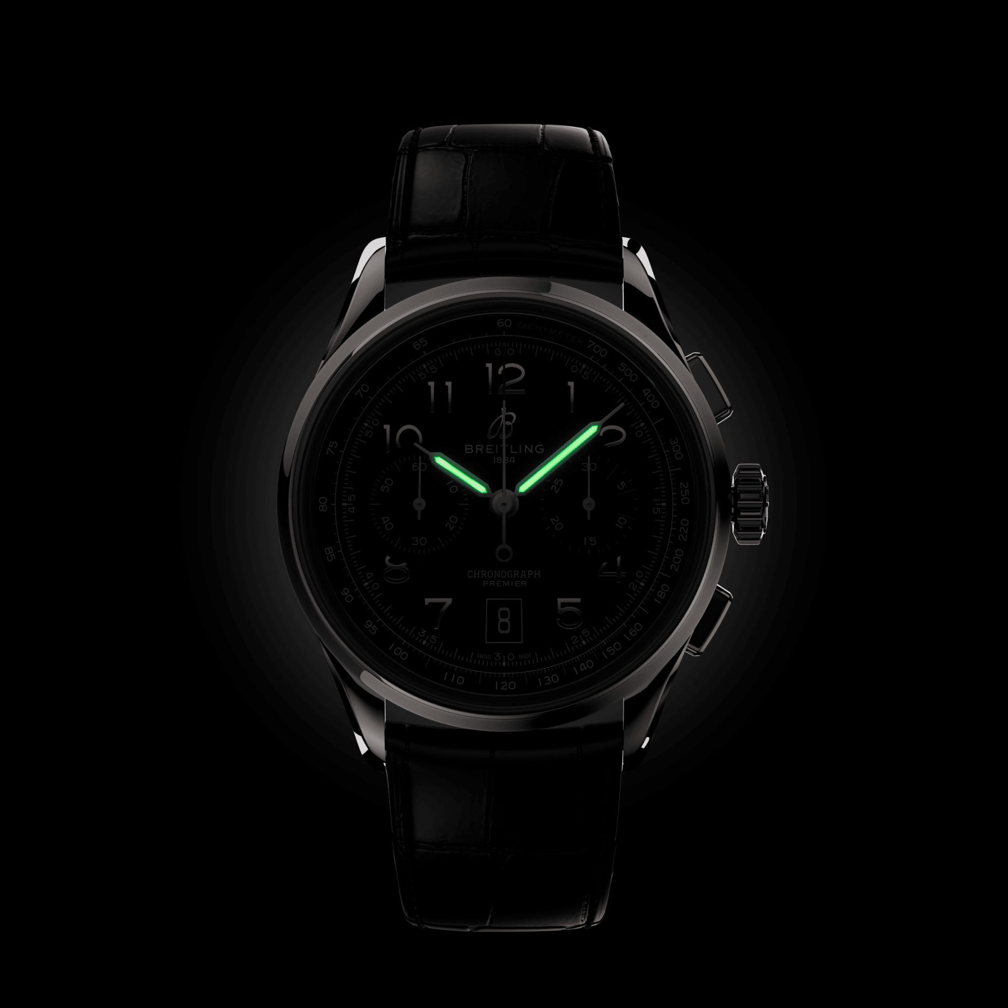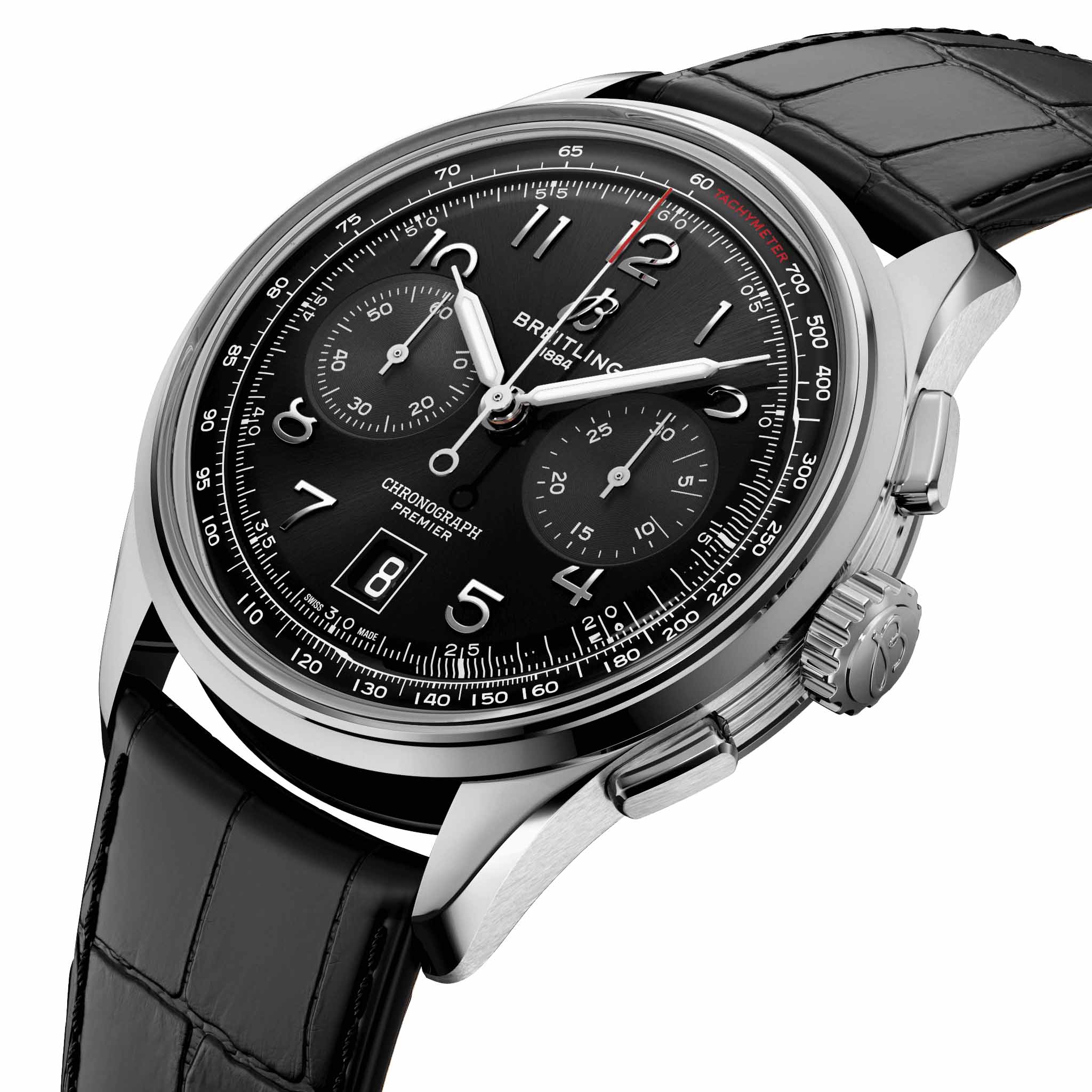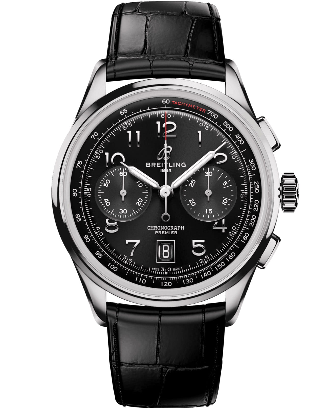 Мужские швейцарские часы-хронографХронографФункция позволяет измерять отрезки времени с особой точностью: часы, минуты, секунды. Верным признаком хронографа является наличие на циферблате 3 дополнительных окошек-счётчиков. с тахиметромТахиметрРазмеченная шкала, располагается на ободке или безеле часов. Тахиметр позволяет рассчитать скорость на определённом участке пути, расстояние измеряется в километрах или милях. Breitling Premier B01 Chronograph 42 AB0145221B1P2, механический механизм (автоматический калибр) с высокой точностью. Сапфировое стеклоСапфировое стеклоПрочный и надёжный материал из кристалла сапфира синтетического происхождения, характеризующийся особой твёрдостью и устойчивостью к царапинам и повреждениям. с антибликовым покрытием устойчивое к появлению царапин, обладающее высокой прозрачностью. Класс водозащиты: 100 метров, позволит плавать, нырять и заниматься другими водными видами спорта. Корпус часов изготовлен из стали. Кожаный крокодиловый ремешок с раскладной застёжкойРаскладная застёжкаТакой тип застёжки используется только на браслетах из металла. Она никогда не раскрывается полностью, происходит разделение на 2 и более частей. Раскладывающая застёжка снизит вероятность потери часов к минимуму.. Стрелки с люминесцентным покрытиемЛюминесцентное покрытиеПозволяет считывать показания времени в темноте. Производители наносят на стрелки, часовые индексы, безель или поверхность циферблата светонакопительный состав, дающий холодное свечение.. Окошко даты находится в положении 6 часов. СекундомерСекундомерСекундоме́р — прибор, способный измерять интервалы времени с точностью до долей секунды..