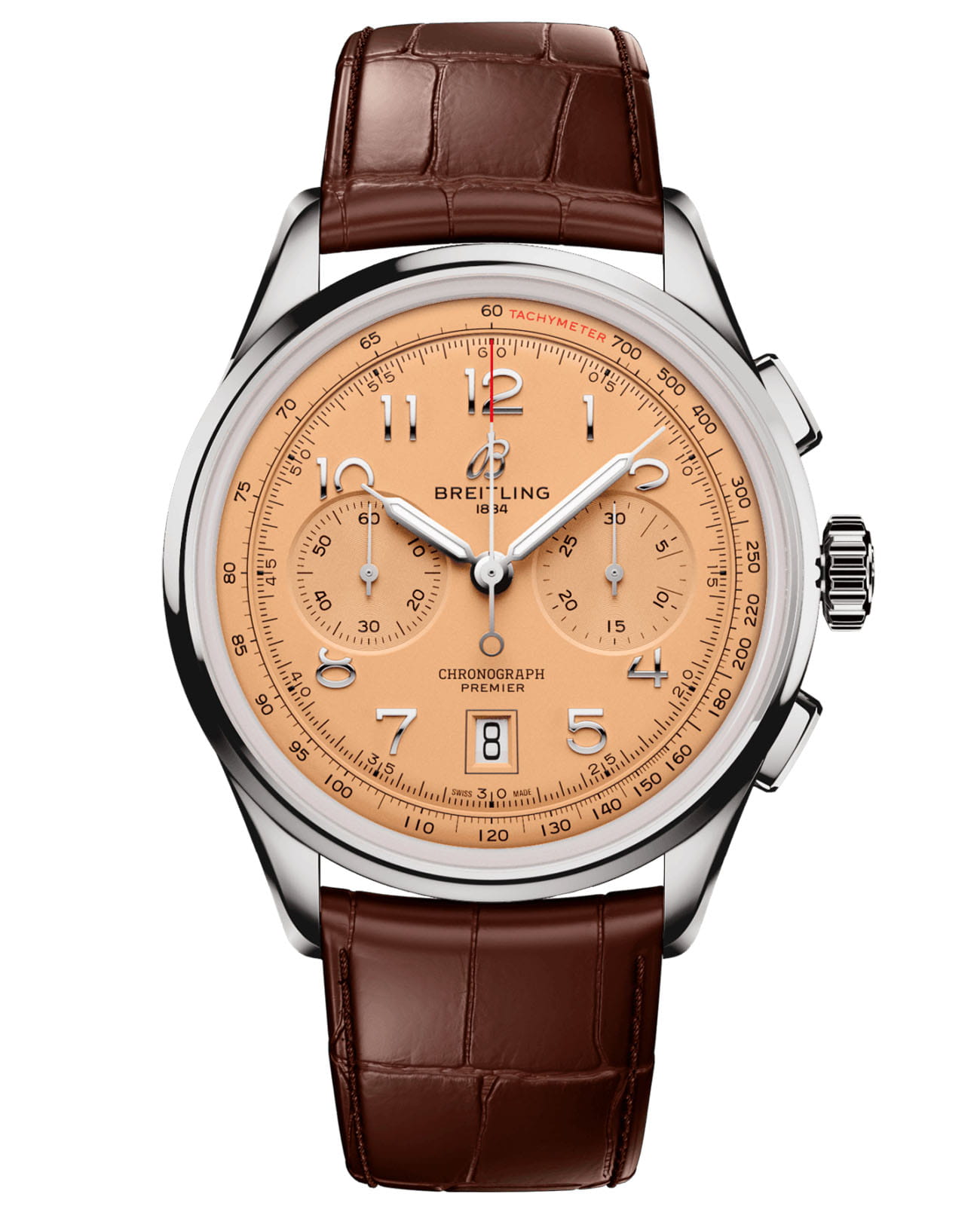 Мужские швейцарские часы-хронографХронографФункция позволяет измерять отрезки времени с особой точностью: часы, минуты, секунды. Верным признаком хронографа является наличие на циферблате 3 дополнительных окошек-счётчиков. с тахиметромТахиметрРазмеченная шкала, располагается на ободке или безеле часов. Тахиметр позволяет рассчитать скорость на определённом участке пути, расстояние измеряется в километрах или милях. Breitling Premier B01 Chronograph 42 AB0145331K1P2, механический механизм (автоматический калибр) с высокой точностью. Сапфировое стеклоСапфировое стеклоПрочный и надёжный материал из кристалла сапфира синтетического происхождения, характеризующийся особой твёрдостью и устойчивостью к царапинам и повреждениям. с антибликовым покрытием устойчивое к появлению царапин, обладающее высокой прозрачностью. Класс водозащиты: 100 метров, позволит плавать, нырять и заниматься другими водными видами спорта. Корпус часов изготовлен из стали. Кожаный крокодиловый ремешок с раскладной застёжкойРаскладная застёжкаТакой тип застёжки используется только на браслетах из металла. Она никогда не раскрывается полностью, происходит разделение на 2 и более частей. Раскладывающая застёжка снизит вероятность потери часов к минимуму.. Стрелки с люминесцентным покрытиемЛюминесцентное покрытиеПозволяет считывать показания времени в темноте. Производители наносят на стрелки, часовые индексы, безель или поверхность циферблата светонакопительный состав, дающий холодное свечение.. Окошко даты находится в положении 6 часов.