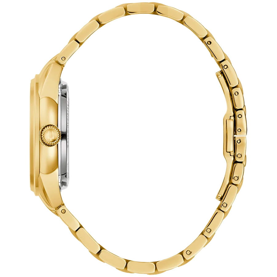 Женские кварцевые часы Bulova Automatic Ladies 97L172 – отражающий идеальное сочетание современного дизайна, надёжности и функциональности. Элегантный облик станет превосходным завершением образа, наделив его индивидуальным характером. Корпус из нержавеющей стали с IP-покрытиемIP-покрытиеМетод ионного напыления. Демонстрирует повышенную устойчивость к истиранию, окислению и химическим веществам. Под воздействием высокого давления и температуры около 1500°C молекулы металла надёжно соединяются с частицами корпуса часов. золотистого цвета, диаметром 35 мм идеально сбалансирован и элегантен. Защиту циферблата обеспечивает прочное сапфировое стеклоСапфировое стеклоПрочный и надёжный материал из кристалла сапфира синтетического происхождения, характеризующийся особой твёрдостью и устойчивостью к царапинам и повреждениям., гарантирующее четкость показаний. Циферблат из белого перламутра украшен золотистыми стрелками и метками, а также апертуром, открывающим вид на автоматический механизм. Браслет из нержавеющей стали с IP-покрытиемIP-покрытиеМетод ионного напыления. Демонстрирует повышенную устойчивость к истиранию, окислению и химическим веществам. Под воздействием высокого давления и температуры около 1500°C молекулы металла надёжно соединяются с частицами корпуса часов. на застёжке-бабочке с кнопкамиЗастёжка "бабочка"Такой вид застёжки дополняется предохранителями, помогающими избежать случайного раскрытия браслета. Обладают изящным исполнением. обеспечивает комфортное ношение. Водозащита 30 метров позволит защитить корпус от случайных брызг или капель дождя. Эта модель – отличный выбор для тех, кто ищет сочетание стиля, качества и функциональности. Часы станут не только полезным аксессуаром, но и выразительным элементом вашего имиджа.