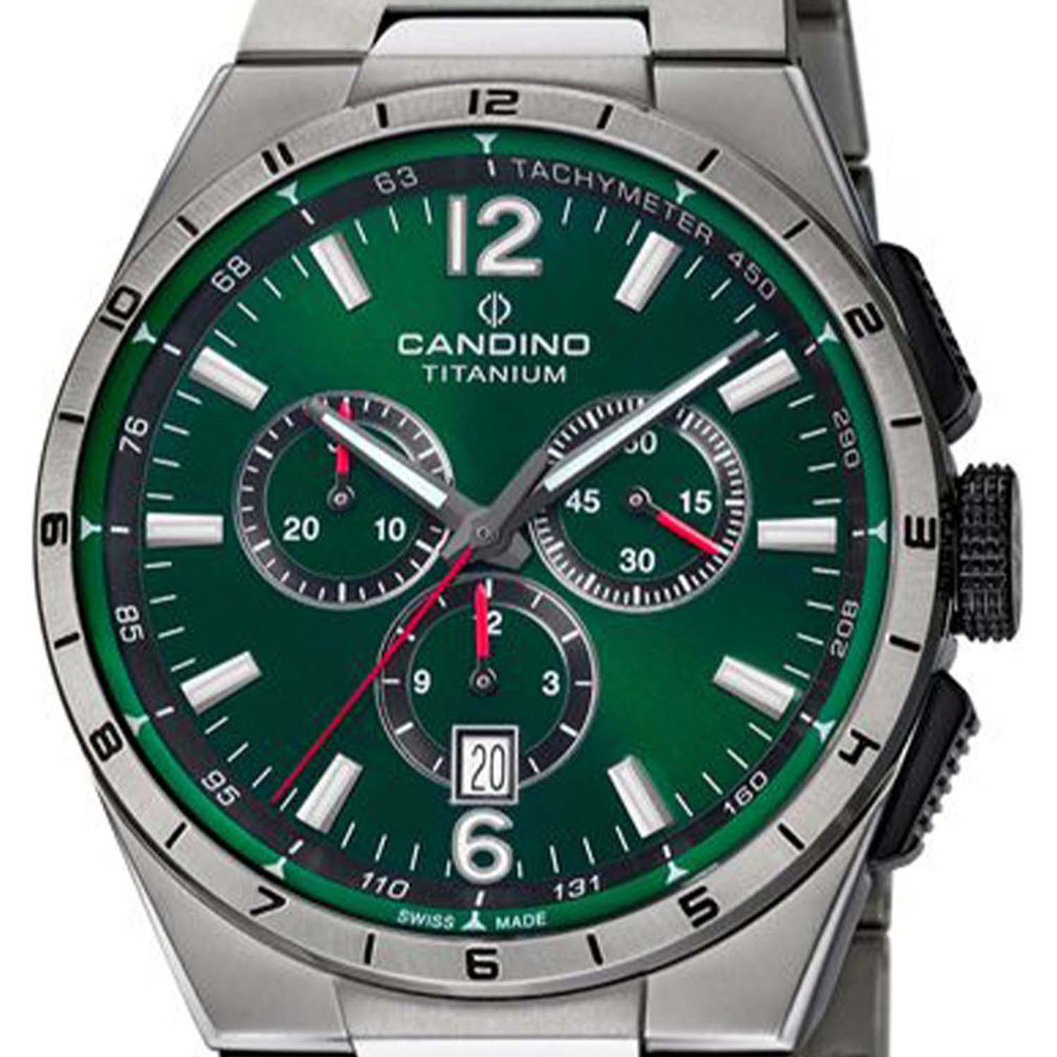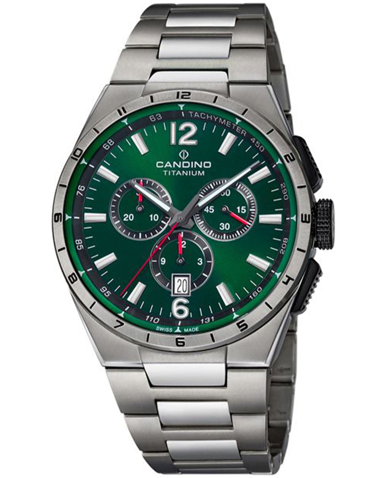 Швейцарские мужские наручные часы-хронографХронографФункция позволяет измерять отрезки времени с особой точностью: часы, минуты, секунды. Верным признаком хронографа является наличие на циферблате 3 дополнительных окошек-счётчиков. с секундомеромСекундомерСекундоме́р — прибор, способный измерять интервалы времени с точностью до долей секунды. Candino Titanium Chrono C4603/K, кварцевый механизм с высокой точностью. Сапфировое стеклоСапфировое стеклоПрочный и надёжный материал из кристалла сапфира синтетического происхождения, характеризующийся особой твёрдостью и устойчивостью к царапинам и повреждениям. устойчивое к появлению царапин, обладающее высокой прозрачностью. Класс водозащиты: 100 метров, позволит плавать, нырять и заниматься другими водными видами спорта. Корпус часов изготовлен из титана. Титановый браслет на раскладной застёжкеРаскладная застёжкаТакой тип застёжки используется только на браслетах из металла. Она никогда не раскрывается полностью, происходит разделение на 2 и более частей. Раскладывающая застёжка снизит вероятность потери часов к минимуму.. Стрелки и метки с люминесцентным покрытиемЛюминесцентное покрытиеПозволяет считывать показания времени в темноте. Производители наносят на стрелки, часовые индексы, безель или поверхность циферблата светонакопительный состав, дающий холодное свечение.. Окошко даты находится в положении 6 часов.