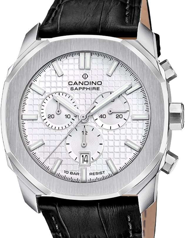Мужские наручные часы-хронографХронографФункция позволяет измерять отрезки времени с особой точностью: часы, минуты, секунды. Верным признаком хронографа является наличие на циферблате 3 дополнительных окошек-счётчиков. Candino C4747/5 из коллекции Chronos Carree сочетают в себе современный дизайн и надежность швейцарского качества. Модель обладает круглым корпусом, выполненным из высококачественной нержавеющей стали, что обеспечивает устойчивость к коррозии и внешним воздействиям . Для защиты циферблата используется сапфировое стеклоСапфировое стеклоПрочный и надёжный материал из кристалла сапфира синтетического происхождения, характеризующийся особой твёрдостью и устойчивостью к царапинам и повреждениям., известное своей прочностью и устойчивостью к царапинам . Часы оснащены кварцевым механизмом RONDA 5030D, гарантирующим высокую точность хода без необходимости дополнительного обслуживания . Циферблат украшен узором гильоше, сочетающим геометрические и радиальные элементы, что придает модели элегантный вид . Браслет изготовлен из кожи, обеспечивающей комфортное ношение . Модель также оснащена функцией секундомераСекундомерСекундоме́р — прибор, способный измерять интервалы времени с точностью до долей секунды. и индикацией даты в позиции «6 часов», что делает её идеальной для активного образа жизни . Водонепроницаемость часов составляет 10 атмосфер (100 метров), что позволяет использовать их во время плавания и других водных видов спорта . Часы подходят для повседневной носки, сохраняя стиль и функциональность.
