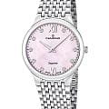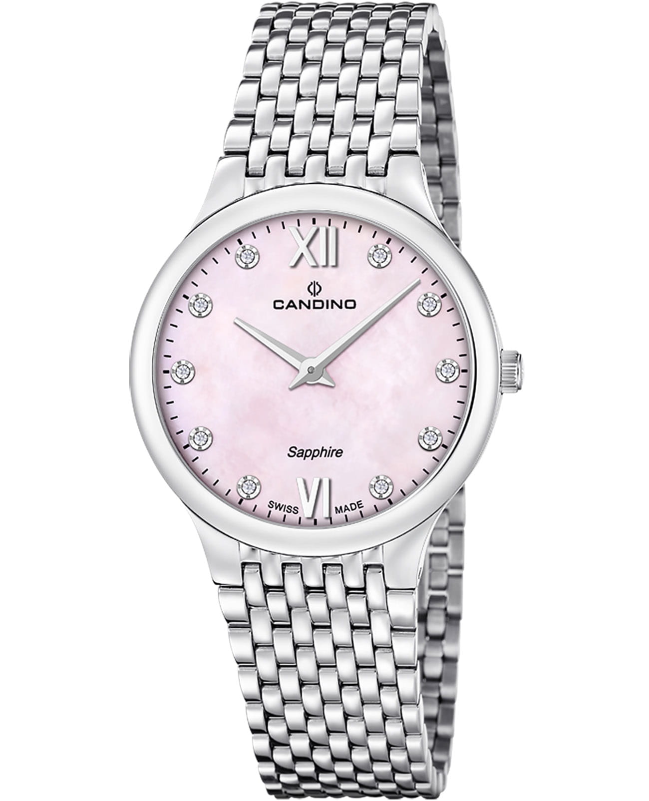 Женские кварцевые часы Candino из коллекции Series 1947 — это утончённый аксессуар, сочетающий швейцарское качество и элегантный дизайн. Корпус диаметром 33,5 мм выполнен из нержавеющей стали. Циферблат розового цвета оформлен индексами в виде точек и украшен циркониями, придающими изделию изысканность. Циферблат защищён сапфировым стекломСапфировое стеклоПрочный и надёжный материал из кристалла сапфира синтетического происхождения, характеризующийся особой твёрдостью и устойчивостью к царапинам и повреждениям., устойчивым к царапинам. Механизм — кварцевый, обеспечивает высокую точность хода и минимальное обслуживание. Часы оснащены стальным браслетом с застёжкой «бабочка» с кнопкамиЗастёжка "бабочка"Такой вид застёжки дополняется предохранителями, помогающими избежать случайного раскрытия браслета. Обладают изящным исполнением. . Водонепроницаемость 50 м позволяет использовать часы в повседневных условиях. Гарантия — 2 года. Идеальный выбор для тех, кто ценит стиль, надёжность и женственность.