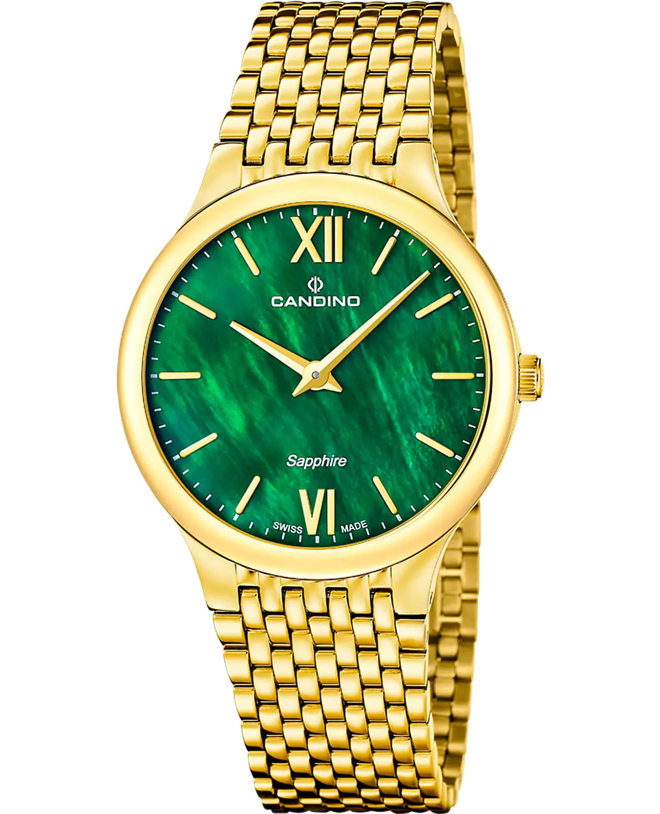 Мужские кварцевые часы Candino из коллекции Series 1947 — это сочетание минимализма, швейцарского качества и современного дизайна. Корпус диаметром 39 мм и толщиной 6 мм выполнен из нержавеющей стали 316L с PVD-покрытиемPVDУльтратонкое покрытие наносится в технике вакуумного напыления, сочетает в себе нитрид титана особой прочности со слоем золота или оксида хрома. Несёт в себе декоративную или защитную функцию. жёлтого золота. Циферблат зелёного цвета оформлен двумя стрелками без индикации даты, что придаёт дизайну чистоту и элегантность. Циферблат защищён сапфировым стекломСапфировое стеклоПрочный и надёжный материал из кристалла сапфира синтетического происхождения, характеризующийся особой твёрдостью и устойчивостью к царапинам и повреждениям., устойчивым к царапинам. Механизм — кварцевый произведённый в Швейцарии. Часы оснащены стальным браслетом с PVD-покрытиемPVDУльтратонкое покрытие наносится в технике вакуумного напыления, сочетает в себе нитрид титана особой прочности со слоем золота или оксида хрома. Несёт в себе декоративную или защитную функцию. жёлтого золота на застёжке «бабочка» с кнопкамиЗастёжка "бабочка"Такой вид застёжки дополняется предохранителями, помогающими избежать случайного раскрытия браслета. Обладают изящным исполнением. . Водонепроницаемость 50 м позволяет использовать часы в повседневных условиях. Гарантия — 2 года. Идеальный выбор для тех, кто ценит лаконичный стиль, точность и надёжность.