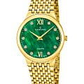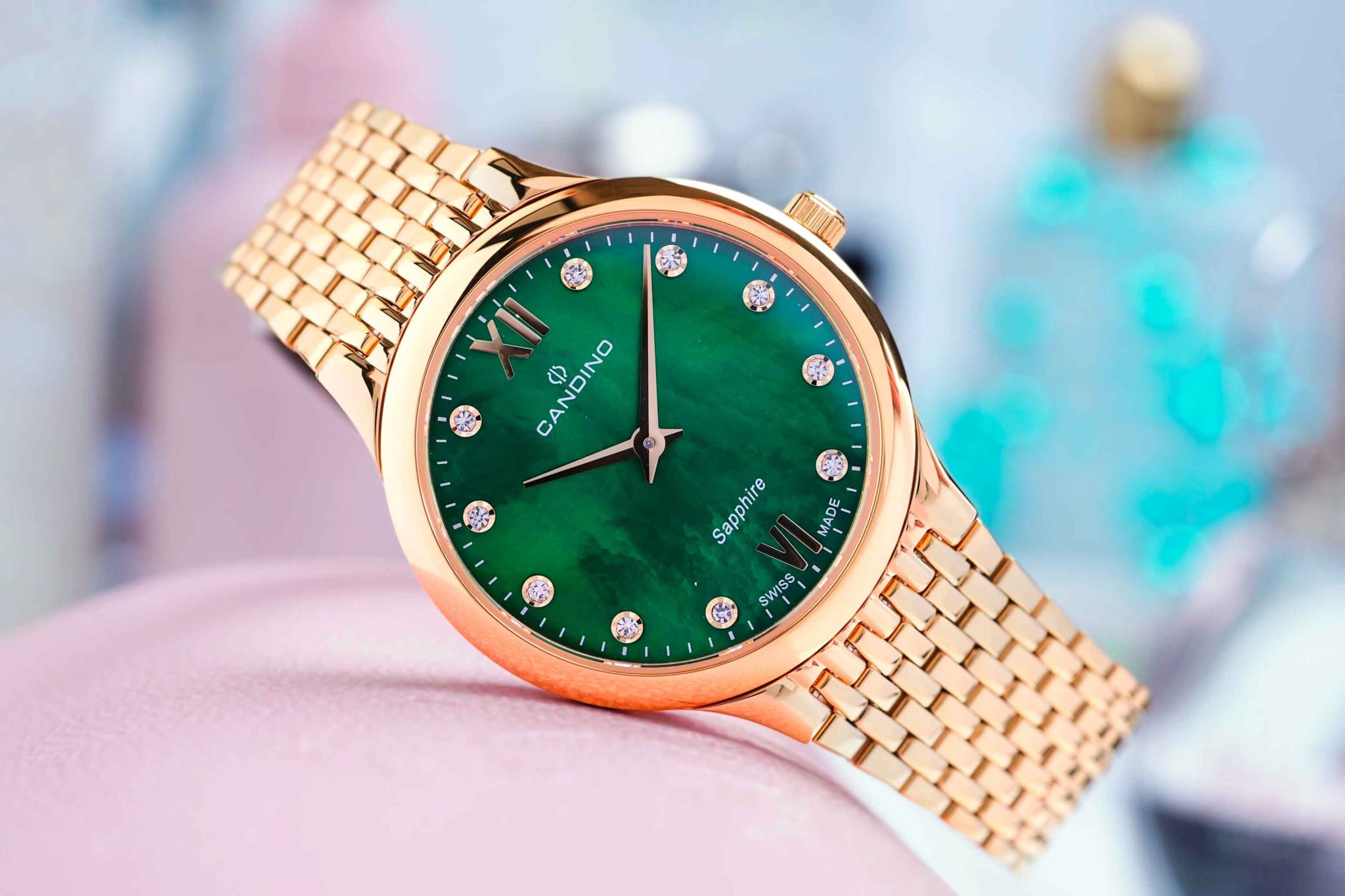 Женские кварцевые часы Candino из коллекции Series 1947 — это утончённый аксессуар, сочетающий минимализм и швейцарское качество. Корпус диаметром 33,5 мм и толщиной 6 мм выполнен из нержавеющей стали 316L с PVD-покрытиемPVDУльтратонкое покрытие наносится в технике вакуумного напыления, сочетает в себе нитрид титана особой прочности со слоем золота или оксида хрома. Несёт в себе декоративную или защитную функцию. жёлтого золота. Циферблат зелёного цвета оформлен двумя стрелками без индикации даты, что придаёт дизайну чистоту и элегантность. Циферблат защищён сапфировым стекломСапфировое стеклоПрочный и надёжный материал из кристалла сапфира синтетического происхождения, характеризующийся особой твёрдостью и устойчивостью к царапинам и повреждениям., устойчивым к царапинам. Метки циферблата выполнены из циркония. Механизм — кварцевый произведённый в Швейцарии. Часы оснащены стальным браслетом с PVD-покрытиемPVDУльтратонкое покрытие наносится в технике вакуумного напыления, сочетает в себе нитрид титана особой прочности со слоем золота или оксида хрома. Несёт в себе декоративную или защитную функцию. жёлтого золота на застёжке «бабочка» с кнопкамиЗастёжка "бабочка"Такой вид застёжки дополняется предохранителями, помогающими избежать случайного раскрытия браслета. Обладают изящным исполнением. . Водонепроницаемость 50 м позволяет использовать часы в повседневных условиях. Гарантия — 2 года. Идеальный выбор для тех, кто ценит лаконичный стиль, точность и надёжность.
