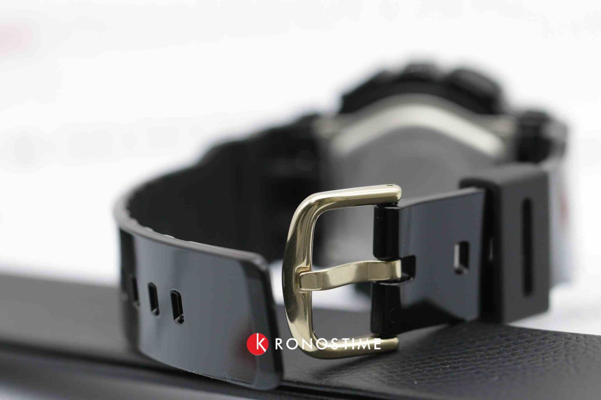 Популярная модель в чёрно-золотистом глянцевом исполнении имеет противоударный корпусУдаропрочный корпусМеханизм заключён в корпус, выполненный из современных материалов, устойчивых к ударам, механическим повреждениям и падению с высоты: инновационный пластик, карбон, нержавеющая сталь, титан., выдерживающий механические повреждения и падение с высоты. Он выполнен из полимерного пластика, такой же материал был выбран для гибкого браслета. Кварцевый механизм работает от батарейки, рассчитанной на 2 года службы. Светодиодная подсветкаСветодиодная подсветкаСветодиодная или LED-подсветка обеспечивает появление яркого холодного свечения за счёт LED-элементов - маленьких лампочек. Они потребляют минимальное количество энергии, чаще всего можно встретить 1 светодиод, в нижней части циферблата. дисплея. Минеральное стекло. Секундомер, будильник, мировое времяМировое время Полезное часовое усложнение, отображающее время в основных городах и известных областях по всему миру, оно связано с часовыми поясами, удобно для путешественников и бизнесменов. , автоматический календарь, таймер. Водостойкость 100 метров. Габариты: 43,4 x 46,3 x 15,8 мм.
