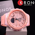 Спортивный аксессуар в персиковом цвете поможет держать себя в форме благодаря таймеру, секундомеру, шагомеру. Счётчик измеряет пройденное количество шагов в диапазоне от 0 до 999999. Вокруг безеляБезельВнешний ободок, закрепляющий стекло. В спортивных часах так называется поворотное кольцо с делениями на циферблате, выполняет роль таймера – замеряет отрезки времени на шкале. Неподвижный безель – элемент декора. Однонаправленно вращающийся безель на дайверских часах позволяет фиксировать моменты погружения и выныривания на поверхность. нанесена шкала в процентах. Она помогает отслеживать план на день, отметка «Goal» обозначает выполнение намеченной цели. Часы выдерживают нагрузки и падение за счёт полимерного противоударного корпусаУдаропрочный корпусМеханизм заключён в корпус, выполненный из современных материалов, устойчивых к ударам, механическим повреждениям и падению с высоты: инновационный пластик, карбон, нержавеющая сталь, титан.. Японский кварцевый механизм. Срок службы батарейки составляет 2 года. Светодиодная подсветкаСветодиодная подсветкаСветодиодная или LED-подсветка обеспечивает появление яркого холодного свечения за счёт LED-элементов - маленьких лампочек. Они потребляют минимальное количество энергии, чаще всего можно встретить 1 светодиод, в нижней части циферблата. ЖК-дисплея и циферблата. Стрелки с люминесцентным покрытиемЛюминесцентное покрытиеПозволяет считывать показания времени в темноте. Производители наносят на стрелки, часовые индексы, безель или поверхность циферблата светонакопительный состав, дающий холодное свечение.. Водозащита 10 бар. Календарь, будильник, второй часовой пояс. Габариты: 42,6 x 45,2 x 13,3 мм.
