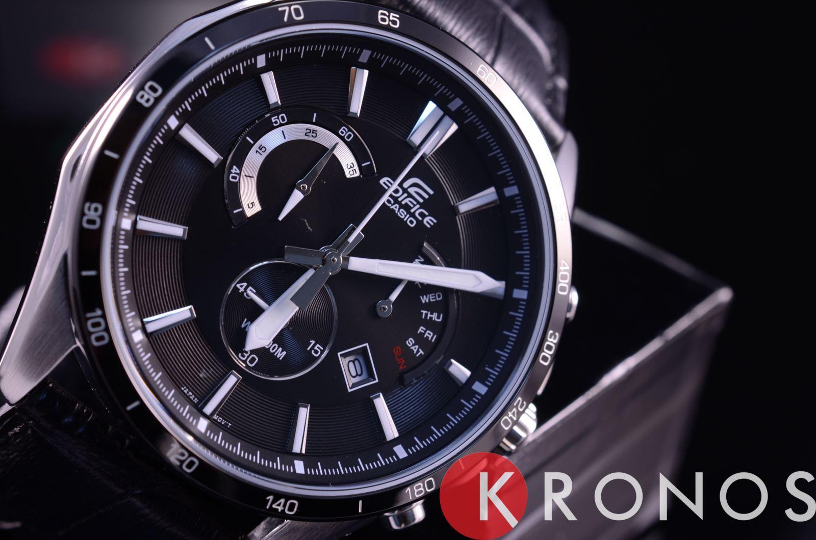 Мужские классические наручные часы Casio Edifice надежные и практичные. Кварцевый японский механизм Miyota. Точность хода не хуже -10 +15 сек./в месяц. Часы оснащены функцией хронографа. Циферблат черног цвета с контрастными индексами.