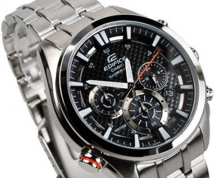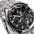 Стильный, мужские наручные часы Casio Edifice надежные и практичные. Кварцевый японский механизм Miyota. Точность хода не хуже -10 +15 сек./в месяц. Часы оснащены функцией хронографа, с точностью 1/10с и временем измерения 1ч. Циферблат черного цвета с контрастными элементами дизайна.  Флюорисцентное напыление на стрелках и дисплее часов позволяет отчетливее видеть каждую цифру.  Корпус и браслет выполнены из нержавеющей стали. Минеральное стекло устойчиво к появлению царапин. Водонепроницаемость 100М. В часах можно плавать. Степень водонепроницаемости не является величиной, эквивалентной функциональной рабочей глубине.