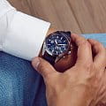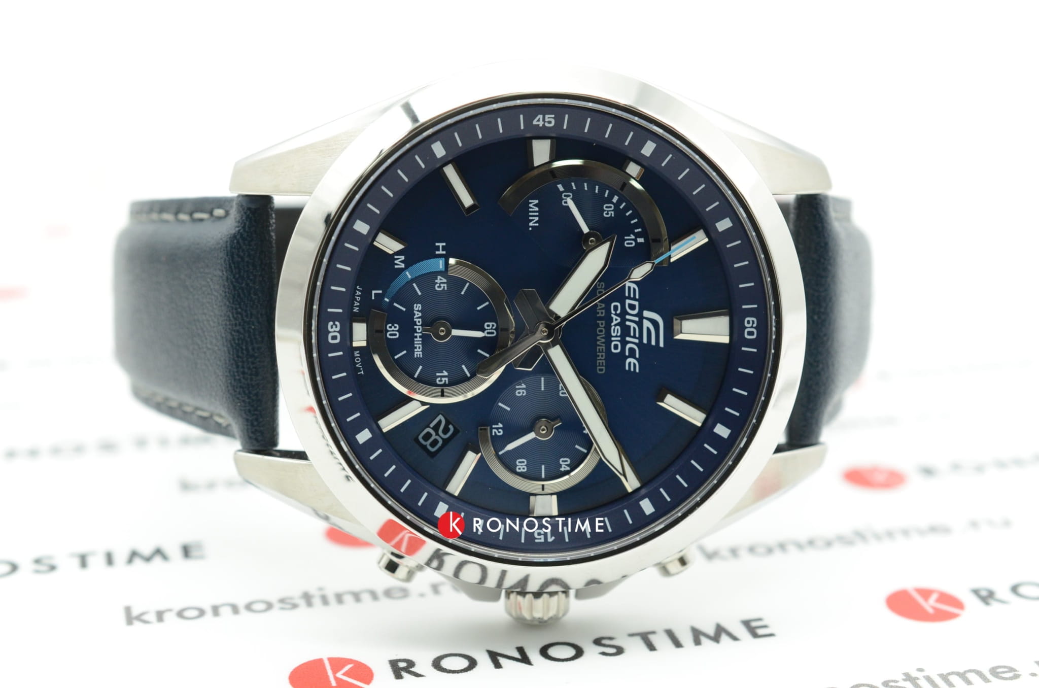 Для модели было выбрано синее цветовое решение, циферблат с необычным расположением счётчиков хронографаХронографФункция позволяет измерять отрезки времени с особой точностью: часы, минуты, секунды. Верным признаком хронографа является наличие на циферблате 3 дополнительных окошек-счётчиков. и крупной индикацией времени выглядит действительно стильно. Наручные часы обеспечиваются питанием благодаря технологии , что весьма удобно и экологично. Точностью хода кварцевого механизма составляет +/- 15 секунд в месяц. Стекло из сапфира. Люминесцентная подсветкаЛюминесцентное покрытиеПозволяет считывать показания времени в темноте. Производители наносят на стрелки, часовые индексы, безель или поверхность циферблата светонакопительный состав, дающий холодное свечение.. Водозащита 10 бар. Ремешок из натуральной кожи. Секундомер, календарь. Габариты: 49,5 x 44,2 x 11,6 мм.