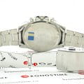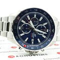 Аксессуар в спортивном стиле прекрасно сочетается с любой одеждой, гармонично смотрится сине-серебристая расцветка. Ярким элементом стали красные секундные стрелки. Часы имеют оттенок дайверского дизайна из-за вращающегося синего безеляБезельВнешний ободок, закрепляющий стекло. В спортивных часах так называется поворотное кольцо с делениями на циферблате, выполняет роль таймера – замеряет отрезки времени на шкале. Неподвижный безель – элемент декора. Однонаправленно вращающийся безель на дайверских часах позволяет фиксировать моменты погружения и выныривания на поверхность. с защитным IP-покрытиемIP-покрытиеМетод ионного напыления. Демонстрирует повышенную устойчивость к истиранию, окислению и химическим веществам. Под воздействием высокого давления и температуры около 1500°C молекулы металла надёжно соединяются с частицами корпуса часов.. Японский высокоточный кварцевый механизм. Батарейка рассчитана на 2 года работы. Люминесцентная подсветкаЛюминесцентное покрытиеПозволяет считывать показания времени в темноте. Производители наносят на стрелки, часовые индексы, безель или поверхность циферблата светонакопительный состав, дающий холодное свечение.. Надёжное минеральное стекло. Ударопрочный корпусУдаропрочный корпусМеханизм заключён в корпус, выполненный из современных материалов, устойчивых к ударам, механическим повреждениям и падению с высоты: инновационный пластик, карбон, нержавеющая сталь, титан. и браслет из нержавеющей стали 316L. Завинчивающаяся задняя крышка. Водостойкость 10 бар. Секундомер, хронографХронографФункция позволяет измерять отрезки времени с особой точностью: часы, минуты, секунды. Верным признаком хронографа является наличие на циферблате 3 дополнительных окошек-счётчиков., индикация числа. Габариты: 51 x 45,9 x 12 мм.