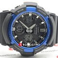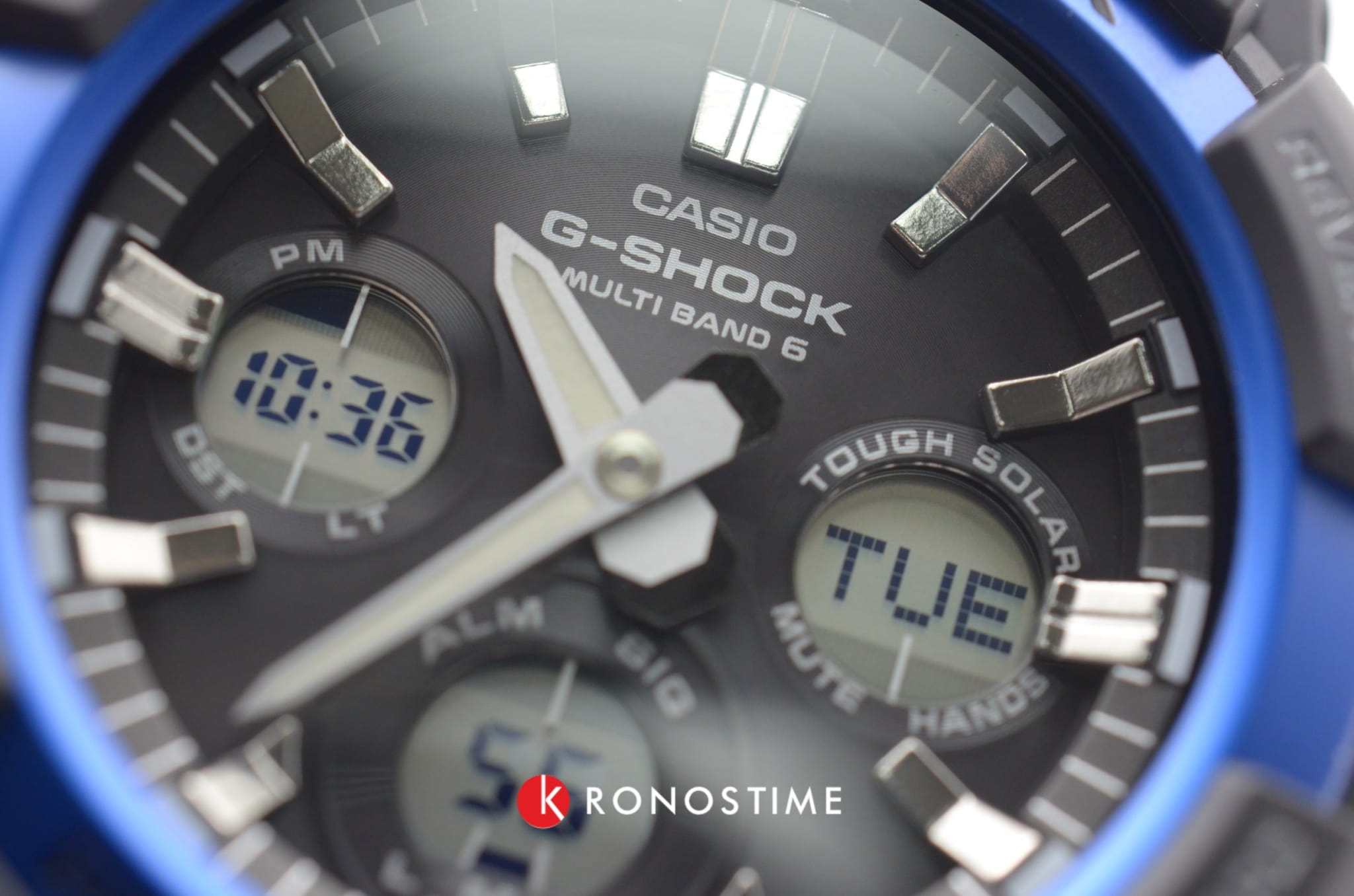Тёмный циферблат с синими деталями дополнен контрастными стрелками и часовыми метками, расположены счётчики хронографаХронографФункция позволяет измерять отрезки времени с особой точностью: часы, минуты, секунды. Верным признаком хронографа является наличие на циферблате 3 дополнительных окошек-счётчиков.. Гибкий ремешок из полимерного материала не вызывает дискомфорта при ношении и не нуждается в особом уходе. Это наручные часы на солнечной батарее, реализуется технология . Функционал: приём сигнала от 6 радиовышек, автоматический календарь, мировое времяМировое время Полезное часовое усложнение, отображающее время в основных городах и известных областях по всему миру, оно связано с часовыми поясами, удобно для путешественников и бизнесменов. , секундомер, таймер, 5 будильников. Минеральное стекло. Ударопрочный полимерный корпусУдаропрочный корпусМеханизм заключён в корпус, выполненный из современных материалов, устойчивых к ударам, механическим повреждениям и падению с высоты: инновационный пластик, карбон, нержавеющая сталь, титан.. Индикатор уровня заряда аккумулятора. Люминесцентная подсветкаЛюминесцентное покрытиеПозволяет считывать показания времени в темноте. Производители наносят на стрелки, часовые индексы, безель или поверхность циферблата светонакопительный состав, дающий холодное свечение. стрелок, светодиодная подсветкаСветодиодная подсветкаСветодиодная или LED-подсветка обеспечивает появление яркого холодного свечения за счёт LED-элементов - маленьких лампочек. Они потребляют минимальное количество энергии, чаще всего можно встретить 1 светодиод, в нижней части циферблата. дисплея. Габариты: 55,1 x 52,5 x 16,7 мм.