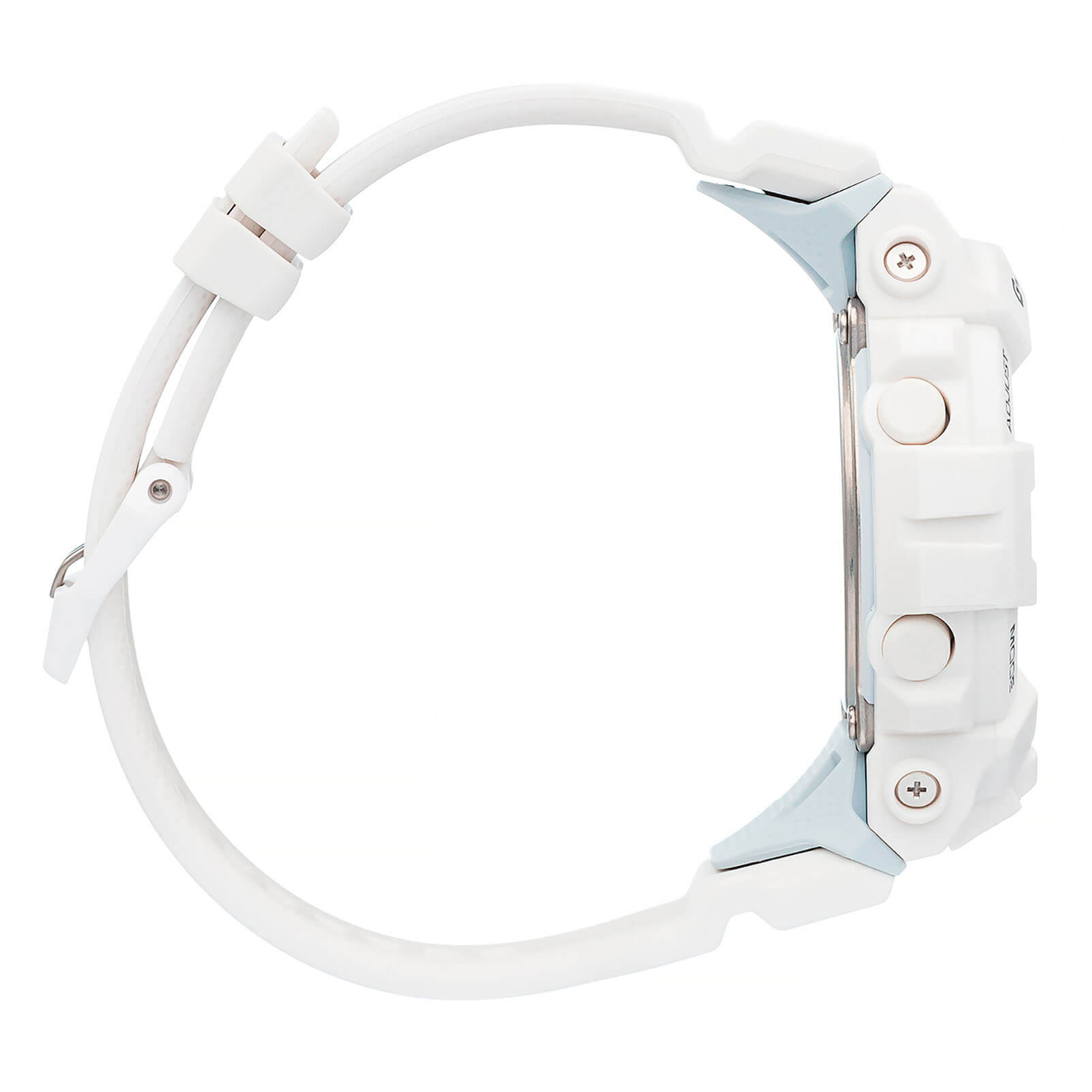 Наручные часы в белоснежном исполнении идеально смотрятся на запястье, они станут грамотным дополнением к повседневному или спортивному стилю одежды. Они оснащены высокоточным шагомером с измерением количества шагов от 0 до 999999, в мобильном приложении G-Shock Connected Phone можно хранить данные физической активности и устанавливать ежедневную норму, это позволяет осуществить технология BluetoothBluetoothСовременная технология, позволяющая синхронизировать часы с телефоном и переносить данные. Часы с Bluetooth расширяют возможности вашего смартфона и делают его использование ещё более удобным.. Японский кварцевый калибр. Эксплуатационный срок батарейки составляет 3 года. Надёжный противоударный корпусУдаропрочный корпусМеханизм заключён в корпус, выполненный из современных материалов, устойчивых к ударам, механическим повреждениям и падению с высоты: инновационный пластик, карбон, нержавеющая сталь, титан. из полимерного пластика. Минеральное стекло устойчиво к царапинам. Двойная подсветка: стрелки с люминесцентным покрытиемЛюминесцентное покрытиеПозволяет считывать показания времени в темноте. Производители наносят на стрелки, часовые индексы, безель или поверхность циферблата светонакопительный состав, дающий холодное свечение., циферблат подсвечивается светодиодомСветодиодная подсветкаСветодиодная или LED-подсветка обеспечивает появление яркого холодного свечения за счёт LED-элементов - маленьких лампочек. Они потребляют минимальное количество энергии, чаще всего можно встретить 1 светодиод, в нижней части циферблата.. Водостойкость до 20 бар. Мировое времяМировое время Полезное часовое усложнение, отображающее время в основных городах и известных областях по всему миру, оно связано с часовыми поясами, удобно для путешественников и бизнесменов. , таймер, автоматический календарь до 2099 года, будильник, хронографХронографФункция позволяет измерять отрезки времени с особой точностью: часы, минуты, секунды. Верным признаком хронографа является наличие на циферблате 3 дополнительных окошек-счётчиков., секундомер. Габариты: 54,1 x 48,6 x 15,5 мм.