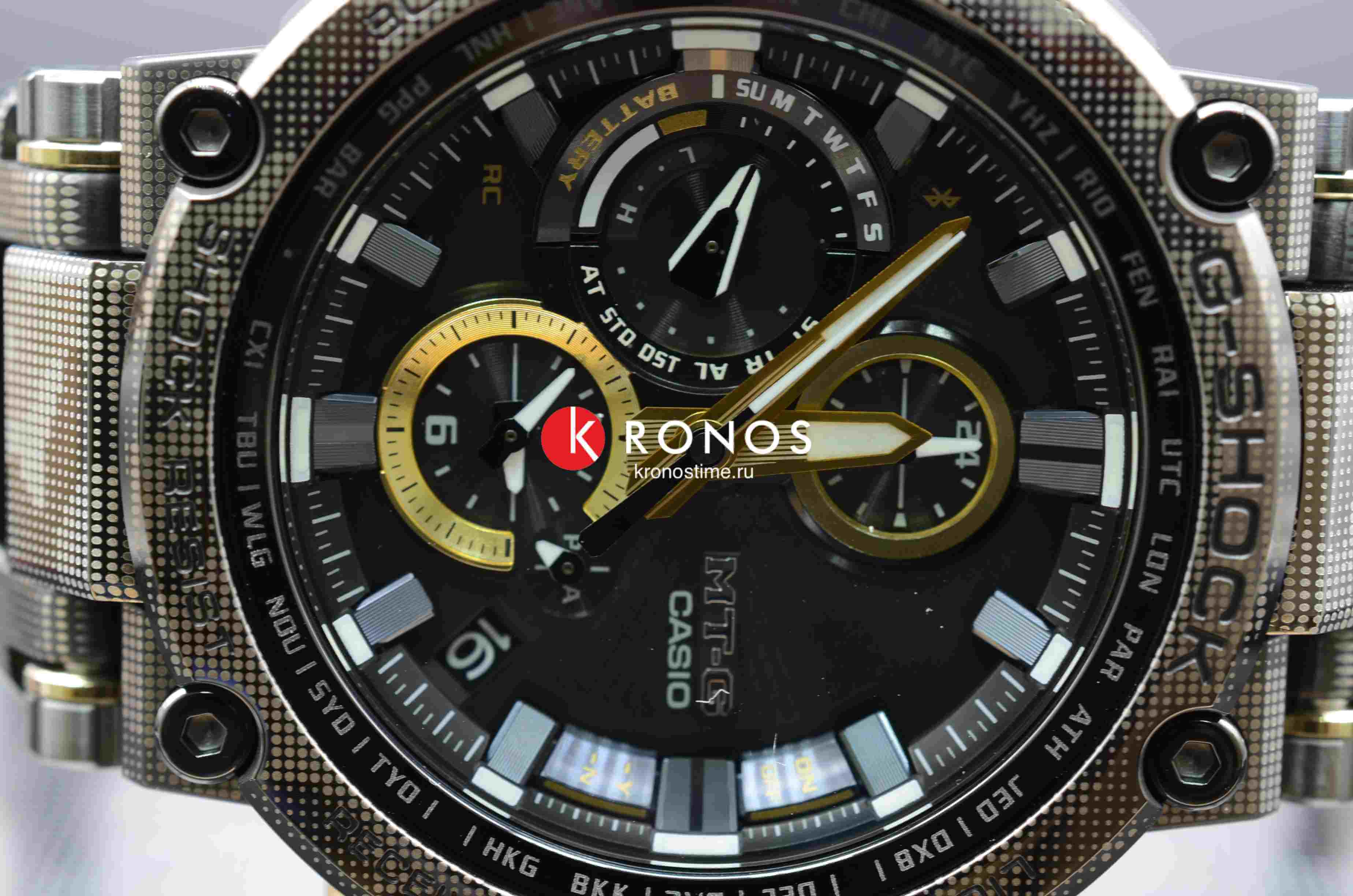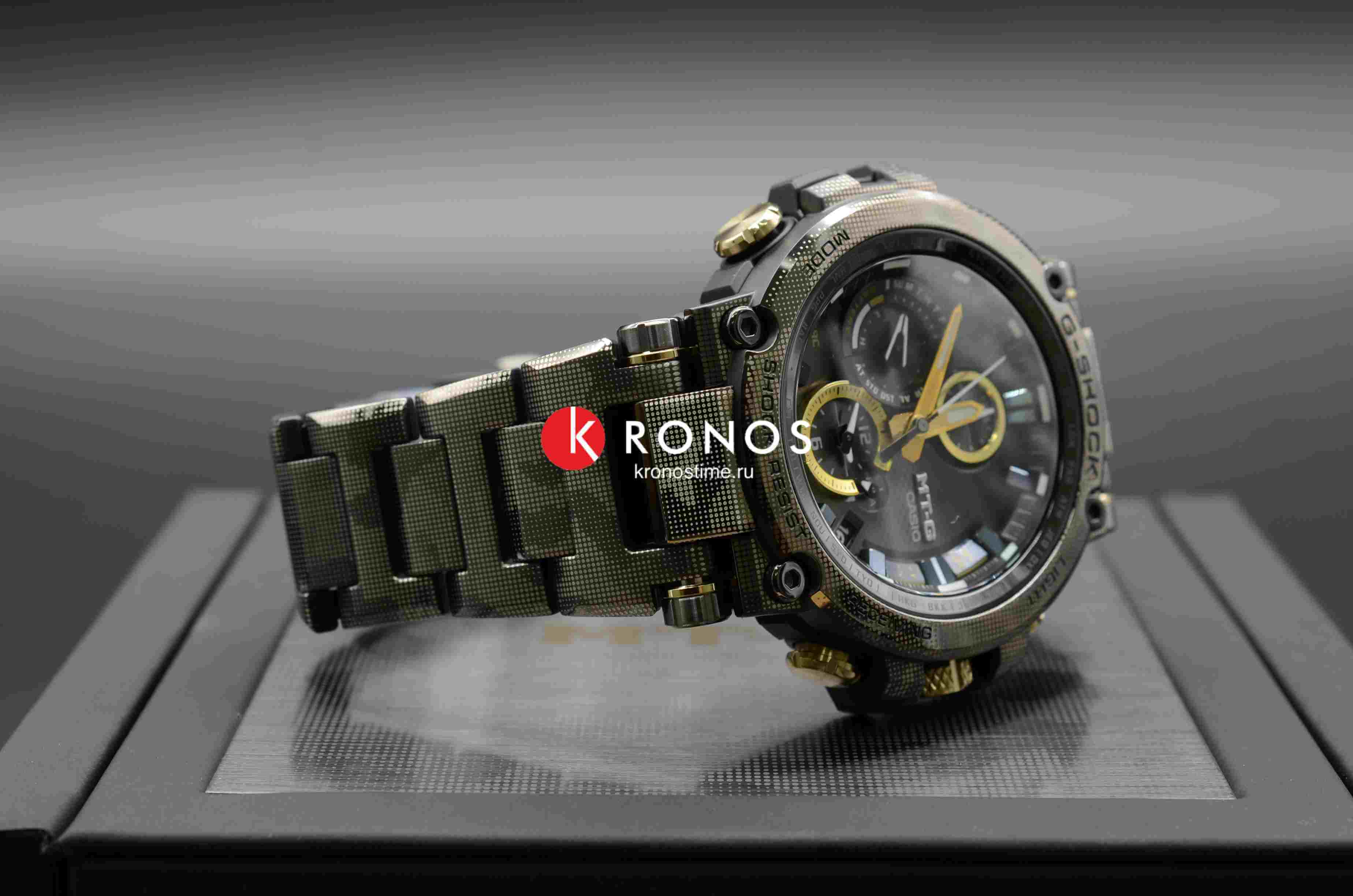 Часы привлекают эксклюзивным внешним видом, камуфляжный принт был нанесён с помощью современной лазерной технологии, работа осуществляется 3 «пискелями» разного диаметра. Традиционный для серии Casio MTG-1000 ударопрочный корпусУдаропрочный корпусМеханизм заключён в корпус, выполненный из современных материалов, устойчивых к ударам, механическим повреждениям и падению с высоты: инновационный пластик, карбон, нержавеющая сталь, титан. с ромбовидным рисунком циферблата дополнен золотистыми деталями. Он выполнен из нержавеющей стали 316L и полимера, дополнительную устойчивость к вибрации и перепадам температур придаёт слой геля Alpha Gel®. Композитный браслет из стали и полимерного материала. Технология . Светодиодная подсветкаСветодиодная подсветкаСветодиодная или LED-подсветка обеспечивает появление яркого холодного свечения за счёт LED-элементов - маленьких лампочек. Они потребляют минимальное количество энергии, чаще всего можно встретить 1 светодиод, в нижней части циферблата. циферблата, люминесцентная подсветкаЛюминесцентное покрытиеПозволяет считывать показания времени в темноте. Производители наносят на стрелки, часовые индексы, безель или поверхность циферблата светонакопительный состав, дающий холодное свечение. Neobrite. Сферическое сапфировое стекло. Надёжное IP-покрытиеIP-покрытиеМетод ионного напыления. Демонстрирует повышенную устойчивость к истиранию, окислению и химическим веществам. Под воздействием высокого давления и температуры около 1500°C молекулы металла надёжно соединяются с частицами корпуса часов.. Функции: BluetoothBluetoothСовременная технология, позволяющая синхронизировать часы с телефоном и переносить данные. Часы с Bluetooth расширяют возможности вашего смартфона и делают его использование ещё более удобным., приём радиосигнала, установление точного времени через синхронизацию с сервером, мировое времяМировое время Полезное часовое усложнение, отображающее время в основных городах и известных областях по всему миру, оно связано с часовыми поясами, удобно для путешественников и бизнесменов. , будильник, секундомер, автоматический календарь до 2099 года, таймер. Габариты: 55,8 x 51,7 x 14,4 мм.