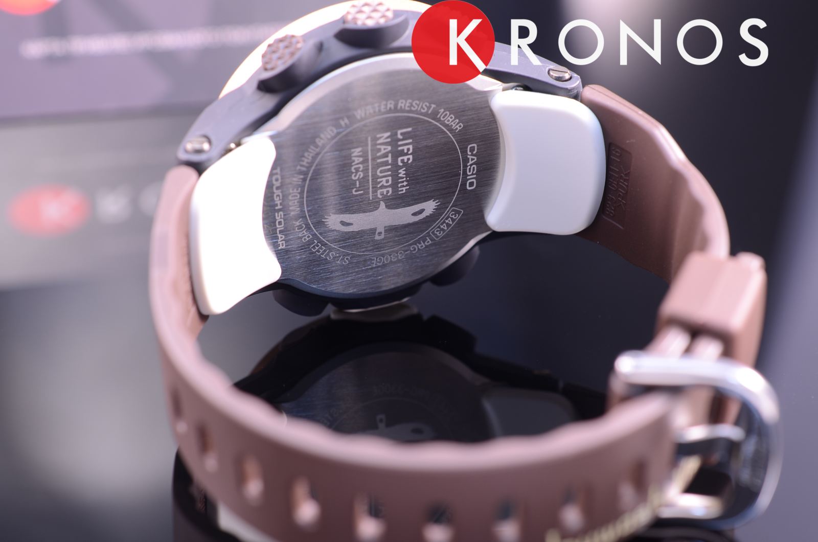 Лимитированная модель протрек из серии PRG-300 в круглом корпусе из стали и пластика отлично подойдут для путешествий, трекинга или хайкинга. Модель создана совместно с японской ассоциацией охраны природы и ее внешний вид призван напомнить перьевой окрас орла, именно эта птица сегодня находится на грани исчезновения в лесах Японии.