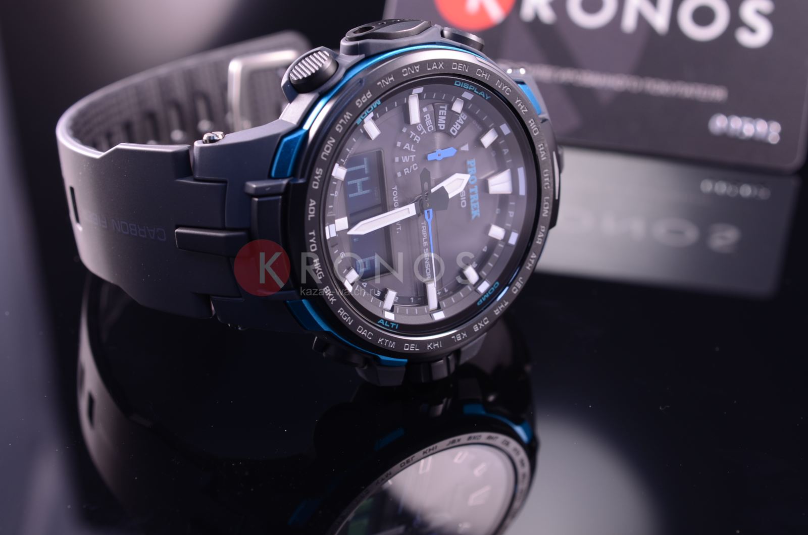 Флагманский аксессуар с аналого-цифровым дисплеем дополнен яркими голубыми деталями. Ни одна туристическая вылазка не обойдётся без этих часов, ведь они оснащены барометром, термометром -10°C /+60°C, альтиметром, цифровым компасом, хронографомХронографФункция позволяет измерять отрезки времени с особой точностью: часы, минуты, секунды. Верным признаком хронографа является наличие на циферблате 3 дополнительных окошек-счётчиков., таймером, функцией мирового времениМировое время Полезное часовое усложнение, отображающее время в основных городах и известных областях по всему миру, оно связано с часовыми поясами, удобно для путешественников и бизнесменов. – 29 часовых поясов и UTCUTCВсемирное кординационное время, не имеющее привязки к географическому положению Гринвича, основывается на атомном отсчёте времени. Регулировка времени осуществляется более точно, чем устаревшее GMT.