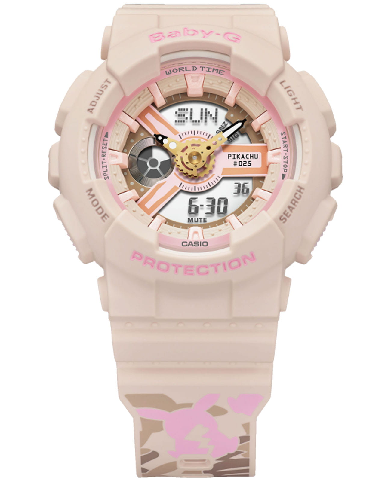 Модель пригодится для летних прогулок и вечеринок, стильно смотрится принт в виде Пикачу. С ним вы точно не останетесь незамеченной. Аксессуар наделит гардероб свежестью и яркостью, привлечёт к вам внимание окружающих. Наручные часы имеют противоударный корпусУдаропрочный корпусМеханизм заключён в корпус, выполненный из современных материалов, устойчивых к ударам, механическим повреждениям и падению с высоты: инновационный пластик, карбон, нержавеющая сталь, титан. из полимерного материала, что позволяет им быть устойчивыми к повреждениям, вибрации, падению с высоты. Японский кварцевый механизм работает от батарейки с 2-летним сроком службы, он позволяет измерять время с точностью хода +/- 30 секунд в месяц. Для защиты циферблата со светодиодной подсветкойСветодиодная подсветкаСветодиодная или LED-подсветка обеспечивает появление яркого холодного свечения за счёт LED-элементов - маленьких лампочек. Они потребляют минимальное количество энергии, чаще всего можно встретить 1 светодиод, в нижней части циферблата. используется минеральное стекло, устойчивое к образованию царапин. Водостойкость 10 бар позволяет не снимать аксессуар во время плавания. Полимерный ремешок отличается мягкостью и гибкостью. Возможности: включение и выключение звука кнопок, таймер обратного отсчёта, хронографХронографФункция позволяет измерять отрезки времени с особой точностью: часы, минуты, секунды. Верным признаком хронографа является наличие на циферблате 3 дополнительных окошек-счётчиков., секундомер, ежечасный сигнал, 5 будильников, вечный календарьВечный календарьКлассическое часовое усложнение, представляющее собой календарь, рассчитанный на несколько лет вперёд (стандартно – до 2099 года). Определяет текущую дату, день недели, месяц.. Габариты: 46,3 x 43,4 x 15,8 мм.