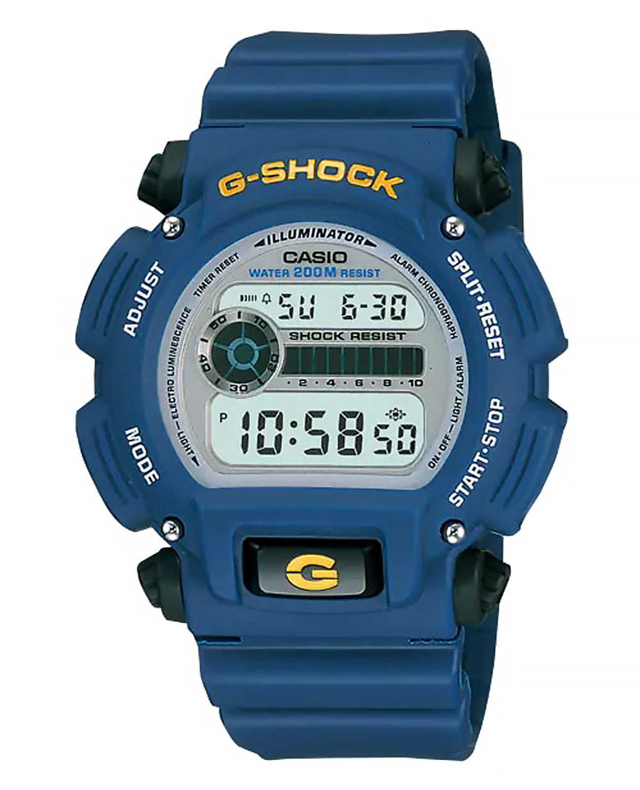 Многофункциональные, спортивные мужские часы Casio G-Shock DW-9052-2V, кварцевый механизм с высокой точностью. Класс водозащиты: 200 метров, позволит плавать, нырять и заниматься другими водными видами спорта. Корпус часов изготовлен из пластика синего цвета. Ударопрочный корпусУдаропрочный корпусМеханизм заключён в корпус, выполненный из современных материалов, устойчивых к ударам, механическим повреждениям и падению с высоты: инновационный пластик, карбон, нержавеющая сталь, титан. защищает механизм от ударов и вибрации. Электролюминесцентная подсветкаЭлектролюминесцентная подсветкаЭлектролюминесцентная панель устанавливается под ЖК-экраном часов, при нажатии кнопки электричество преобразуется в свет за счёт подачи напряжения на атомы фосфора, такой тип подсветки позволяет освещать весь циферблат. освещает весь циферблат, после отпускания кнопки свечение продолжается еще некоторое время. СекундомерСекундомерСекундоме́р — прибор, способный измерять интервалы времени с точностью до долей секунды. с точностью показаний 1/100 сек и максимальным временем измерения 1 час. 3 ежедневных будильникаБудильникБуди́льник — часы, в заданный момент времени подающие звуковой, световой и/или в редких случаях другой сигнал..