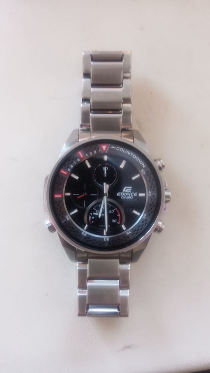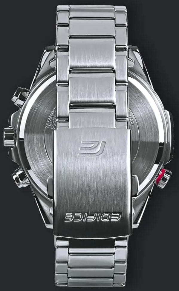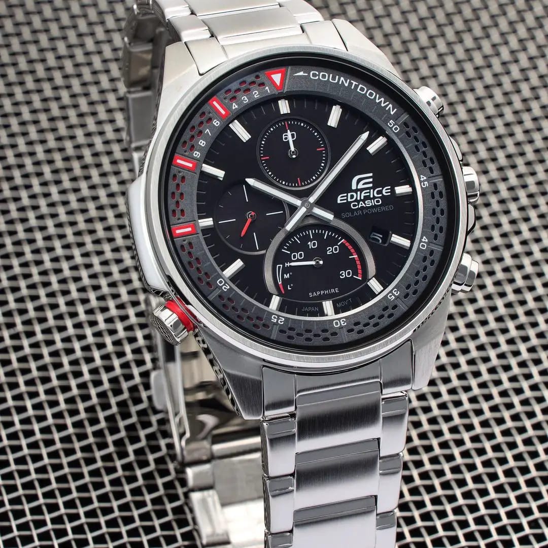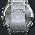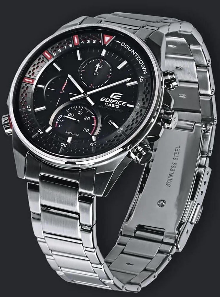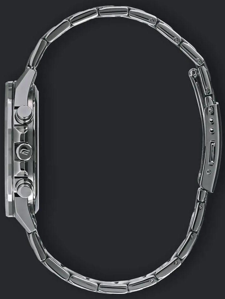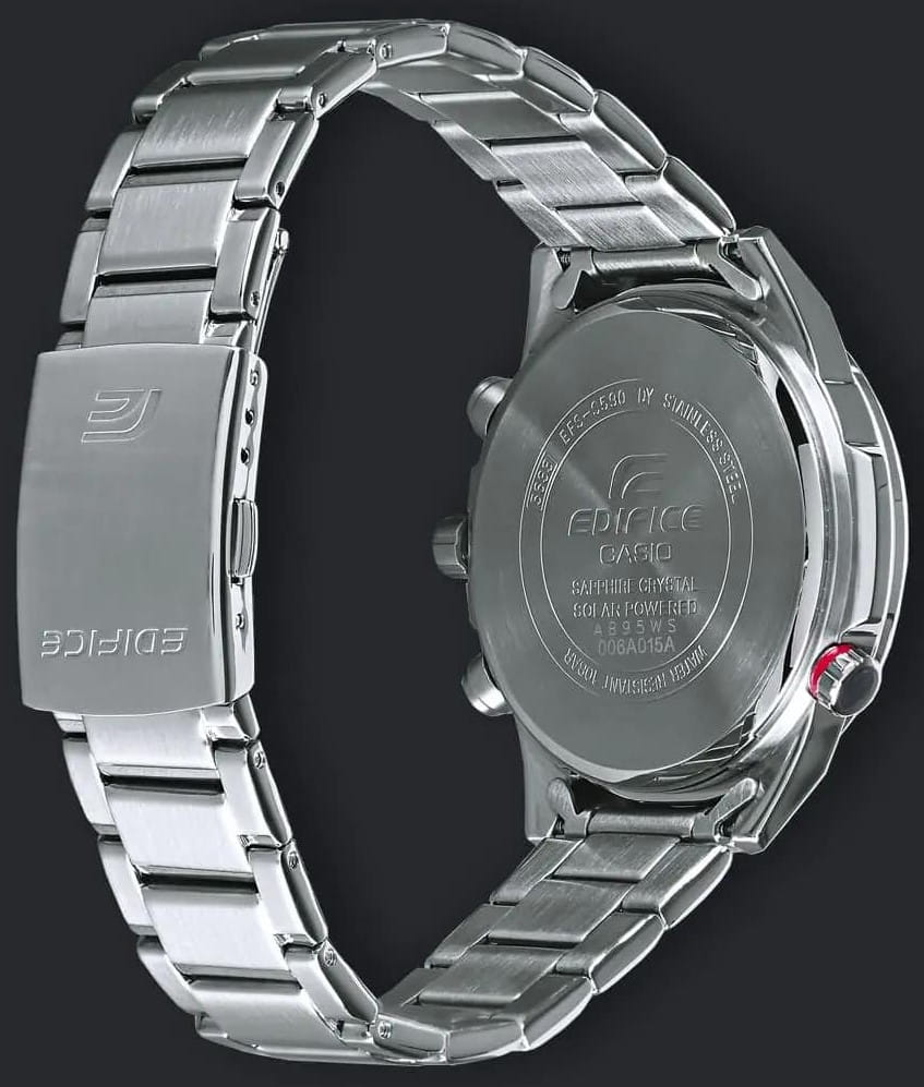 Спортивные мужские часы на солнечной батарее c хронографомХронографФункция позволяет измерять отрезки времени с особой точностью: часы, минуты, секунды. Верным признаком хронографа является наличие на циферблате 3 дополнительных окошек-счётчиков. Casio Edifice EFS-S590D-1A, кварцевый механизм с высокой точностью. Сапфировое стеклоСапфировое стеклоПрочный и надёжный материал из кристалла сапфира синтетического происхождения, характеризующийся особой твёрдостью и устойчивостью к царапинам и повреждениям. устойчивое к появлению царапин, обладающее высокой прозрачностью. Класс водозащиты: 100 метров, позволит плавать, нырять и заниматься другими водными видами спорта. Корпус часов изготовлен из стали. Литой стальной браслет на раскладной застёжкеРаскладная застёжкаТакой тип застёжки используется только на браслетах из металла. Она никогда не раскрывается полностью, происходит разделение на 2 и более частей. Раскладывающая застёжка снизит вероятность потери часов к минимуму., расстегиваемая одним касанием. Время работы аккумулятора без подзарядки - 6 месяцев. Подсветка NeobriteПодсветка NeobriteИспользование светонакопительных составов на основе сульфида цинка или алюмината стронция, яркий свет можно наблюдать на протяжении 6-10 часов после «зарядки» часов около источника света. обеспечивает длительное послесвечение в темноте даже после кратковременного нахождения на свету. Часы-хронографХронографФункция позволяет измерять отрезки времени с особой точностью: часы, минуты, секунды. Верным признаком хронографа является наличие на циферблате 3 дополнительных окошек-счётчиков.  с секундомеромСекундомерСекундоме́р — прибор, способный измерять интервалы времени с точностью до долей секунды. точностью 1с и временем измерения 30мин. Ретроградный указатель минутной стрелки хронографаХронографФункция позволяет измерять отрезки времени с особой точностью: часы, минуты, секунды. Верным признаком хронографа является наличие на циферблате 3 дополнительных окошек-счётчиков.. Вращающийся внутренний безельБезельВнешний ободок, закрепляющий стекло. В спортивных часах так называется поворотное кольцо с делениями на циферблате, выполняет роль таймера – замеряет отрезки времени на шкале. Неподвижный безель – элемент декора. Однонаправленно вращающийся безель на дайверских часах позволяет фиксировать моменты погружения и выныривания на поверхность. со шкалой обратного отсчета. Метки в виде штрихов. Окошко даты находится в положении 4 часа. Заводная головка с защитой. Водонепроницаемость в соответствии с ISO 2281. Предохранительная защелка на браслете препятствует случайному расстегиванию.