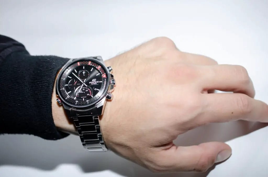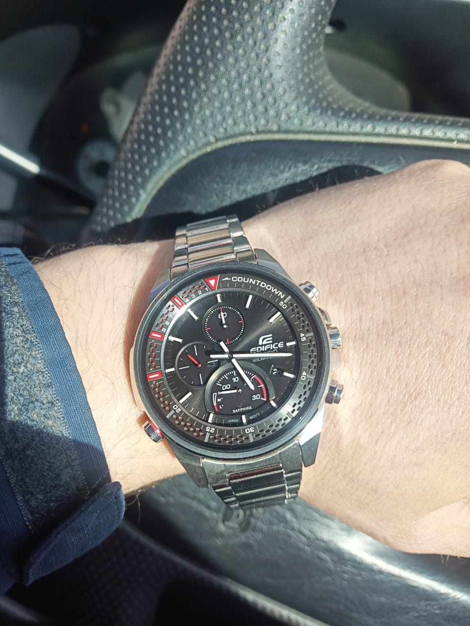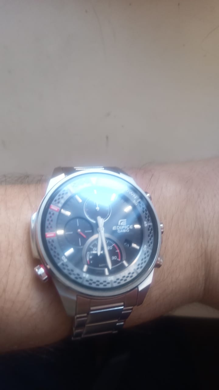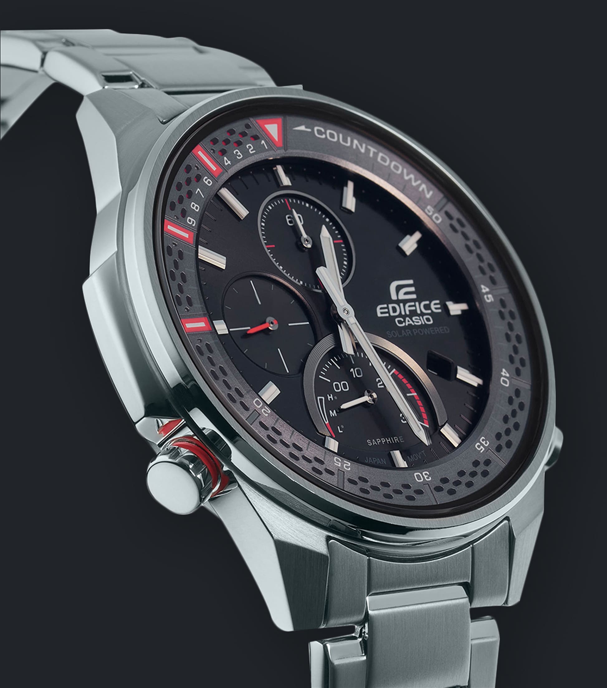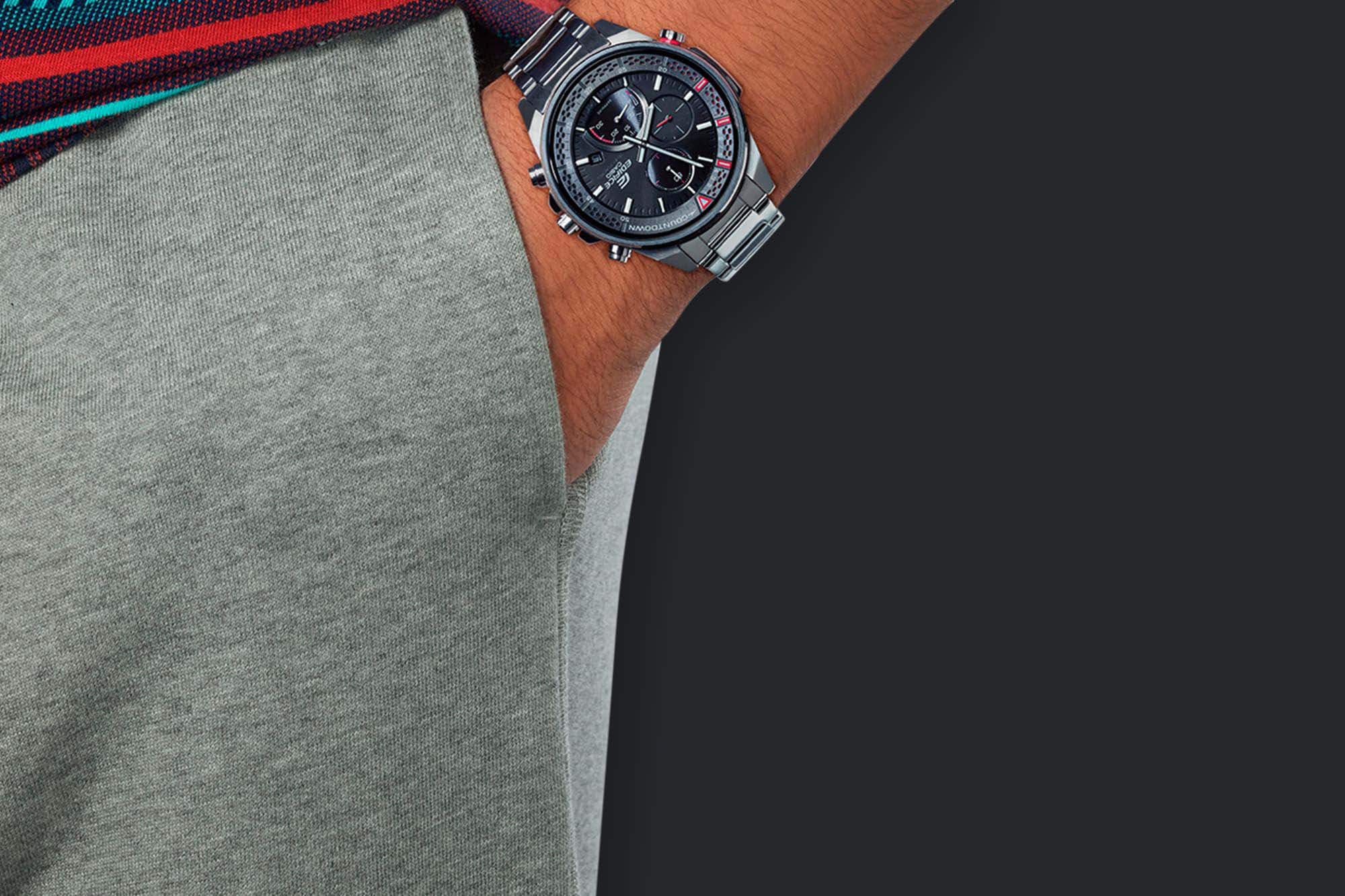 Спортивные мужские часы на солнечной батарее c хронографомХронографФункция позволяет измерять отрезки времени с особой точностью: часы, минуты, секунды. Верным признаком хронографа является наличие на циферблате 3 дополнительных окошек-счётчиков. Casio Edifice EFS-S590D-1A, кварцевый механизм с высокой точностью. Сапфировое стеклоСапфировое стеклоПрочный и надёжный материал из кристалла сапфира синтетического происхождения, характеризующийся особой твёрдостью и устойчивостью к царапинам и повреждениям. устойчивое к появлению царапин, обладающее высокой прозрачностью. Класс водозащиты: 100 метров, позволит плавать, нырять и заниматься другими водными видами спорта. Корпус часов изготовлен из стали. Литой стальной браслет на раскладной застёжкеРаскладная застёжкаТакой тип застёжки используется только на браслетах из металла. Она никогда не раскрывается полностью, происходит разделение на 2 и более частей. Раскладывающая застёжка снизит вероятность потери часов к минимуму., расстегиваемая одним касанием. Время работы аккумулятора без подзарядки - 6 месяцев. Подсветка NeobriteПодсветка NeobriteИспользование светонакопительных составов на основе сульфида цинка или алюмината стронция, яркий свет можно наблюдать на протяжении 6-10 часов после «зарядки» часов около источника света. обеспечивает длительное послесвечение в темноте даже после кратковременного нахождения на свету. Часы-хронографХронографФункция позволяет измерять отрезки времени с особой точностью: часы, минуты, секунды. Верным признаком хронографа является наличие на циферблате 3 дополнительных окошек-счётчиков.  с секундомеромСекундомерСекундоме́р — прибор, способный измерять интервалы времени с точностью до долей секунды. точностью 1с и временем измерения 30мин. Ретроградный указатель минутной стрелки хронографаХронографФункция позволяет измерять отрезки времени с особой точностью: часы, минуты, секунды. Верным признаком хронографа является наличие на циферблате 3 дополнительных окошек-счётчиков.. Вращающийся внутренний безельБезельВнешний ободок, закрепляющий стекло. В спортивных часах так называется поворотное кольцо с делениями на циферблате, выполняет роль таймера – замеряет отрезки времени на шкале. Неподвижный безель – элемент декора. Однонаправленно вращающийся безель на дайверских часах позволяет фиксировать моменты погружения и выныривания на поверхность. со шкалой обратного отсчета. Метки в виде штрихов. Окошко даты находится в положении 4 часа. Заводная головка с защитой. Водонепроницаемость в соответствии с ISO 2281. Предохранительная защелка на браслете препятствует случайному расстегиванию.