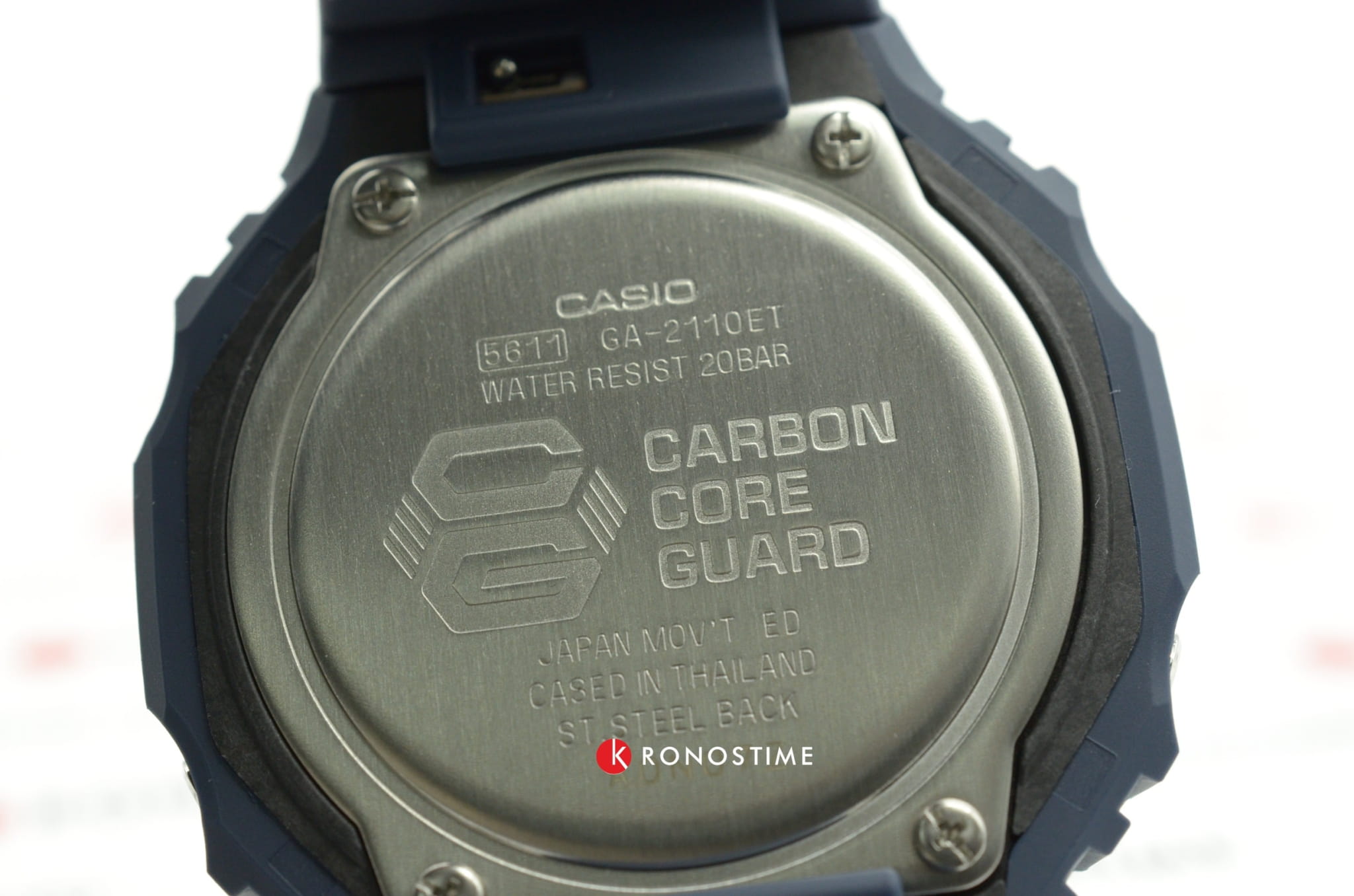 Мужские японские часы Casio G-Shock GA-2110ET-2AER из коллекции обрадуют ценителей надёжности и оригинальных вещей. Аксессуар в синем цвете поможет дополнить повседневный образ. Внимание перенимает на себя безельБезельВнешний ободок, закрепляющий стекло. В спортивных часах так называется поворотное кольцо с делениями на циферблате, выполняет роль таймера – замеряет отрезки времени на шкале. Неподвижный безель – элемент декора. Однонаправленно вращающийся безель на дайверских часах позволяет фиксировать моменты погружения и выныривания на поверхность., выполненный в форме октагона. Благодаря конструкции Carbon Core GuardCarbon Core Guard Новейшая структура корпуса, разработанная Casio. Полиуретановая пластина дополнительно усилена карбоновыми вставками, что придаёт специальную защиту от механических повреждений. Карбон отличается лёгкостью и прочностью. для тонкого ударопрочного корпусаУдаропрочный корпусМеханизм заключён в корпус, выполненный из современных материалов, устойчивых к ударам, механическим повреждениям и падению с высоты: инновационный пластик, карбон, нержавеющая сталь, титан. (11,8 мм) часы получили невероятную лёгкость, повышенную устойчивость к падению, повреждениям. Обновлённое крепление полимерного ремешка позволяет менять его в считанные секунды. Японский кварцевый механизм получает энергию от батарейки, рассчитанной на 3 года работы. ЛюминесцентнаяЛюминесцентное покрытиеПозволяет считывать показания времени в темноте. Производители наносят на стрелки, часовые индексы, безель или поверхность циферблата светонакопительный состав, дающий холодное свечение. и светодиодная подсветкаСветодиодная подсветкаСветодиодная или LED-подсветка обеспечивает появление яркого холодного свечения за счёт LED-элементов - маленьких лампочек. Они потребляют минимальное количество энергии, чаще всего можно встретить 1 светодиод, в нижней части циферблата.. Минеральное стекло. Сохранение водонепроницаемости до 10 бар. Будильник, хронографХронографФункция позволяет измерять отрезки времени с особой точностью: часы, минуты, секунды. Верным признаком хронографа является наличие на циферблате 3 дополнительных окошек-счётчиков., таймер, мировое времяМировое время Полезное часовое усложнение, отображающее время в основных городах и известных областях по всему миру, оно связано с часовыми поясами, удобно для путешественников и бизнесменов. , секундомер, вечный календарьВечный календарьКлассическое часовое усложнение, представляющее собой календарь, рассчитанный на несколько лет вперёд (стандартно – до 2099 года). Определяет текущую дату, день недели, месяц.. Габариты: 48,5 x 45,4 x 11,8 мм.