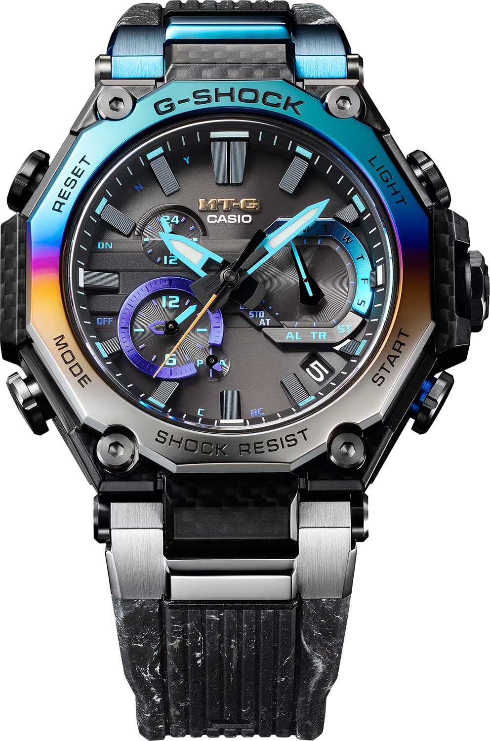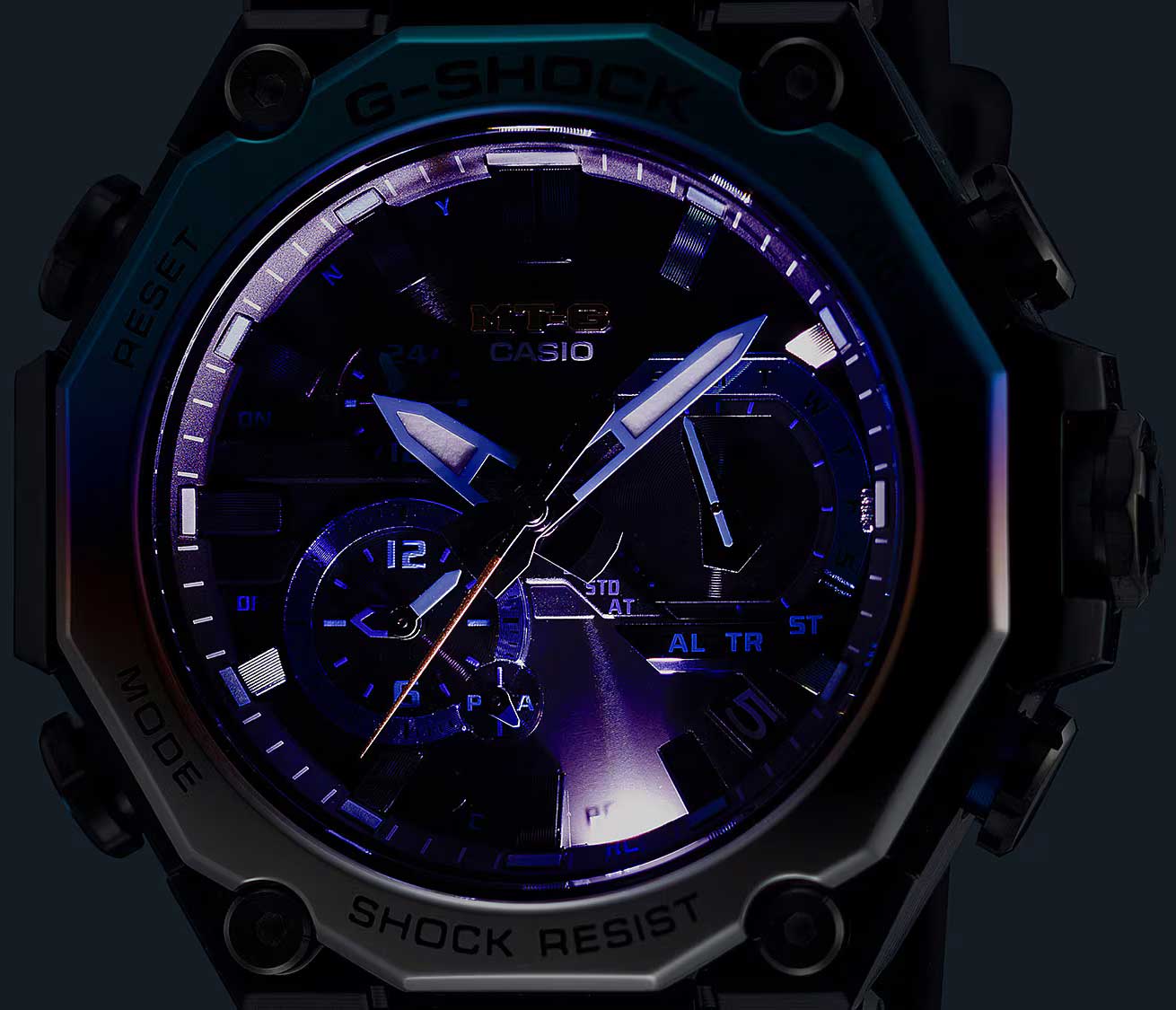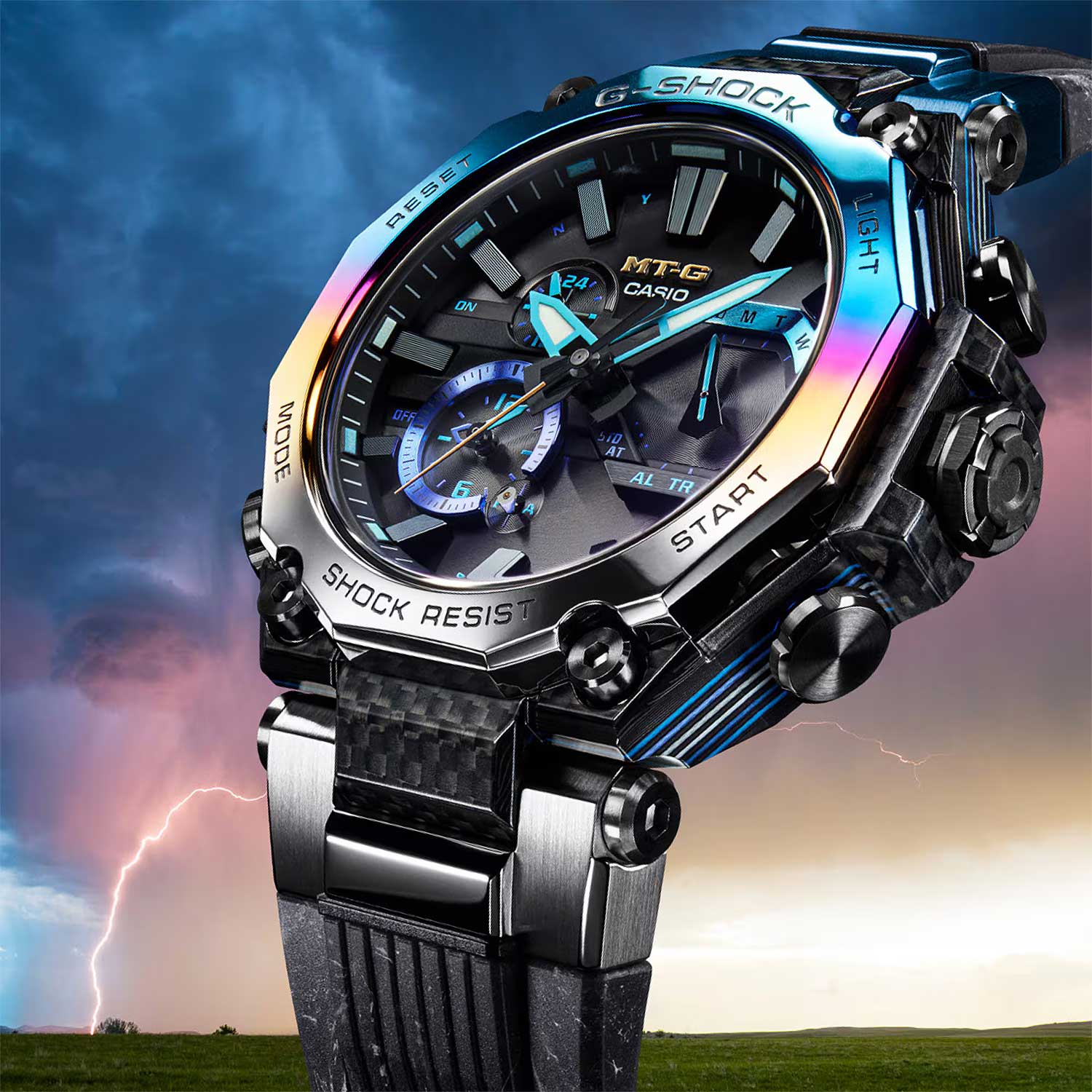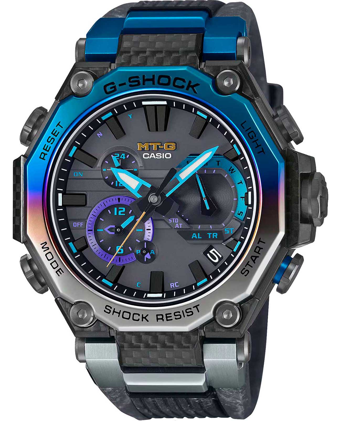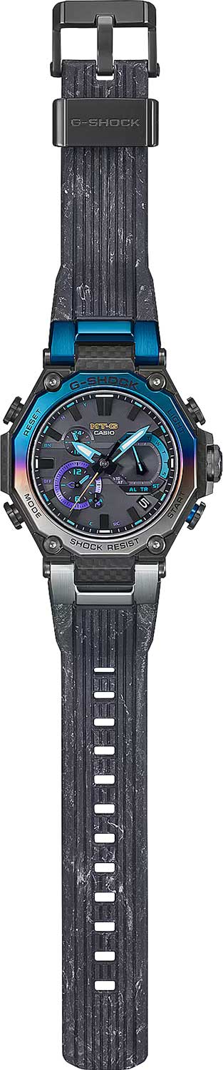Мужские кварцевые часы Casio MTG-B2000YST-1A — это экстремальный аксессуар, вдохновлённый охотниками за штормами и созданный для самых суровых условий. Модель собрана исключительно в Японии на производстве Casio в Ямагата, что гарантирует высочайшее качество исполнения. Корпус выполнен из стали с IP-покрытиемIP-покрытиеМетод ионного напыления. Демонстрирует повышенную устойчивость к истиранию, окислению и химическим веществам. Под воздействием высокого давления и температуры около 1500°C молекулы металла надёжно соединяются с частицами корпуса часов. и карбонового материала, а его дизайн напоминает цвет неба перед бурей. Защиту механизма обеспечивает система Triple G Resist — тройная защита от ударов, центробежных сил и вибраций. Дополнительно используется двухкомпонентная система Dual Core Guard, состоящая из Carbon Core GuardCarbon Core Guard Новейшая структура корпуса, разработанная Casio. Полиуретановая пластина дополнительно усилена карбоновыми вставками, что придаёт специальную защиту от механических повреждений. Карбон отличается лёгкостью и прочностью. и Metal Core Guard, обеспечивающая максимальную устойчивость к повреждениям. Часы работают от солнечной энергии благодаря технологии Tough SolarTough SolarТехнология основана на подзарядке аккумулятора от источника солнечного света, специальная панель улавливает солнечные лучи и преобразует их в энергию для работы часов. Достаточно пары минут нахождения на солнце для функционирования часов в течении суток., а индикатор заряда батареи позволяет контролировать уровень энергии. Время работы при нормальном использовании без подзарядки — до 5 месяцев, при включённой функции энергосбережения — до 29 месяцев. Стрелки автоматически корректируются каждые 60 минут, если их положение изменяется. Циферблат черного цвета с метками в виде штрихов защищён сапфировым стекломСапфировое стеклоПрочный и надёжный материал из кристалла сапфира синтетического происхождения, характеризующийся особой твёрдостью и устойчивостью к царапинам и повреждениям. с антибликовым покрытиемАнтибликовое покрытиеСлой оксида металла в 0,13-0,3 микрон, благодаря которому стекло часов не бликует и не отражает свет. Антибликовое покрытие уменьшает отражение света в 10 раз, обеспечивая отличную читаемость показателей циферблата., устойчивым к царапинам. Подсветка выполнена по технологии NeobriteПодсветка NeobriteИспользование светонакопительных составов на основе сульфида цинка или алюмината стронция, яркий свет можно наблюдать на протяжении 6-10 часов после «зарядки» часов около источника света., обеспечивающей длительное послесвечение даже после кратковременного нахождения на свету. Светодиодная подсветка (Super Illuminator) освещает весь циферблат, после отпускания кнопки свечение продолжается ещё некоторое время. Функциональность модели включает секундомер с точностью 1 секунда и временем измерения до 24 часов, SPLIT-хронограф, таймер обратного отсчёта от 1 минуты до 24 часов, второй часовой пояс, мировое время (27 часовых поясов) и автоматический переход на летнее время. Система Multi Band 6 принимает сигналы от шести радиостанций в разных частях мира: Германия, Англия, США, Япония, Китай — обеспечивая точное время практически по всему миру. Система Smart Access позволяет управлять функциями через электронную заводную головку: поворот или нажатие — переключение ре