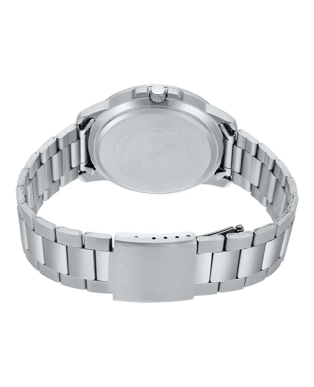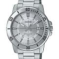 Японские мужские кварцевые часы с минеральным стекломМинеральное стеклоМинеральное стекло представляет собой искусственно выращенный минерал кварца. Такое стекло отличается особой устойчивостью к повреждениям и царапинам. Уступает по некоторым качествам сапфировому стеклу. Casio Collection MTP-VD01D-7CV, кварцевый механизм с высокой точностью. Корпус и браслет часов изготовлен из нержавеющей стали. 12-ти и 24-х часовой формат времени. Циферблат с метками в виде штрихов выполнен по технологии Sunray (солнечные лучи). Стрелки с люминесцентным покрытиемЛюминесцентное покрытиеПозволяет считывать показания времени в темноте. Производители наносят на стрелки, часовые индексы, безель или поверхность циферблата светонакопительный состав, дающий холодное свечение.. Окошко даты находится в положении 3 часа. Заводная головка с защитой. Батарея рассчитана на 3 года. Класс водозащиты: 50 метров, позволит защитить корпус от случайных брызг или капель дождя. Стальной браслет на раскладной застёжкеРаскладная застёжкаТакой тип застёжки используется только на браслетах из металла. Она никогда не раскрывается полностью, происходит разделение на 2 и более частей. Раскладывающая застёжка снизит вероятность потери часов к минимуму..