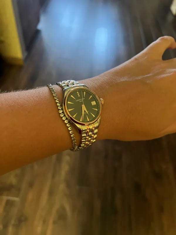Аксессуар обладает изящным силуэтом, отражающим классический стиль и элегантность. Циферблат украшен 3 роскошными бриллиантами оттенка Top Wesselton. Часы комплектуются высокоточным кварцевым калибром F06.411 от швейцарской компании ETA, высокая точность механизма подтверждается сертификатом хронометра COSCСертификат COSCОфициальный сертификат, подтверждающий то, что часы ходят с особо высокой точностью. Для получения документа часы подвергаются тестовым испытаниям, разработанным швейцарским институтом тестирования хронометров COSC. Допустимая норма для механических часов -4/+6 секунд в день, для кварцевых моделей +/- 0,07 секунд в день.. Концепция DS ConceptDS ConceptDouble Security Concept, обозначает двойную надёжность и безупречную точность часов Certina. Двойная система защиты подразумевает обеспечение максимальной устойчивости к ударам и высоких показателей водонепроницаемости. гарантирует повышенную ударопрочность часов и сохранение водонепроницаемости до 20 бар. Одностороннее антибликовое покрытие сапфирового стекла.Корпус и браслет из хирургической стали 316L. PVD-покрытиеPVDУльтратонкое покрытие наносится в технике вакуумного напыления, сочетает в себе нитрид титана особой прочности со слоем золота или оксида хрома. Несёт в себе декоративную или защитную функцию. цвета розового золота. . Окошко даты, функция EOLEOLПредставляет собой систему, уведомляющую владельца часов о необходимости замены элемента питания. За 2 недели до полного разряда батарейки секундная стрелка перестаёт ходить чётко и начинает перепрыгивать на 3-4 деления.. Диаметр корпуса: 33,8 мм.